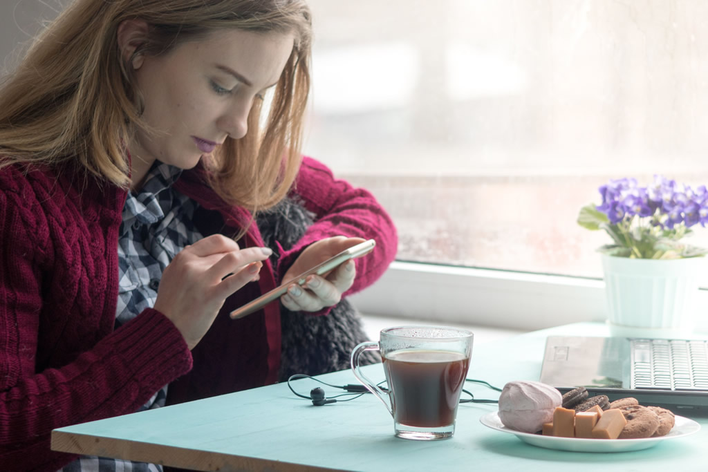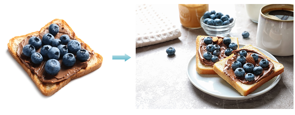 次の写真の例のように、ブルーベリーがのった食パン単体を撮影するよりもコーヒーカップやお皿、ナプキンといった小道具類を利用した方がぐっと美味しそうに見えます。