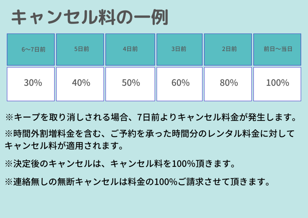 撮影日のスケジュール変更など諸事情によりキャンセルすることがあるでしょう。予約したスタジオを利用しなかった場合は、キャンセル料が発生します。