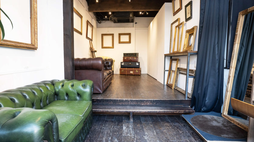 Cスタジオは、画廊をイメージしたスタジオです。吹き抜けを利用した撮影が可能で、日中・夜間で異なった雰囲気の撮影もできます。白を基調としているので、アンティークがよく映える仕様となっています。