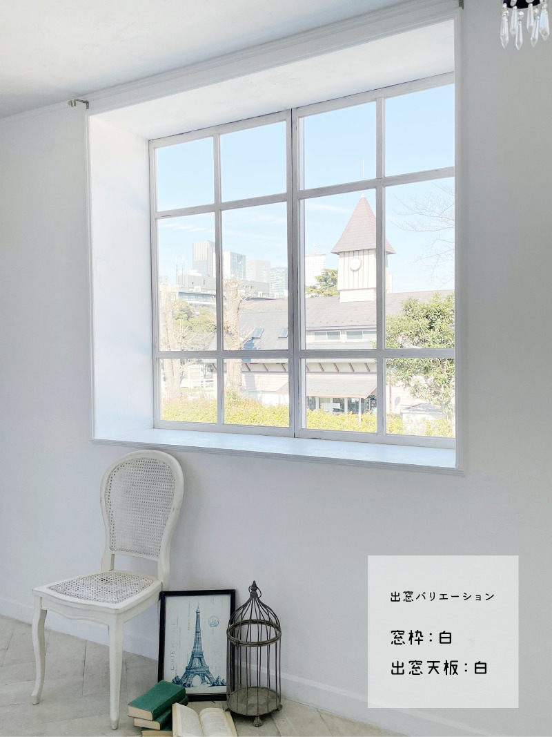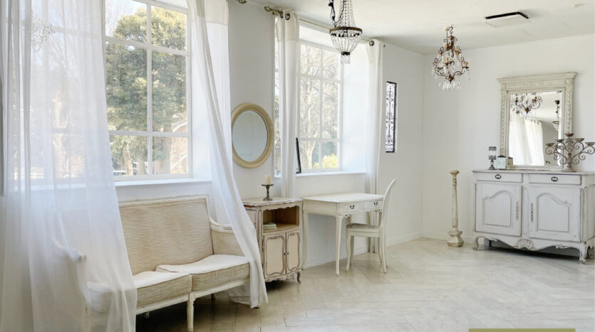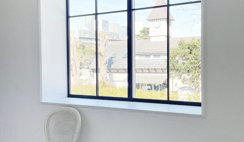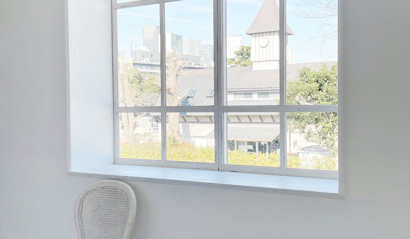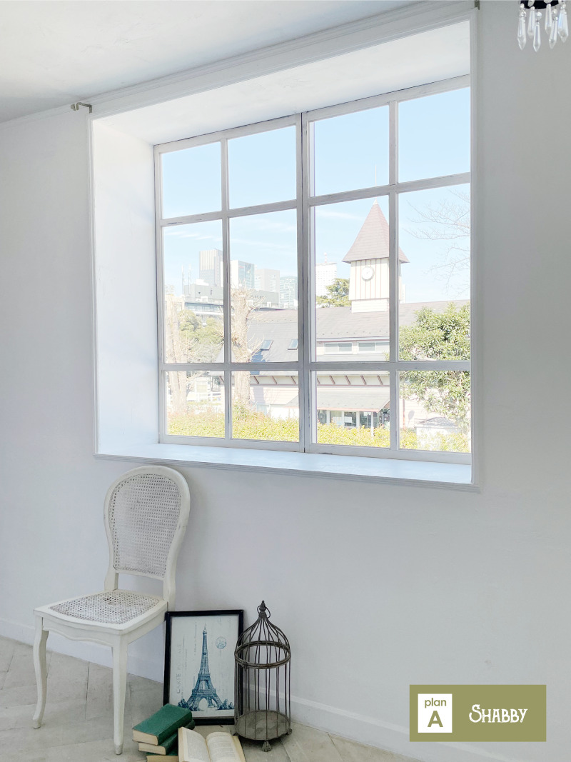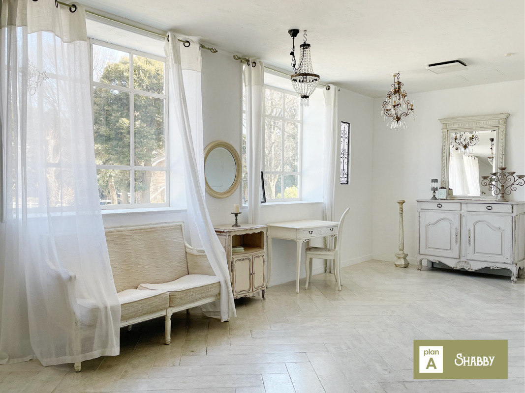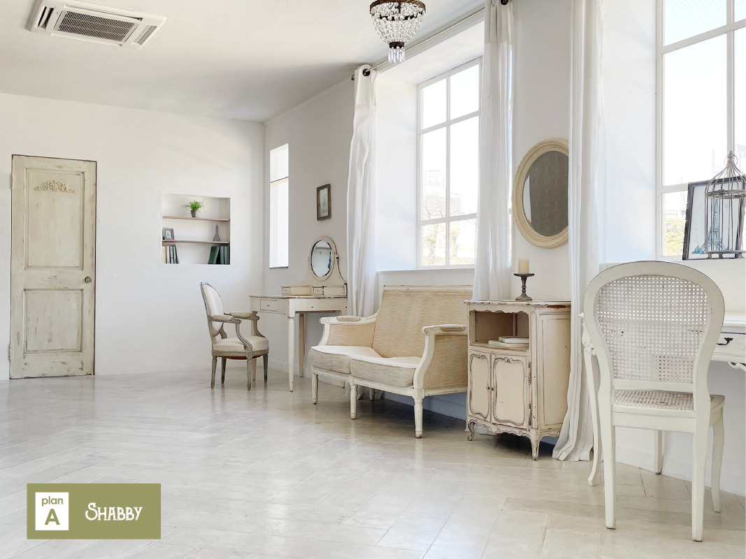 スタジオはホワイトを基調とした空間で、そこに置かれる家具は、シャビーシックな家具が置かれる【プランA:シャビー】と、トレンドの北欧風家具が置かれる【プランB:北欧風】から選択が可能です。撮影イメージにより家具のプランを選択し、空間を彩ることができます。広くとられた出窓からは神宮の森が見え、やわらかな光が入ります。出窓は窓枠や天板を変更し、バリエーションを出すこともできます。