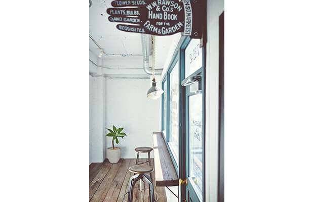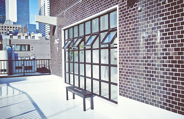 カフェ風のスペースには木材の床、大きなスクエアの窓、丸椅子が設置されていて、このエリアではカフェ店内風の撮影も可能です。新宿のビルを一望できるテラスもご利用いただけます。