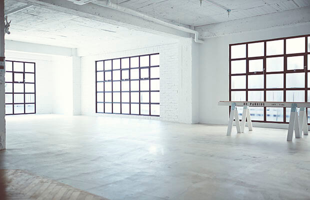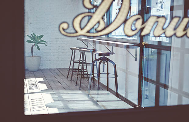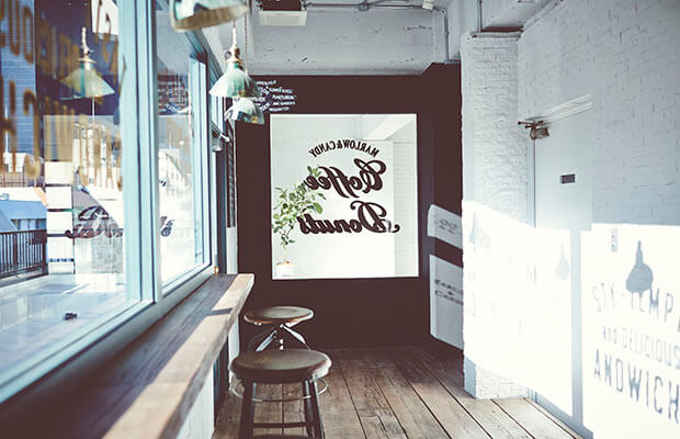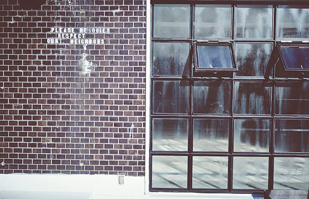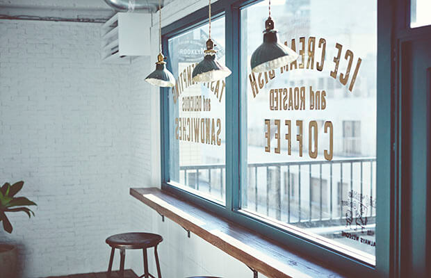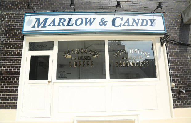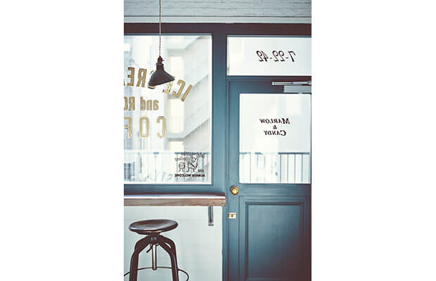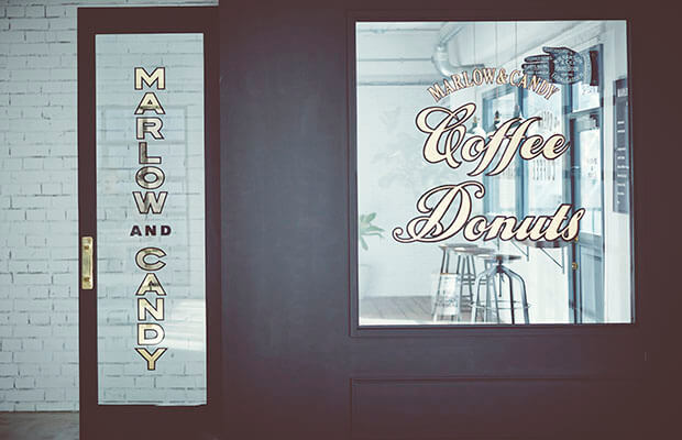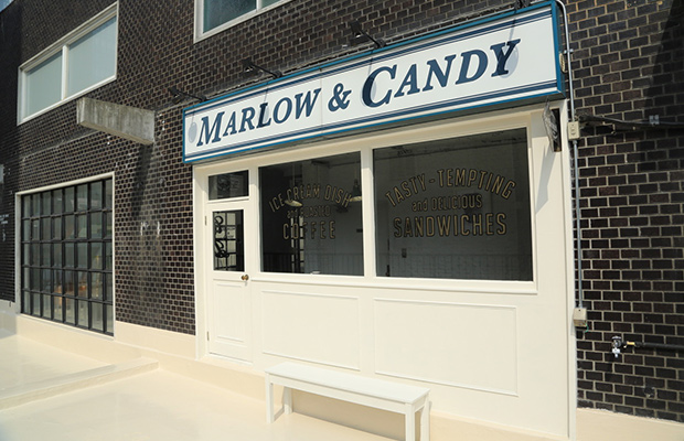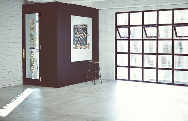 「MARLOW &CANDY」のロゴとレンガの外観が印象的な外国風撮影スタジオです。ホワイトの扉が映える、オシャレなデザイン。自然光が差し込む平坦で広々としたスペースとアメリカンなカフェを想像させるスペースが併設された内装です。ホワイトの壁と大きな鉄窓が特徴的。レイアウトによって、さまざまなバリエーションで撮影ができます。