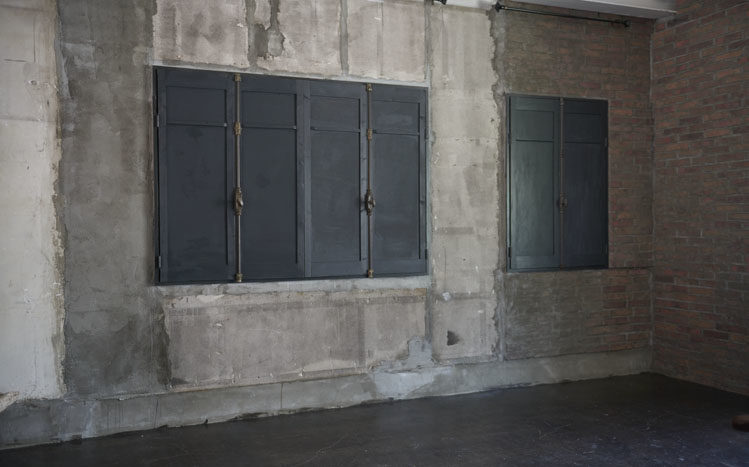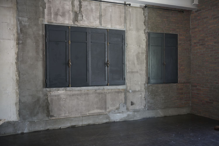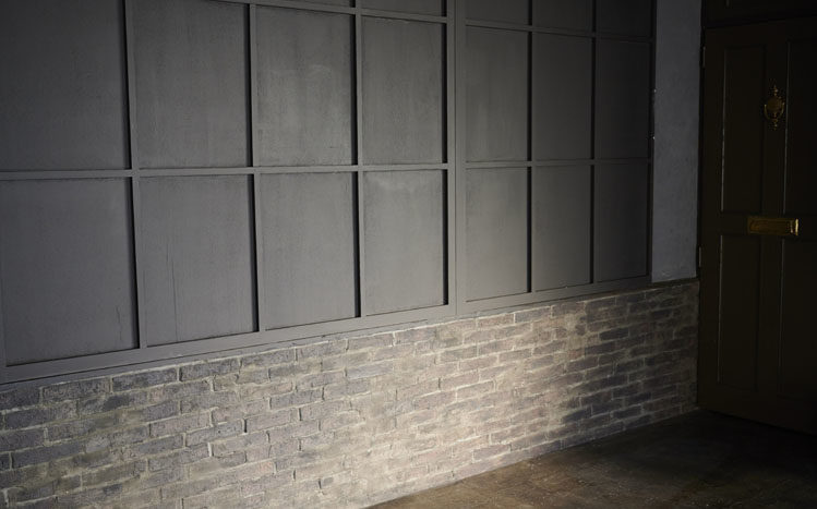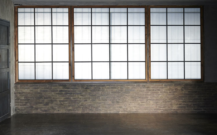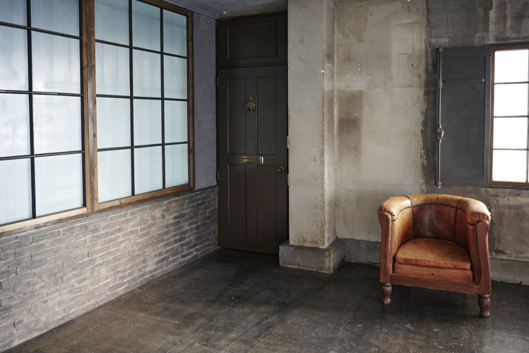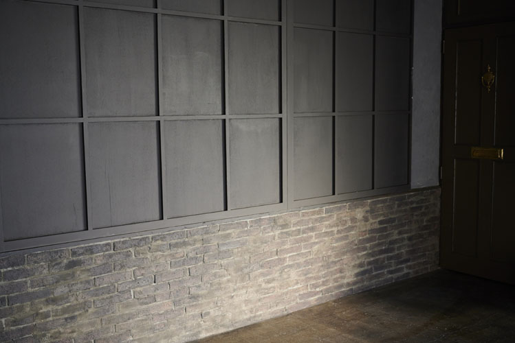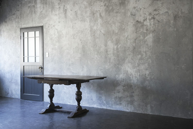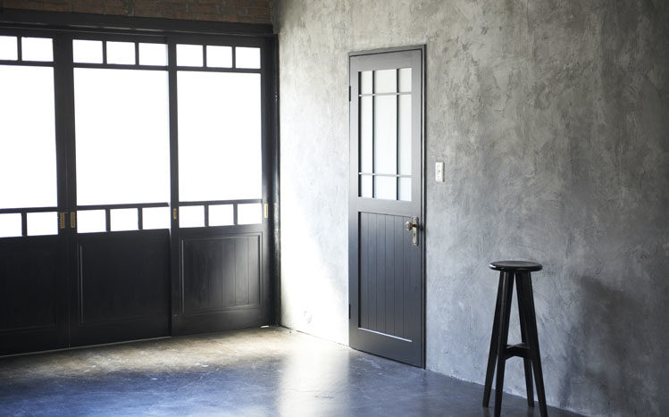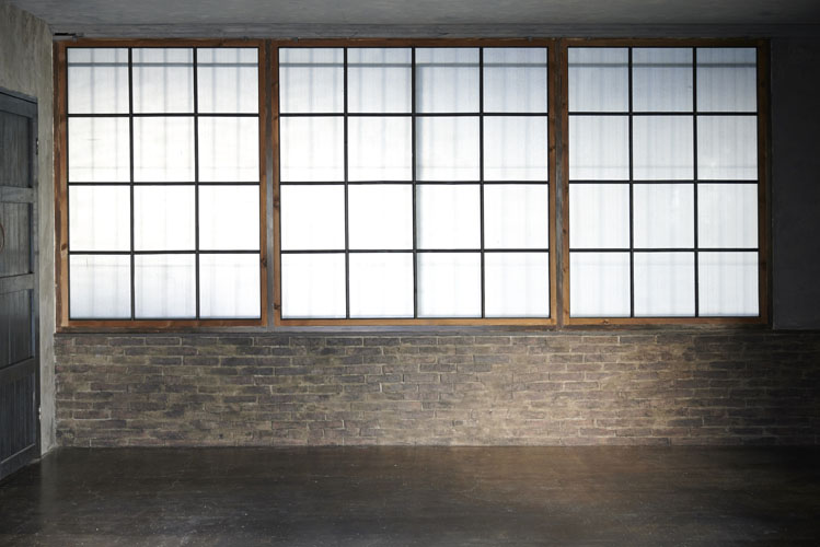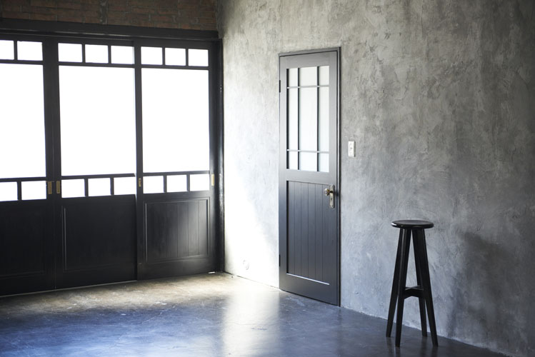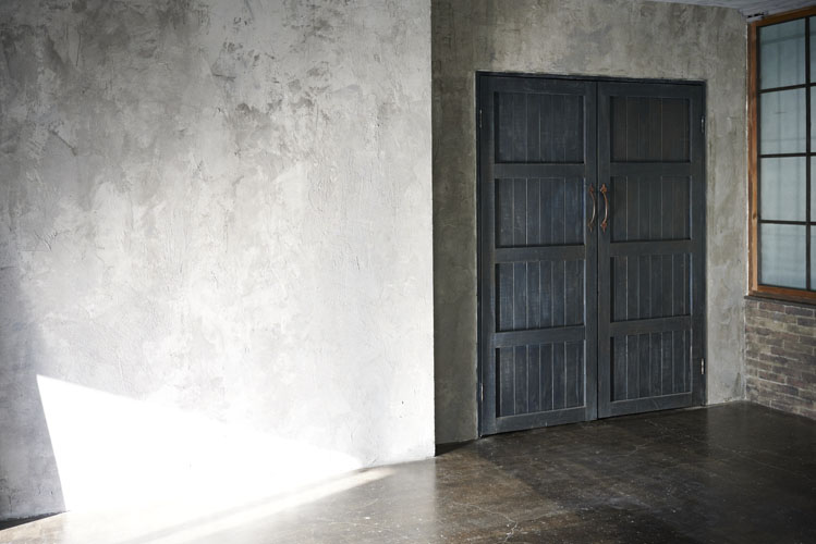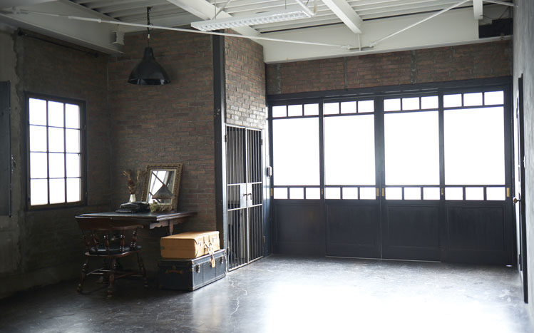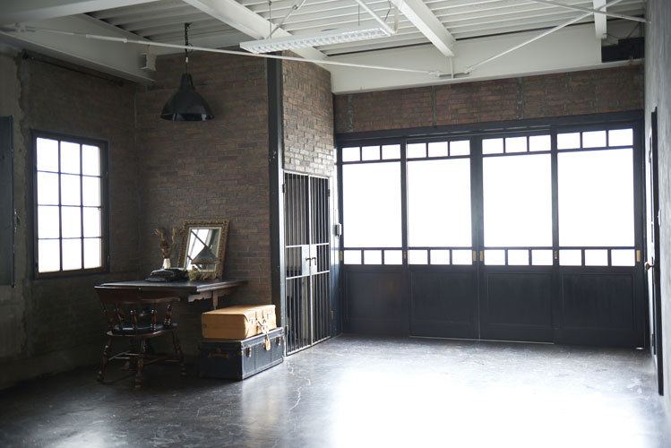床は亀裂が入ったデザインになっていて、スタジオの雰囲気がより一層引き立てられます。大きな格子窓も設置されていて、これにグレーやブラックの壁をはめ込むことができる仕様となっています。撮影時に光を制限したいときなどにご活用ください。さらに、グレモン錠のある窓やアイアンの扉、木製のブラックな扉も特徴的です。