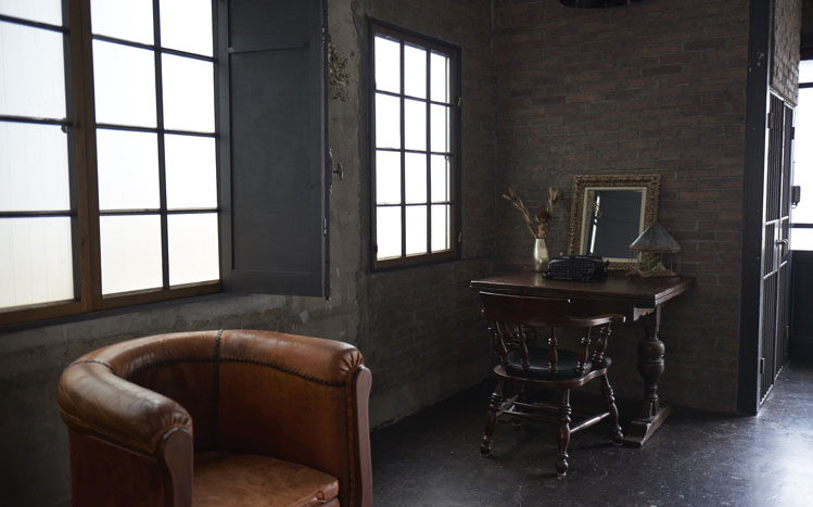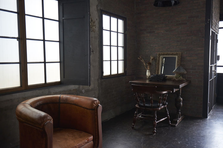 暗めのカラーでそろえた内装ではありますが、窓も多く外からの自然光も十分に入る構造なので、暗すぎず重たくなりすぎない雰囲気で撮影ができます。壁は、グレー調、レンガ、コンクリートなど、さまざまなテイストを取り入れています。