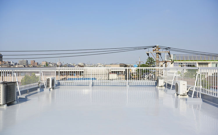 ガーデンスペースは石畳や植物でおしゃれな空間づくりがされています。広々とした屋上も利用可能。メイクルームは個室になっていて、ライト付きのミラーやエアコンも完備。窮屈にならないスペースが確保されています。