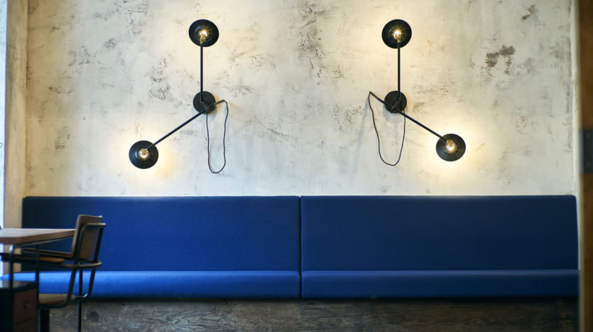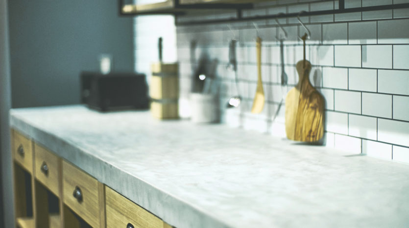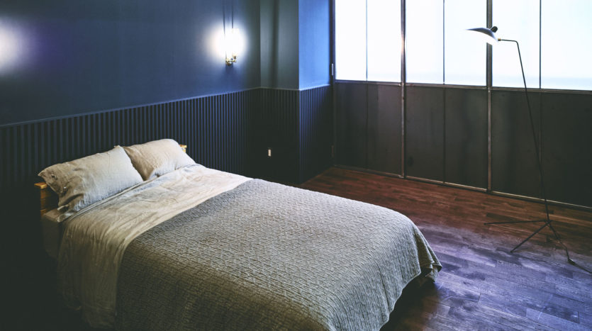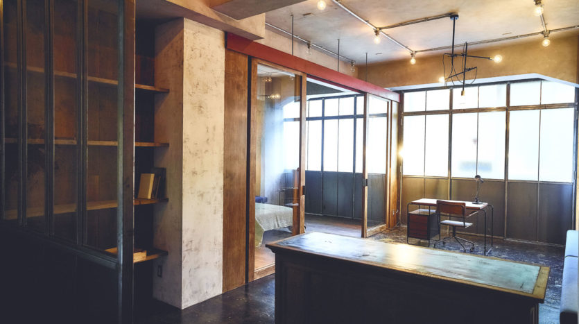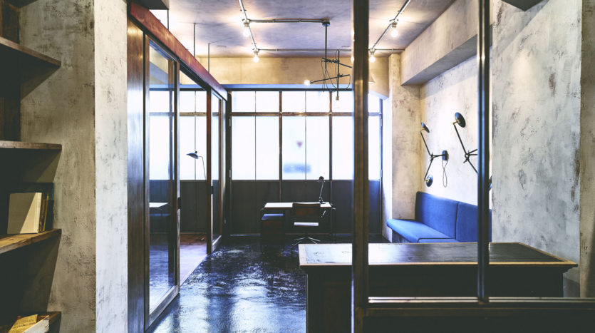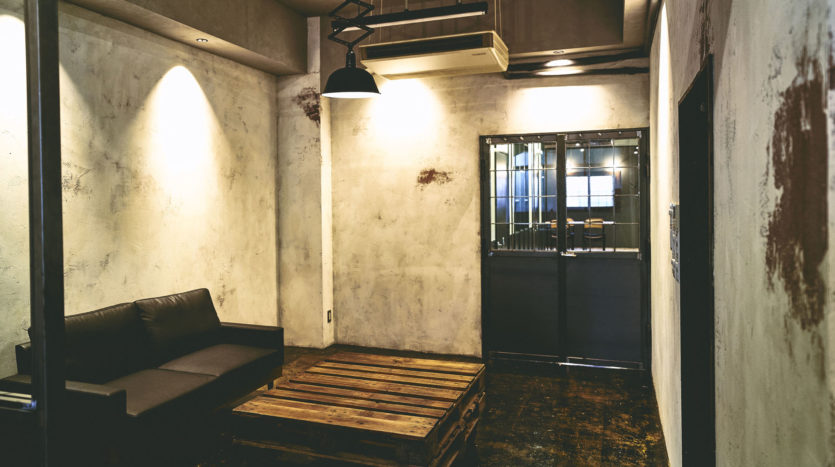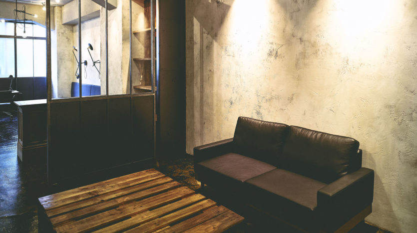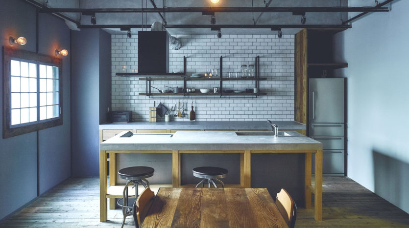 全体の雰囲気は都会の片隅にある隠れ家的なバーのような、大人な空間となっており、ダークカラーで統一されたモルタル床やフローリング、エイジング加工が施された白壁がヴィンテージ感も漂わせています。洗練されたキッチンスペースは、ファッション誌の撮影にも人気のスペース。アイランドキッチンは、きれいに仕上げられたモルタルコンクリートを天板に利用し、無機質なイメージと機能性を醸し出しています。