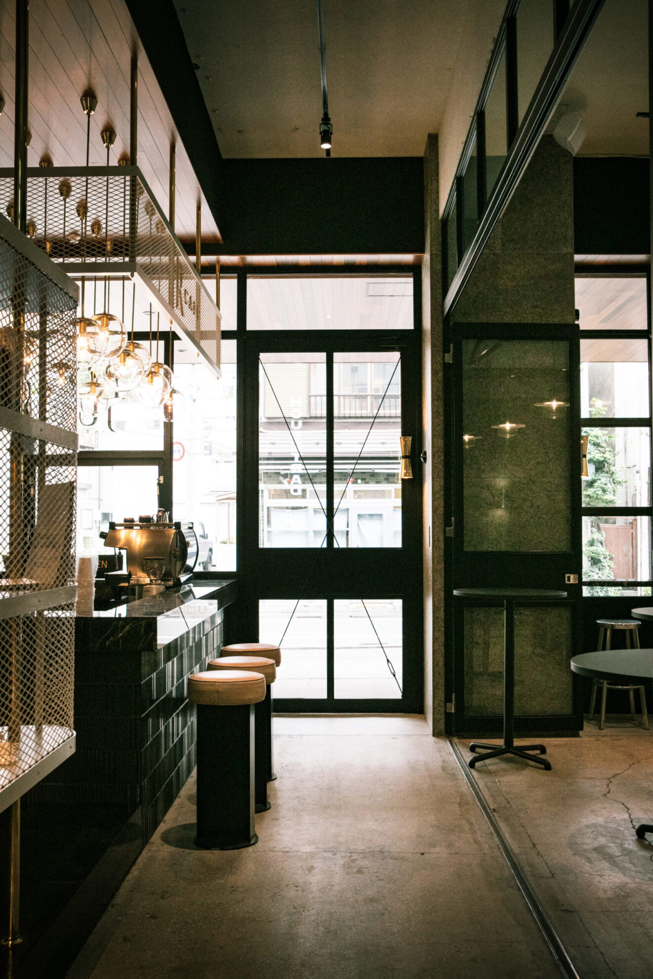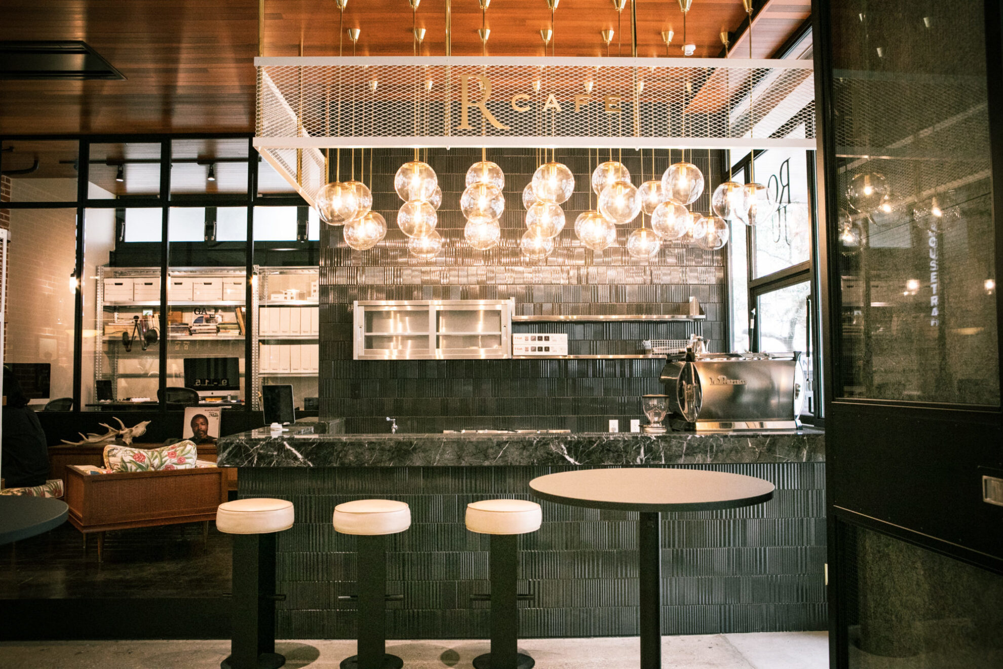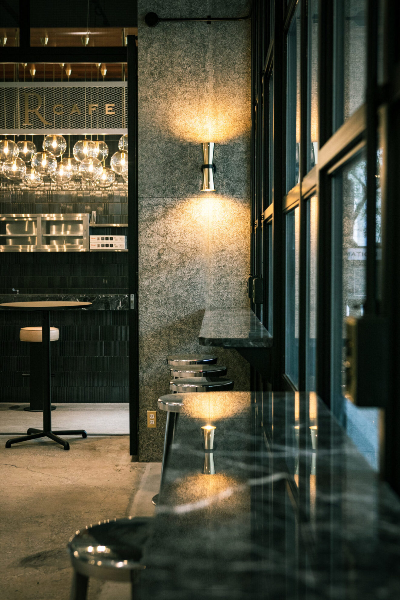 併設された大理石のカウンターをもつカフェスペースも利用可能。高い天井と温かみのある電球色を放つ照明で高級感のあるホテルのラウンジのようです。