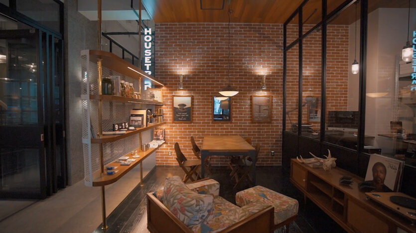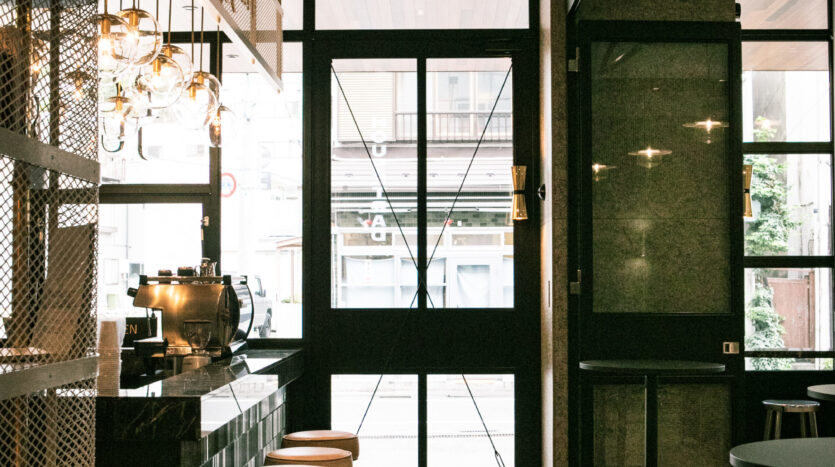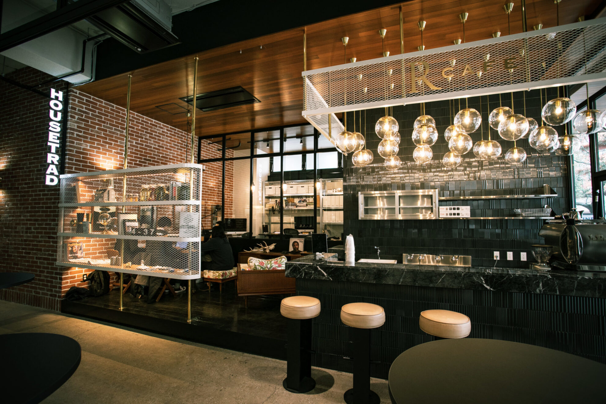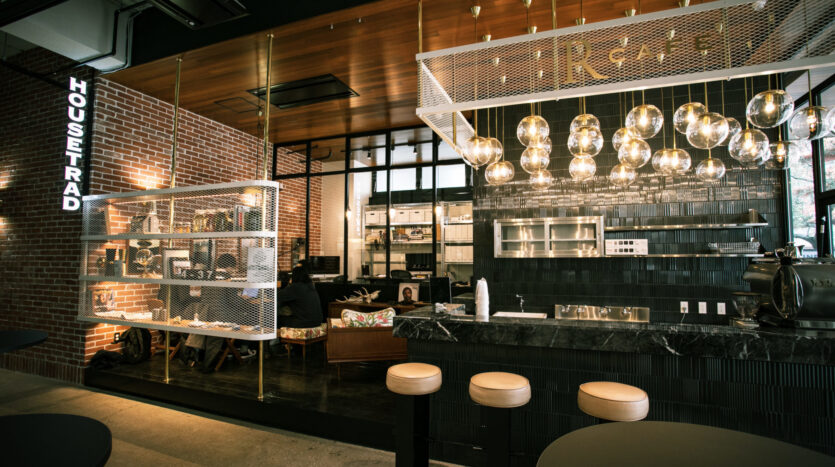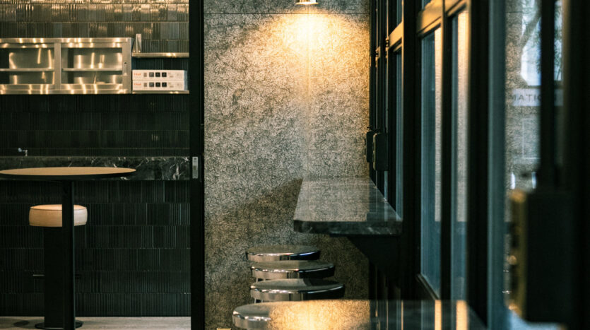 併設された大理石のカウンターをもつカフェスペースも利用可能。高い天井と温かみのある電球色を放つ照明で高級感のあるホテルのラウンジのようです。