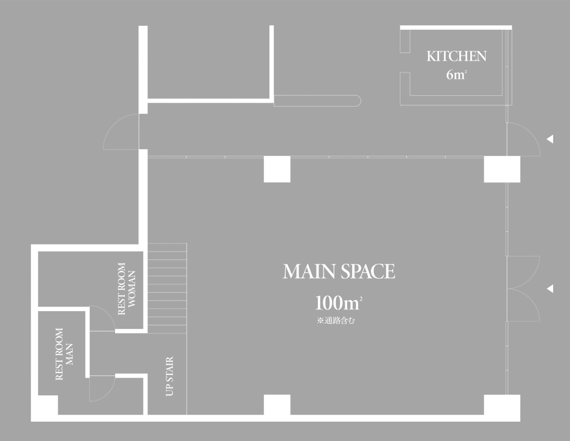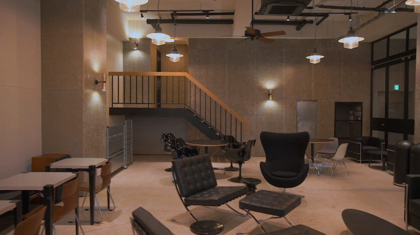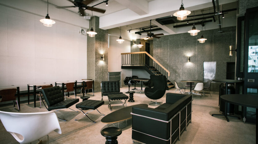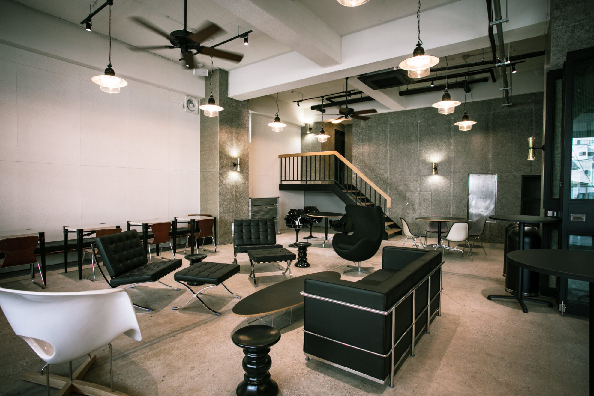5階建てのビルの1階にある約100㎡のメインスペースは4mもの天井高で広々としたスペースです。コンクリート打ちっぱなしの床と白とグレーに塗分けられた壁に洗練された家具が並びスタイリッシュな空間を創っています。