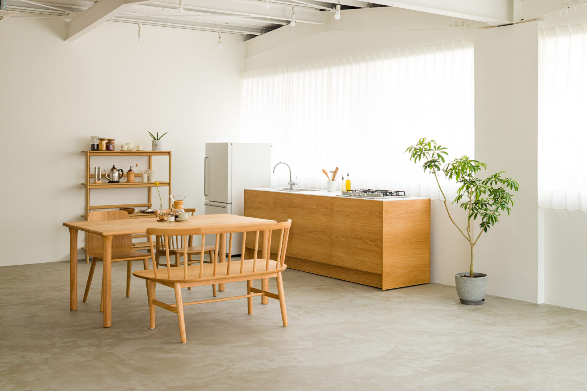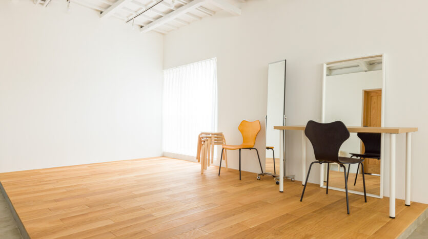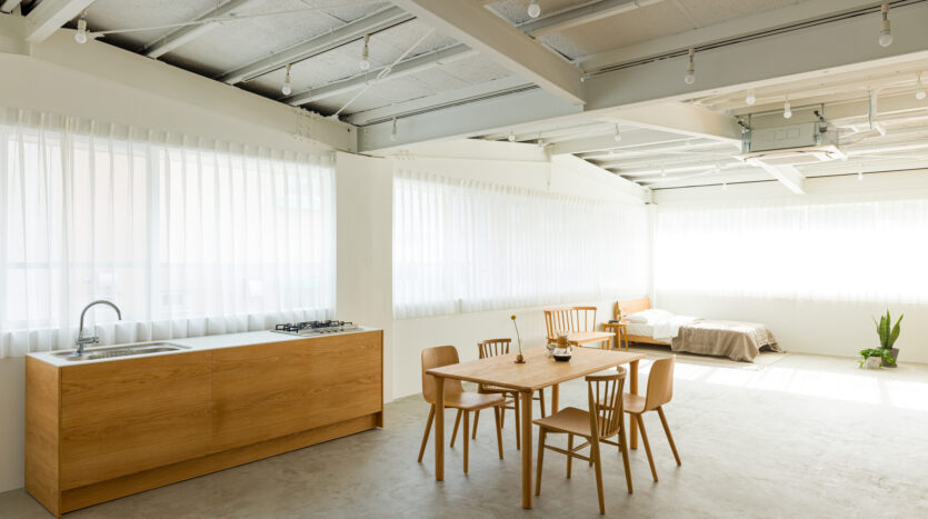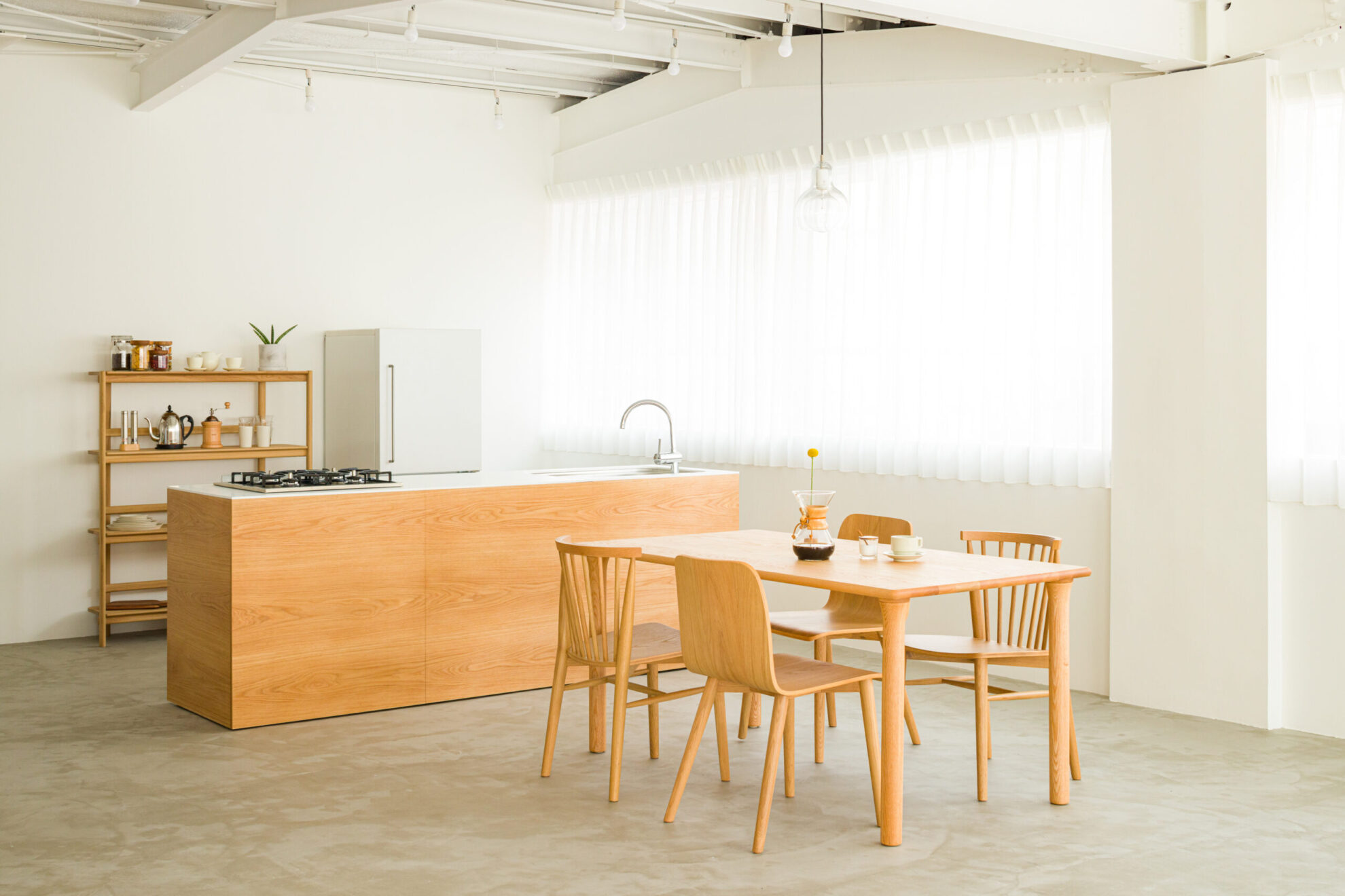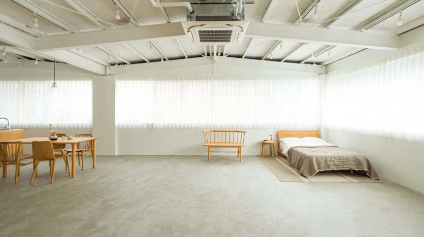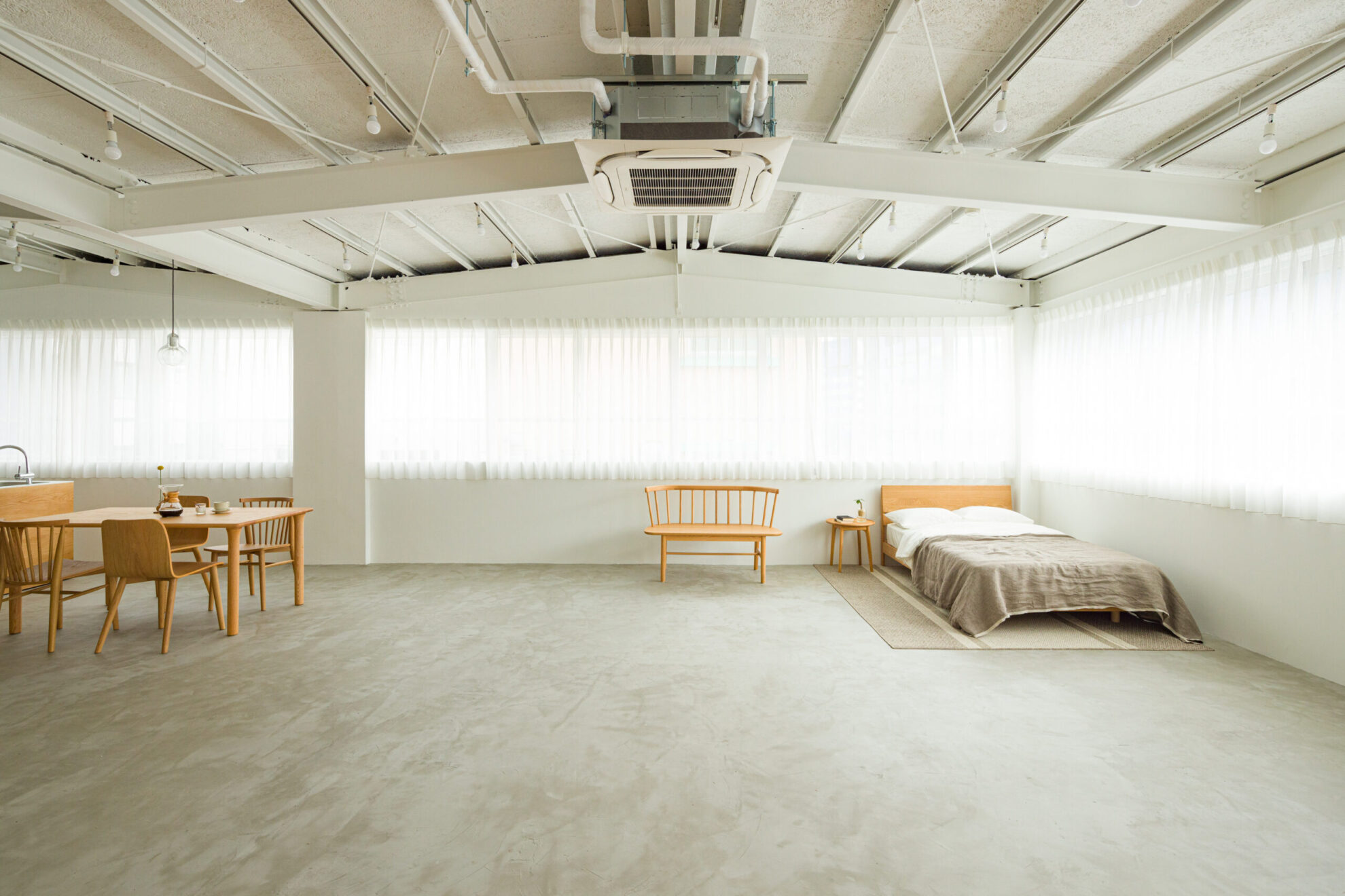 室内はモルタル床とフローリング床のエリアに分かれており、シンプルな清廉された印象を受けるスタジオとなっています。移動可能なアイランドキッチンを使ってレイアウトを変更したり、高い天井を利用しての撮影シチュエーションの変化など、さまざまな撮影ロケーションに対応できます。
