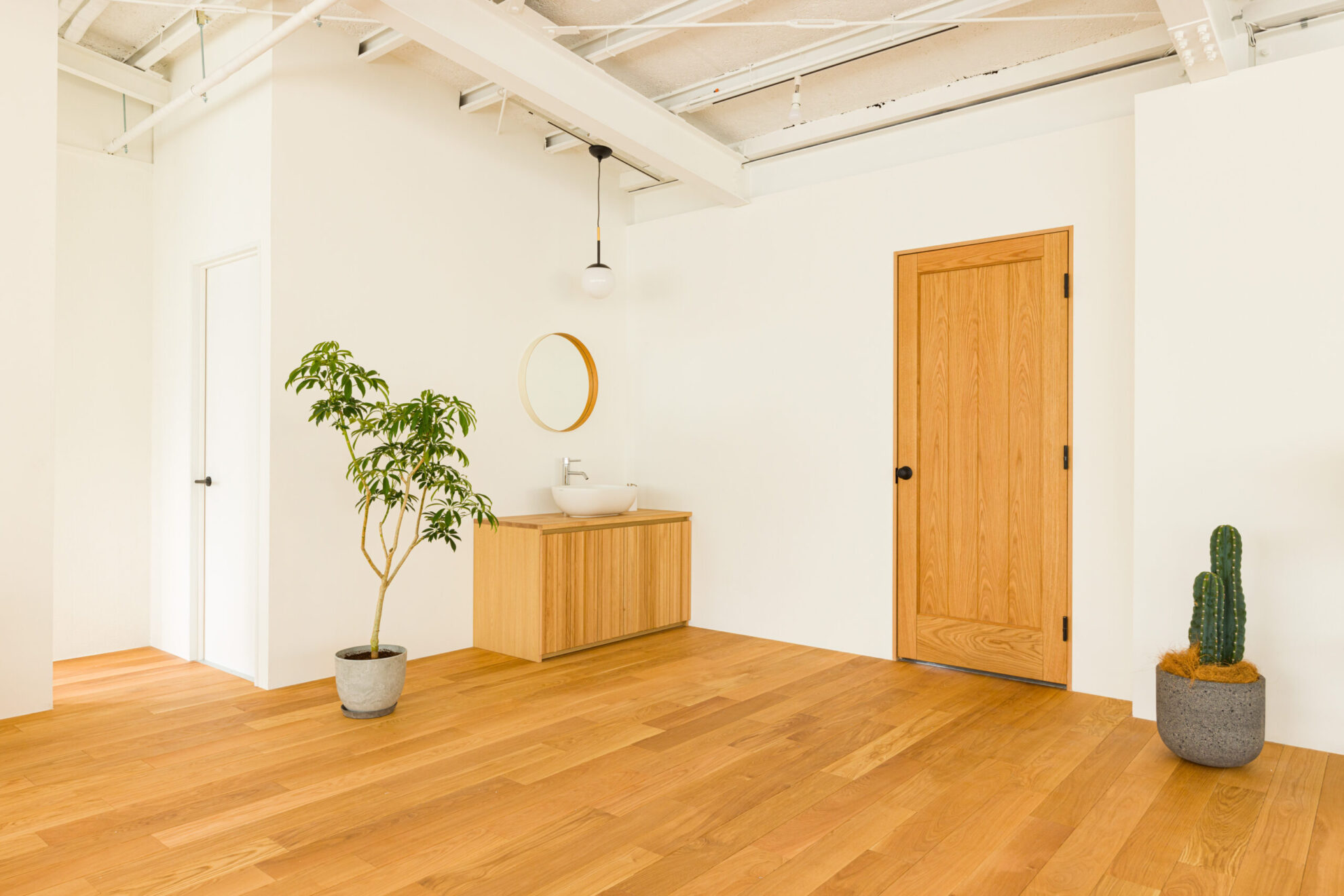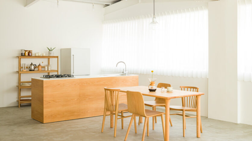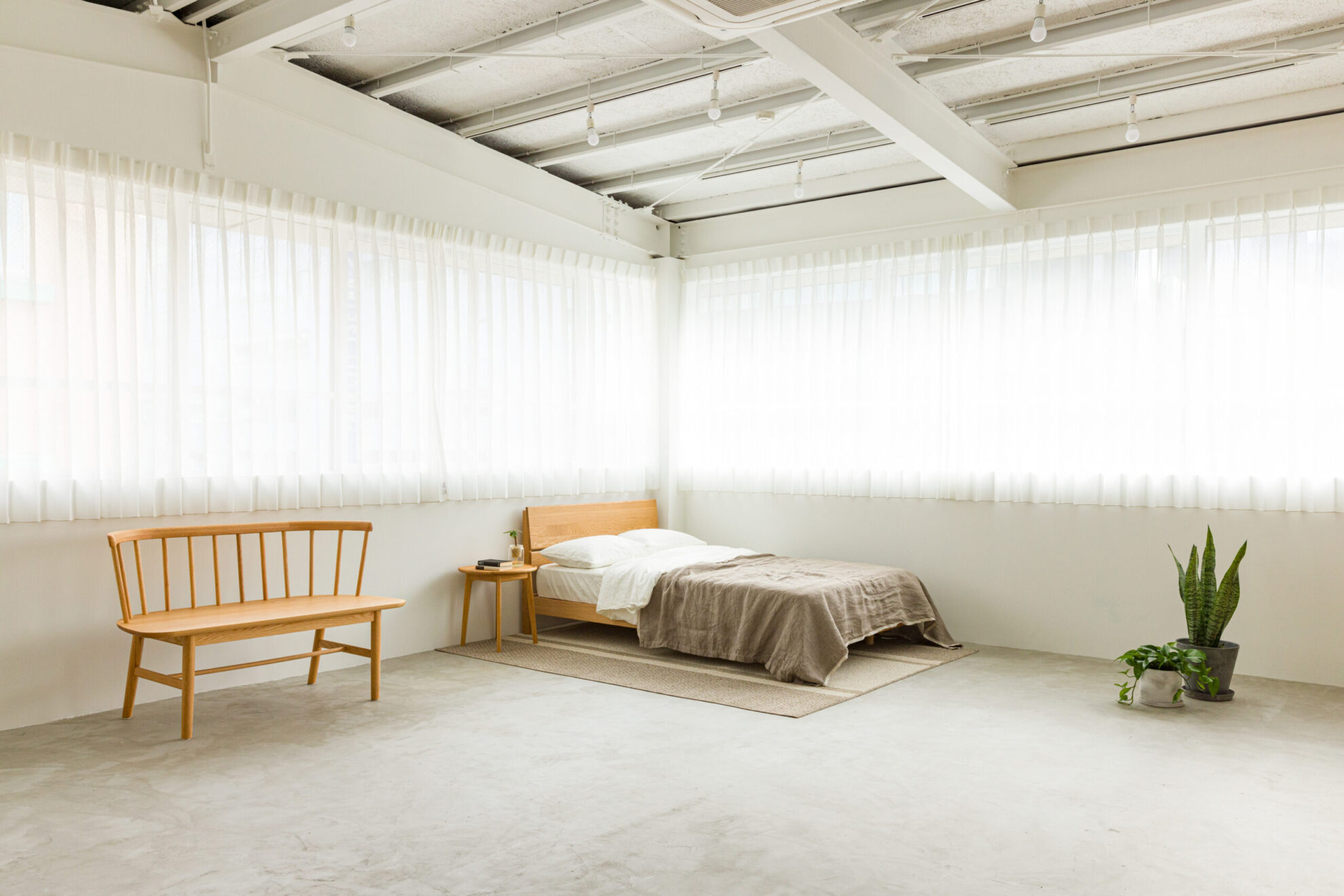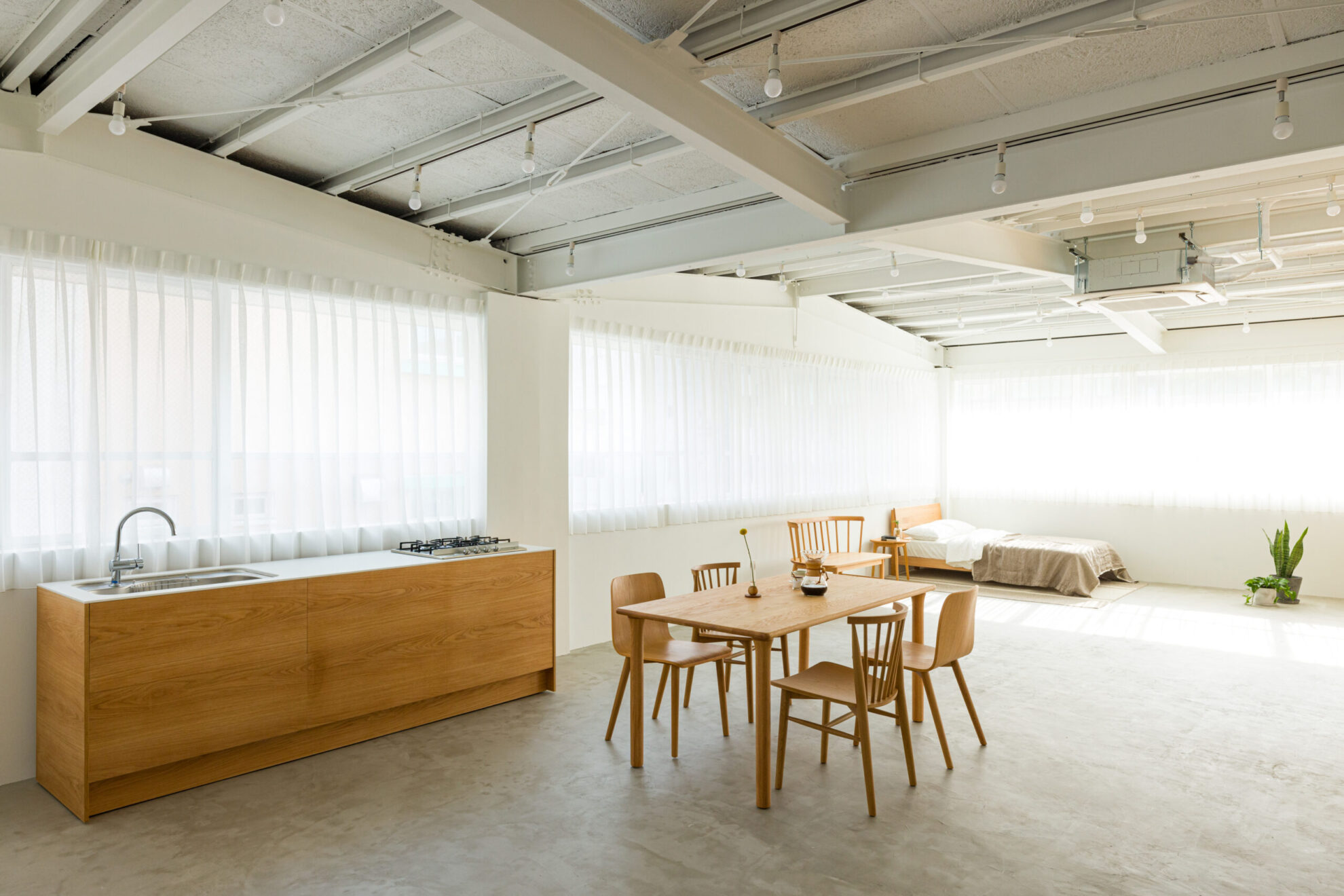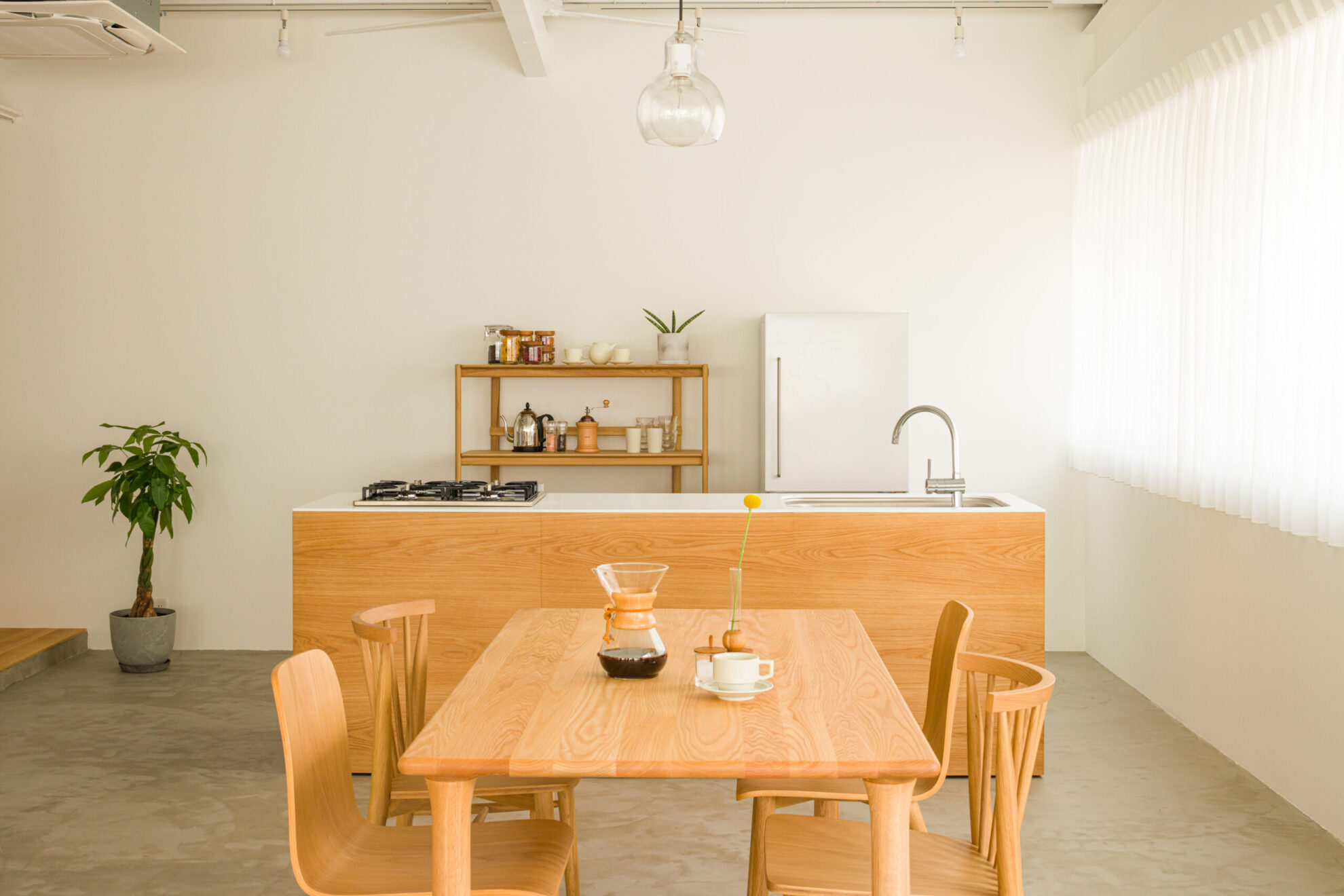 室内はモルタル床とフローリング床のエリアに分かれており、シンプルな清廉された印象を受けるスタジオとなっています。移動可能なアイランドキッチンを使ってレイアウトを変更したり、高い天井を利用しての撮影シチュエーションの変化など、さまざまな撮影ロケーションに対応できます。