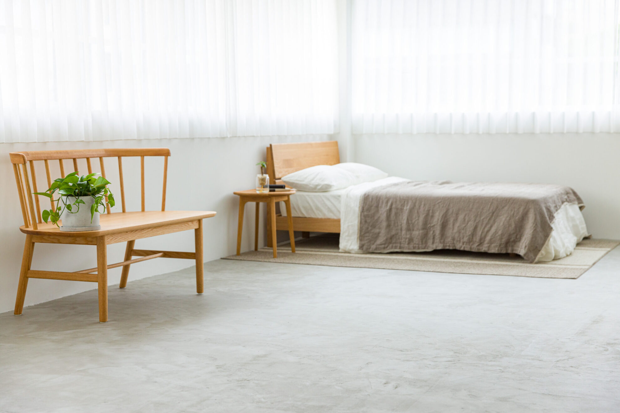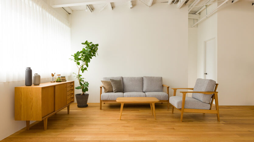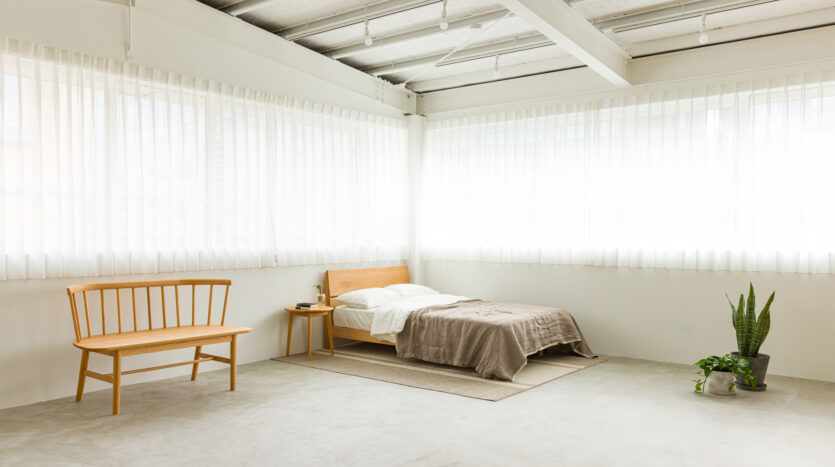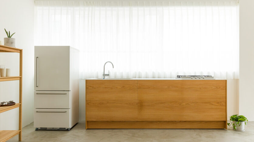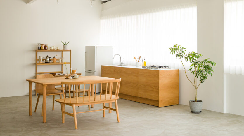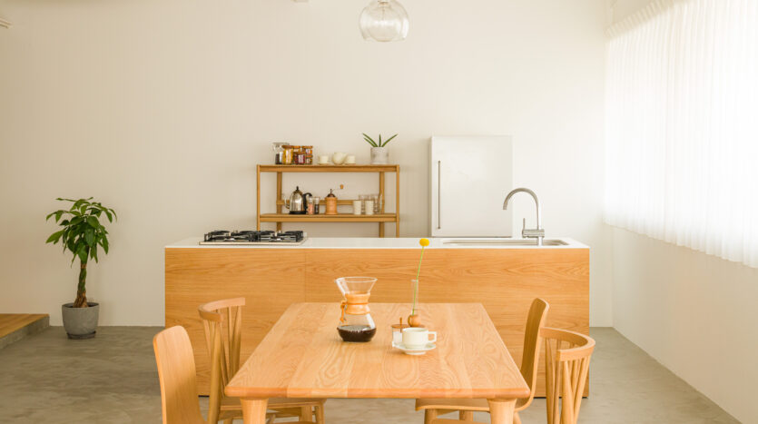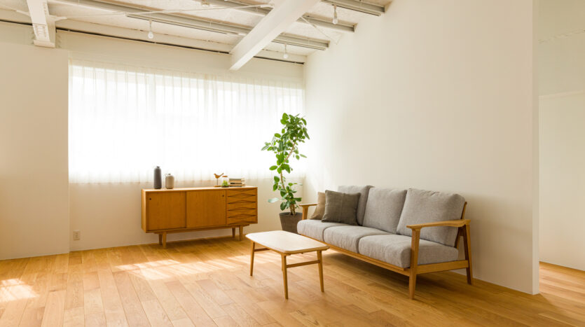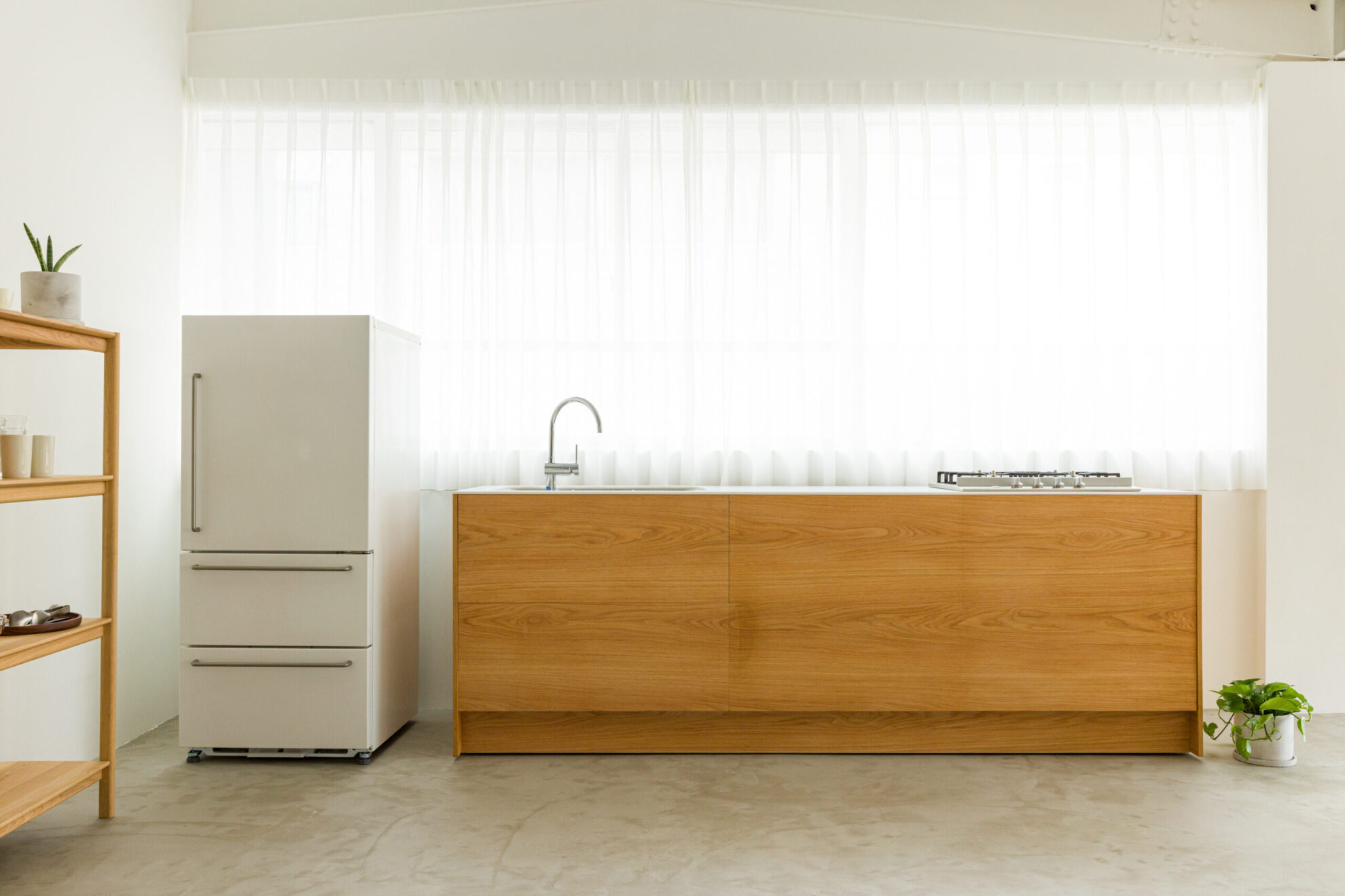 室内はモルタル床とフローリング床のエリアに分かれており、シンプルな清廉された印象を受けるスタジオとなっています。移動可能なアイランドキッチンを使ってレイアウトを変更したり、高い天井を利用しての撮影シチュエーションの変化など、さまざまな撮影ロケーションに対応できます。