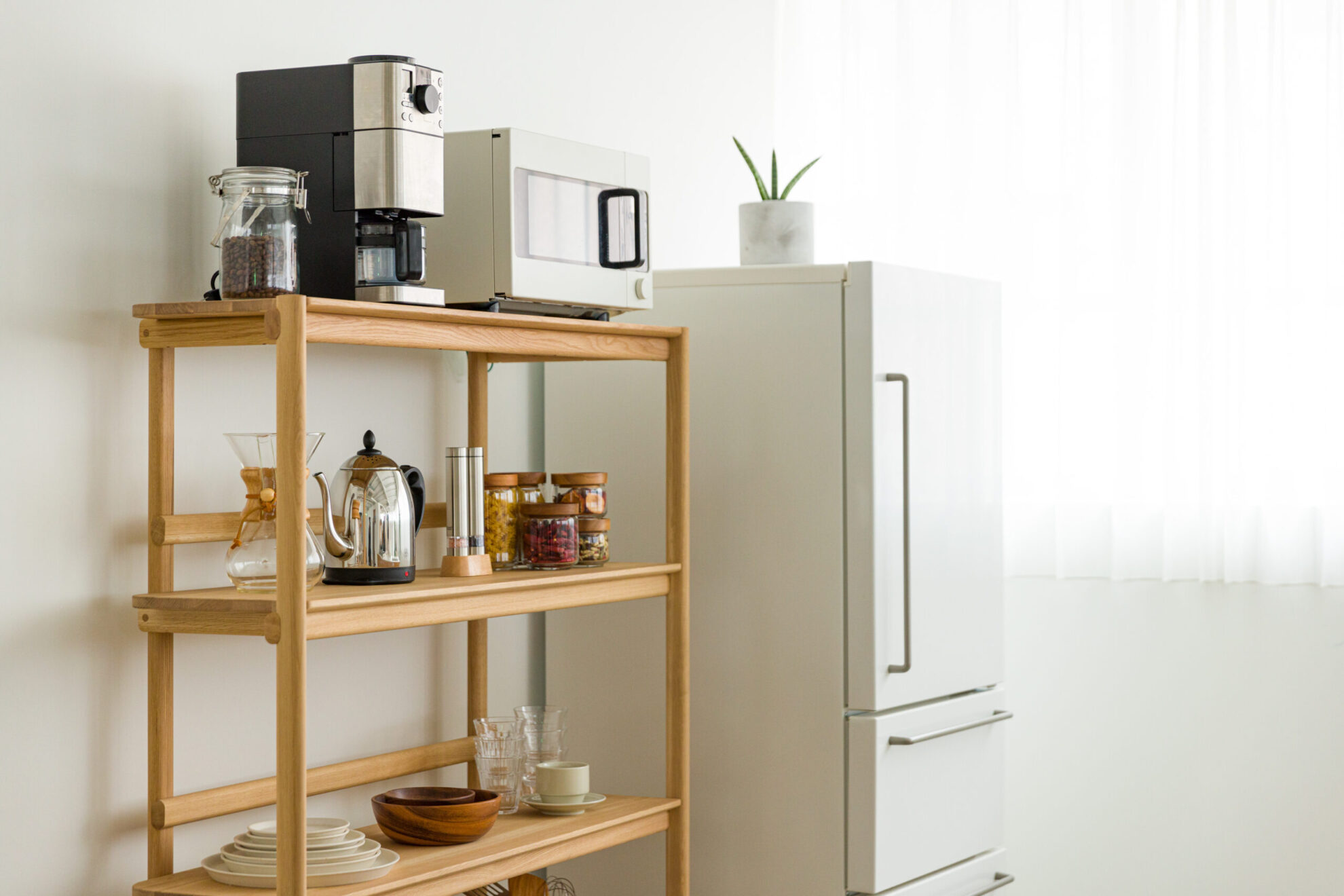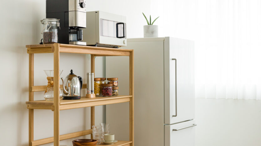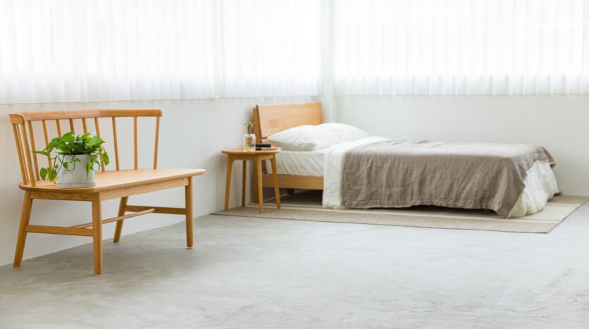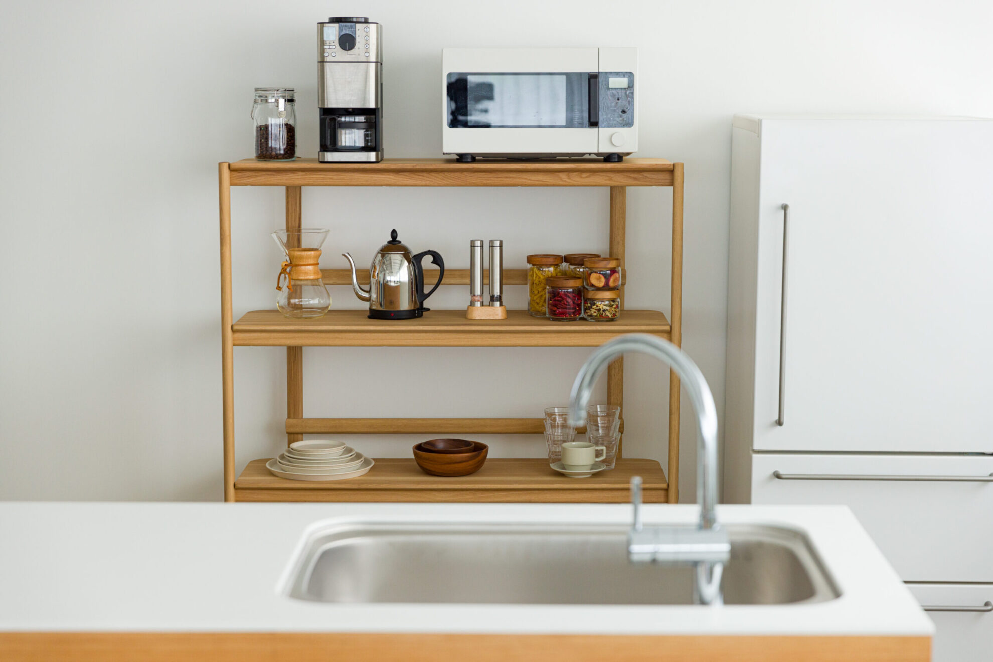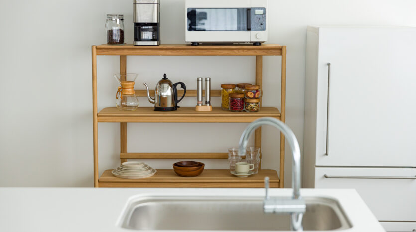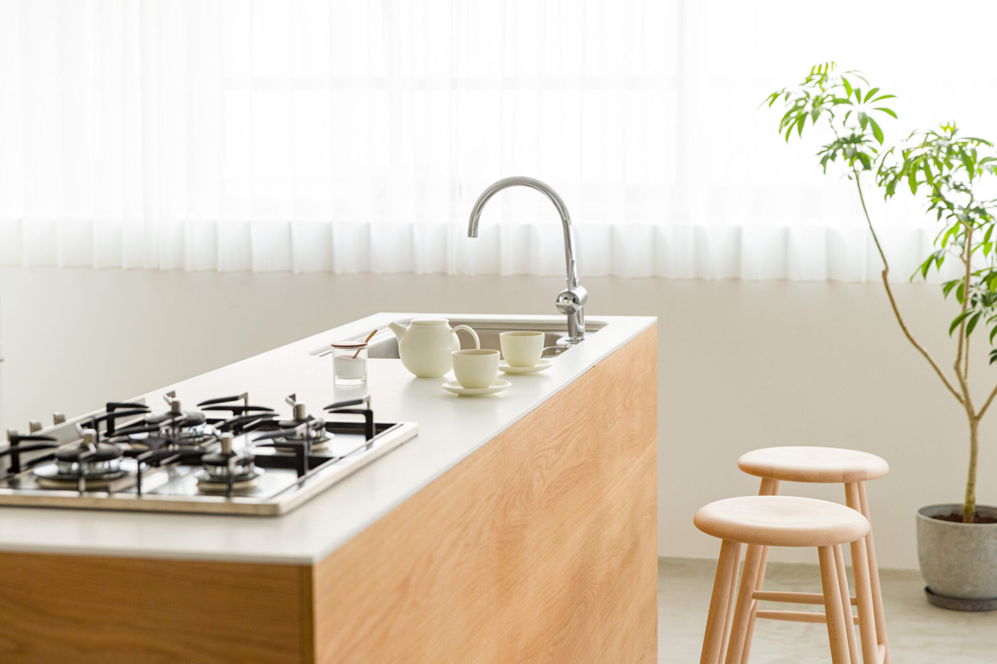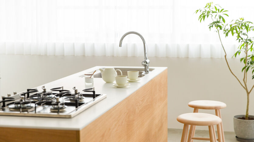 室内はモルタル床とフローリング床のエリアに分かれており、シンプルな清廉された印象を受けるスタジオとなっています。移動可能なアイランドキッチンを使ってレイアウトを変更したり、高い天井を利用しての撮影シチュエーションの変化など、さまざまな撮影ロケーションに対応できます。