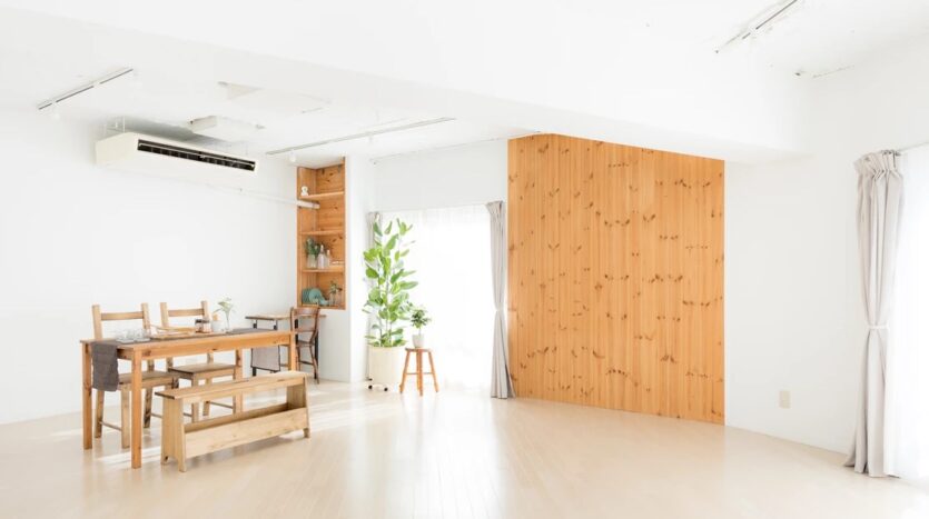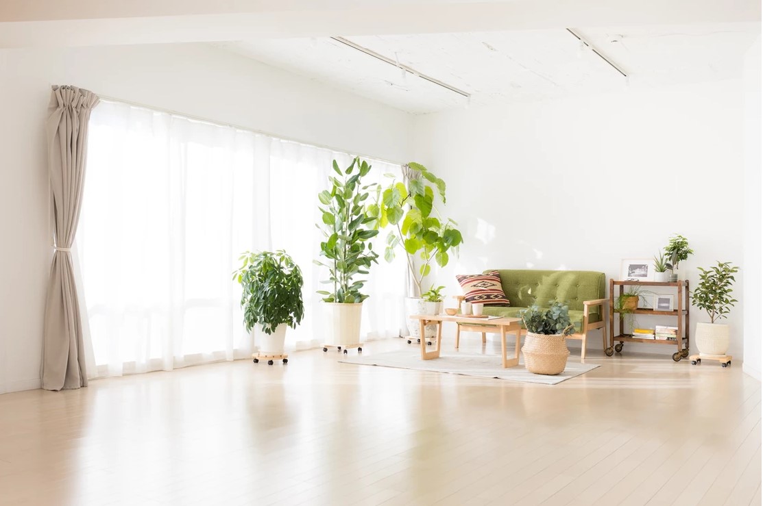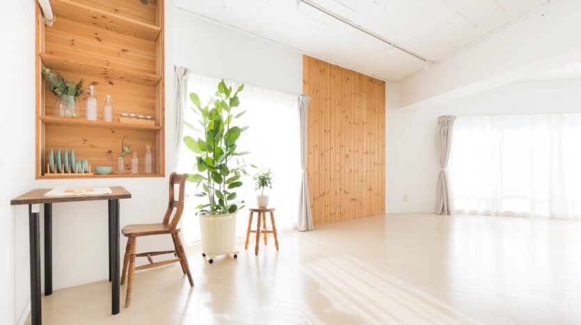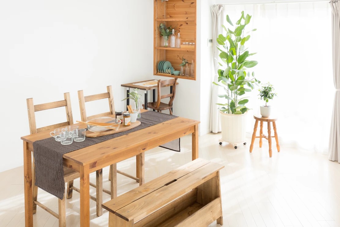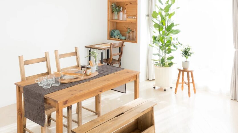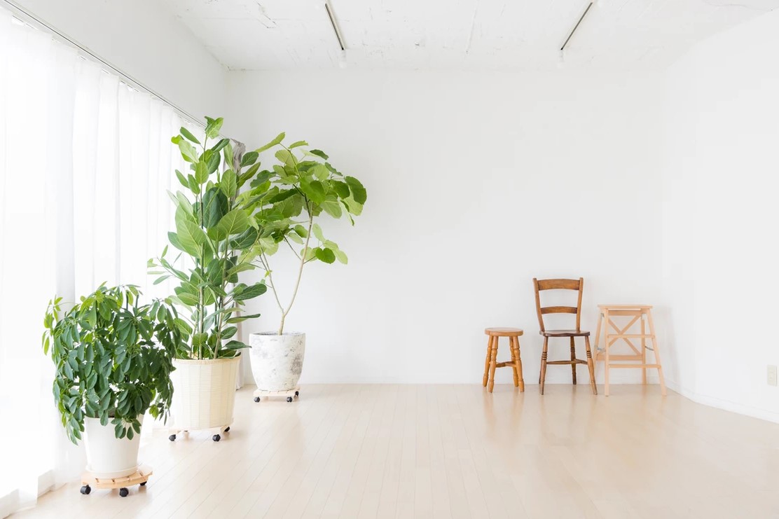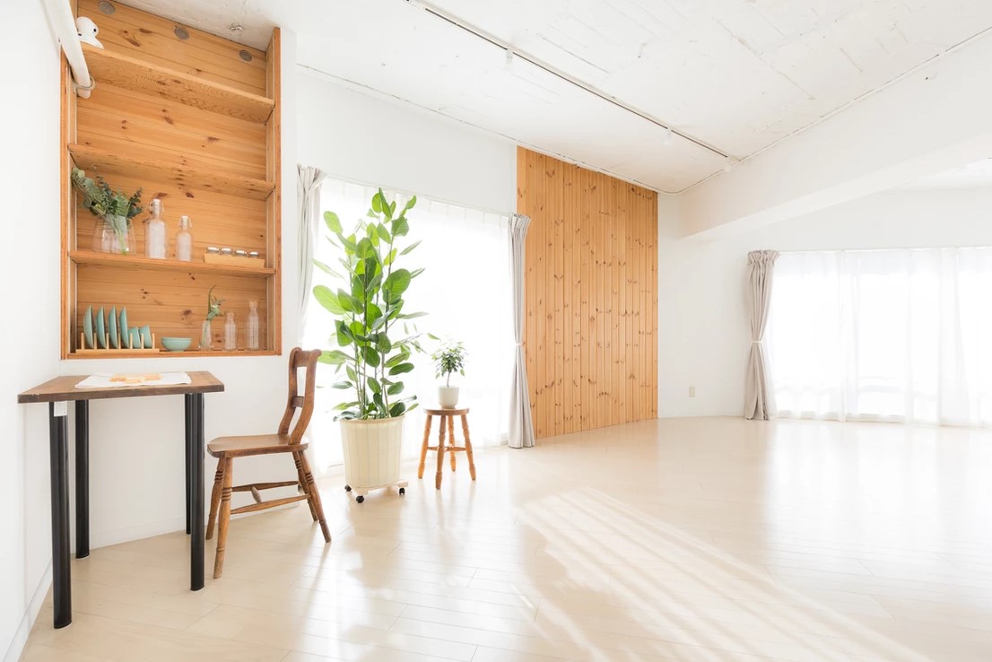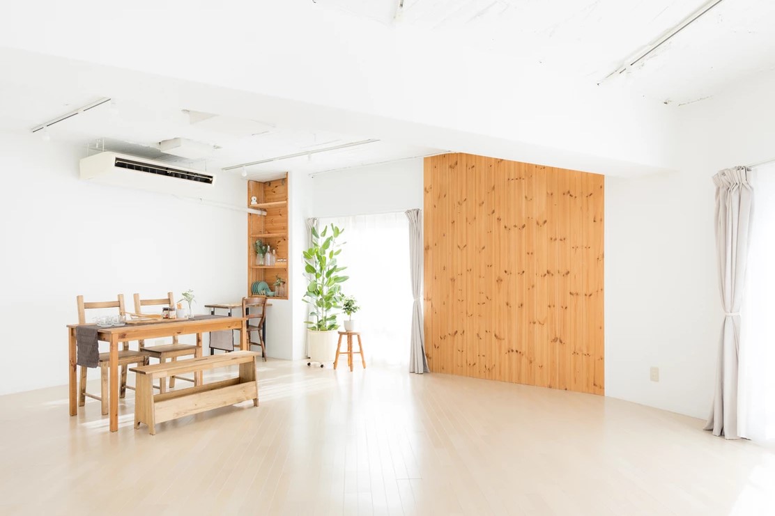 自然光の入るシンプルな白壁のリビングエリアとダイニングエリアにはナチュラルテイストのソファやテーブルが置かれ、グリーンや小物も充実し、アクセントとして利用することで幅広い撮影シーンに対応することができます。