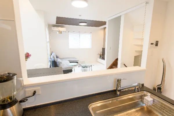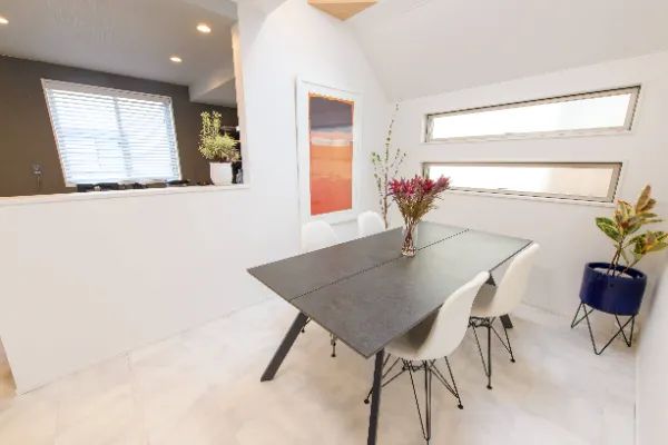 リビングダイニングはホワイト系のモダンテイストでまとめられ、3面採光にくわえ天窓から入る自然光が部屋全体に行き届きます。キッチンは対面式のカウンターキッチンを採用しダイニングと一体感を出した撮影が可能。