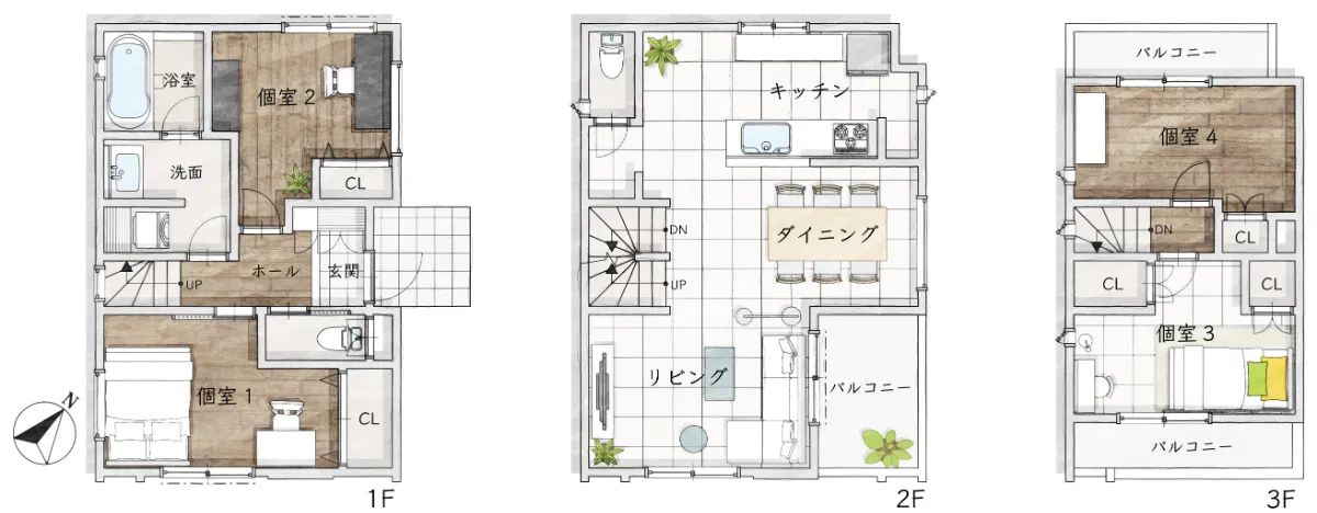 20帖を超えるLDKと4つの個室のうち3つが撮影可能で、一般的なハウススタジオと比べて生活感ある撮影に向いたスタジオです。