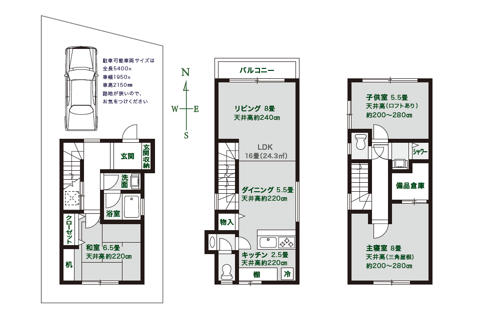 メインの生活空間となる2階は、約16畳のスペースに対面式のカウンターキッチンを備えたキッチンスペースとゆったりとしたリビングダイニングスペースがあります。3階にはロフト付きの子供部屋とベッドルーム、1階には控室としても利用できる和室と洗面室、浴室があり、DINKsなどの核家族世帯から三世代世帯までの多様なファミリー体系の生活シーンを再現するとができます。