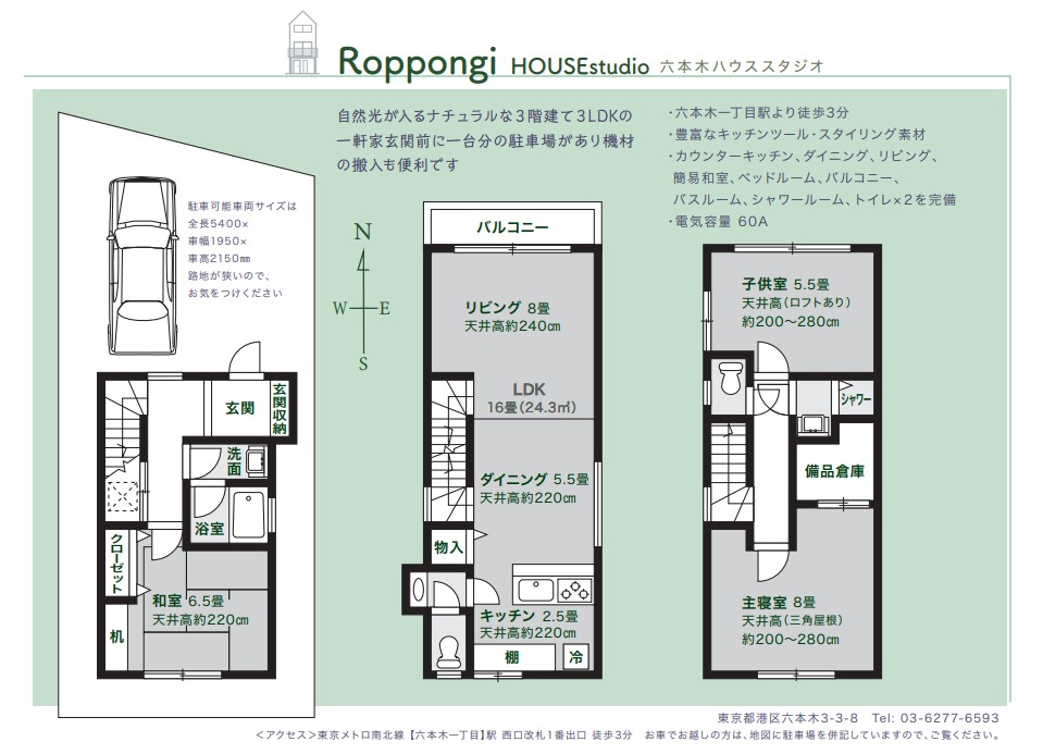 東京メトロ南北線 六本木一丁目駅西口改札1番出口から徒歩5分に位置します。料理研究家・フードコーディネーターの浜田陽子が代表を務めるStudio coodyが運営する3階建て一軒家を利用したハウススタジオです。