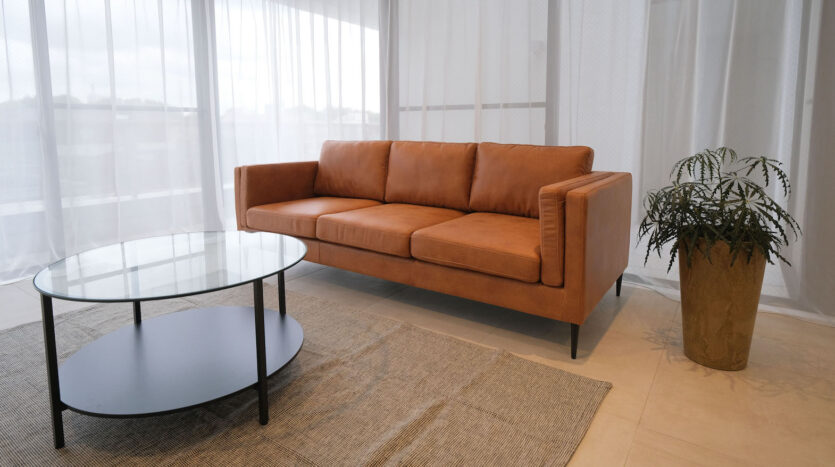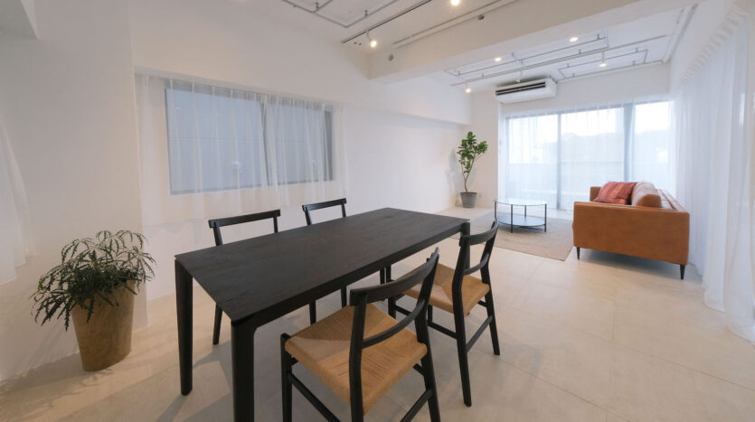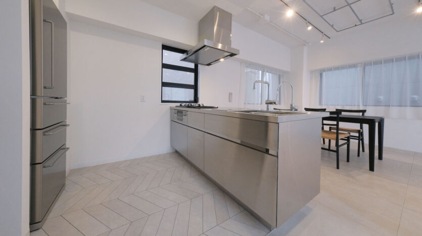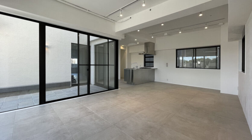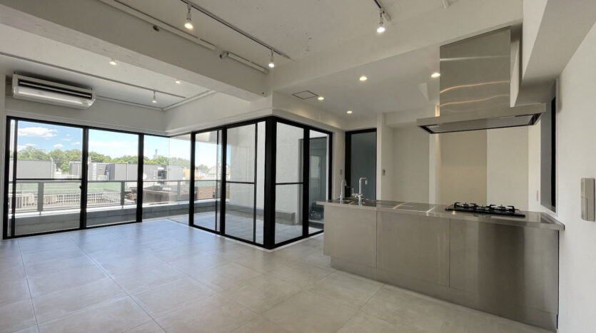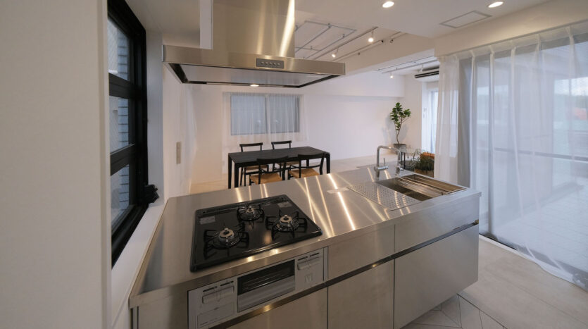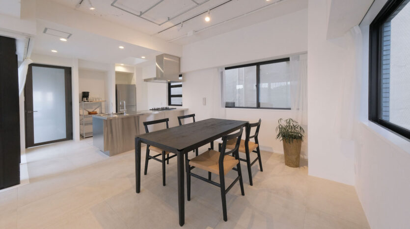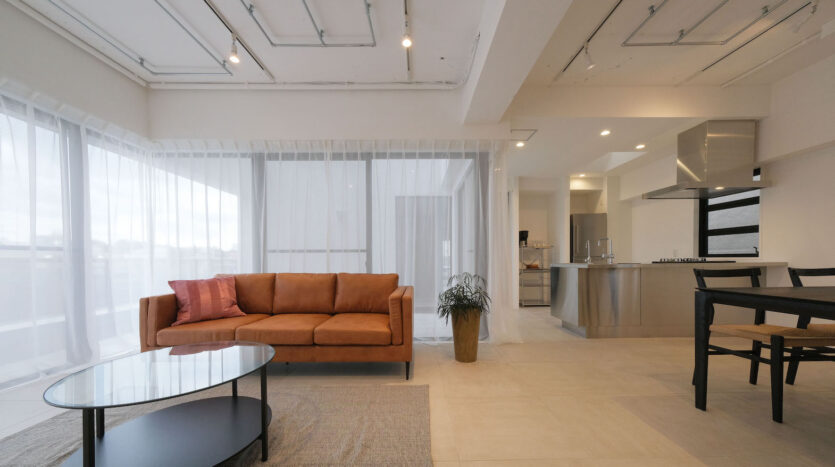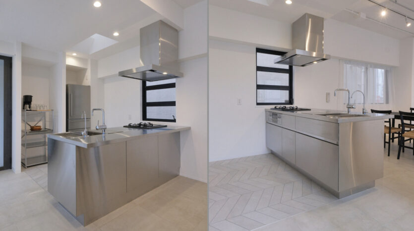 室内は、オールステンレスのキッチンや大型冷蔵庫を設置し、カトラリーやコーヒーメーカーなどの備品が充実しています。ソファやチェア、ダイニングテーブル、グリーンなどのインテリアでコーディネートされており、おしゃれなライフスタイルの表現にもおすすめします。