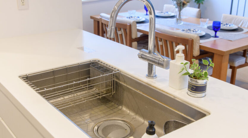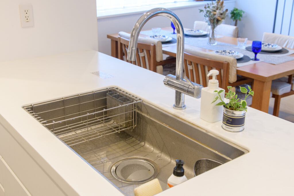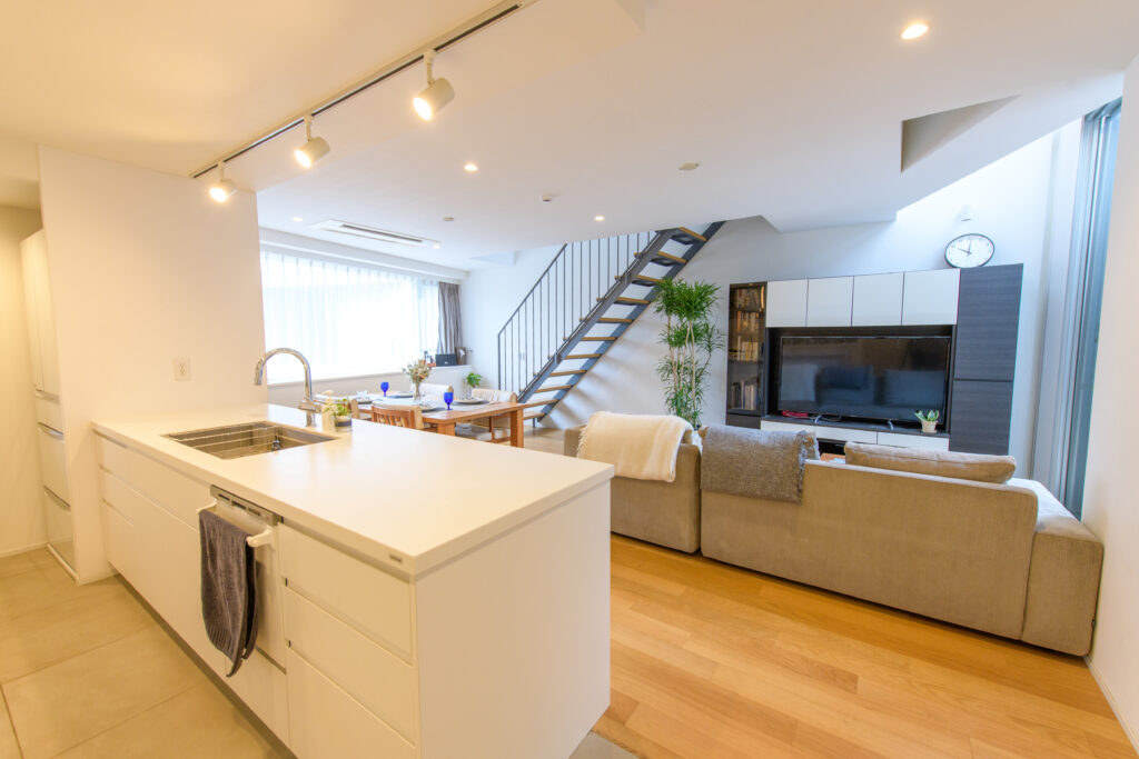 1F部分には白く大きなアイランドキッチンが設置され、24帖の広いリビングダイニングキッチンと6帖サイズの洋室が2間、バスルーム、洗面、トイレもあり、生活シーンをもれなく撮影することができます。たっぷりふりそそぐ自然光が室内の白い壁に映え、ナチュラル色のフローリングが柔らかな雰囲気をかもしだします。