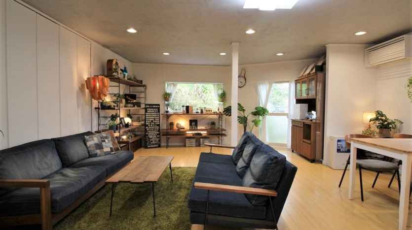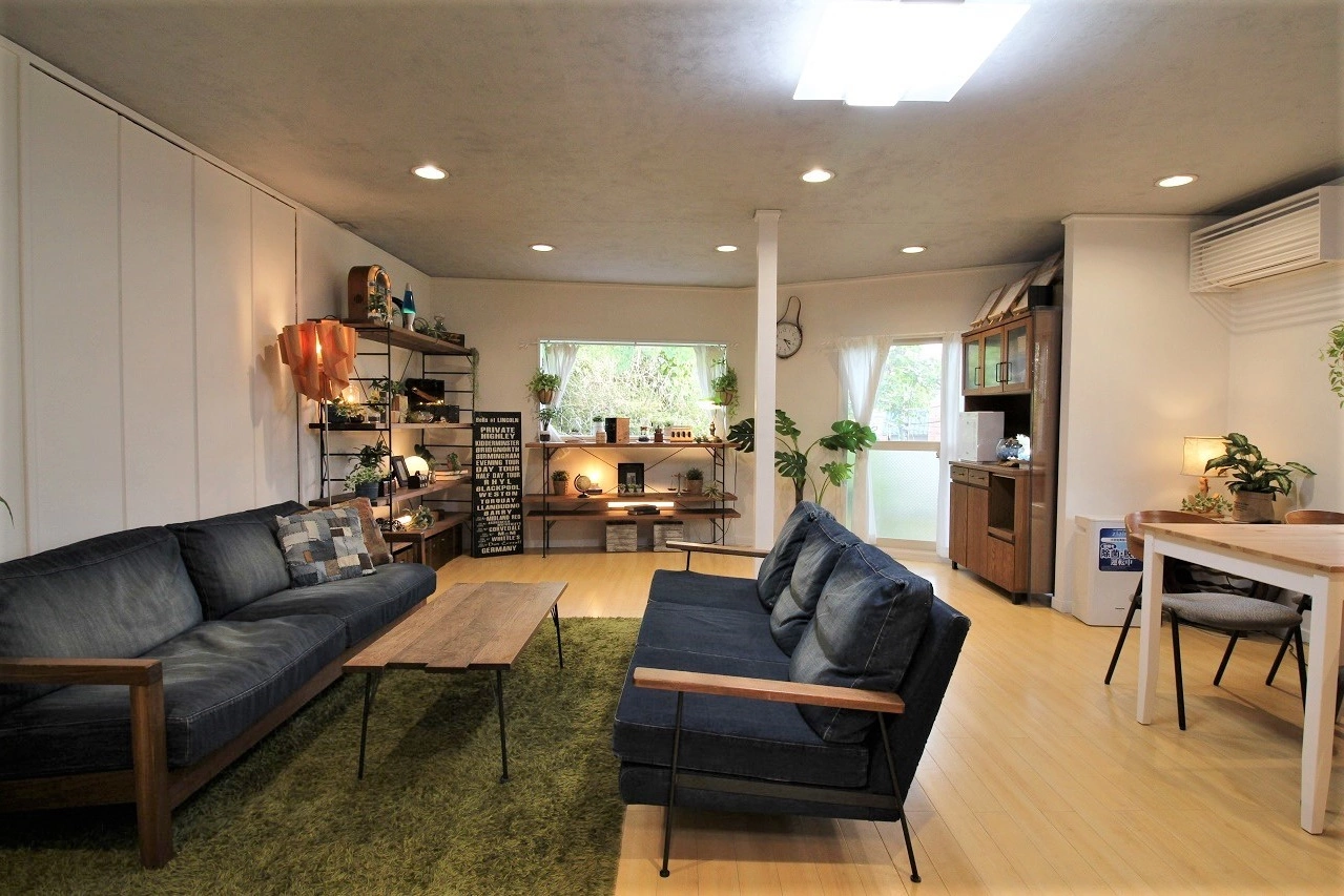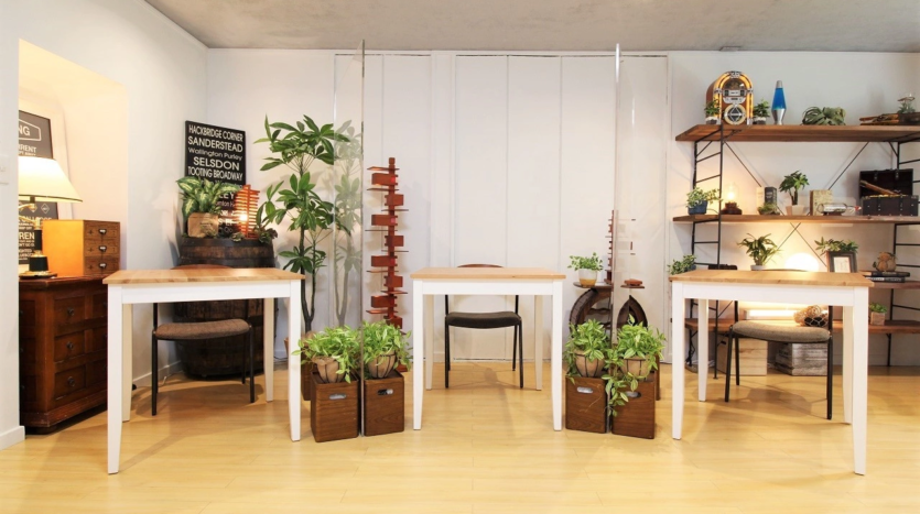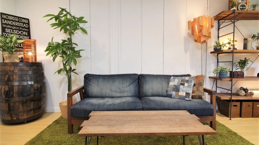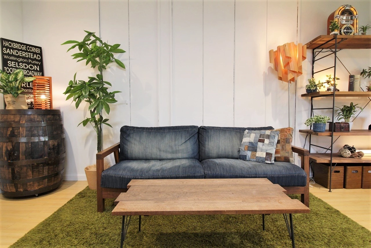 1階スタジオはデニム生地のソファやデスク、チェア、シェルフなどがあり、レイアウト変更も可能なため空間を多様に使用できる柔軟性が魅力です。備品も豊富に取り揃えているので、セットの持ち込みを減らしながらもバリエーション豊かなカットを実現します。