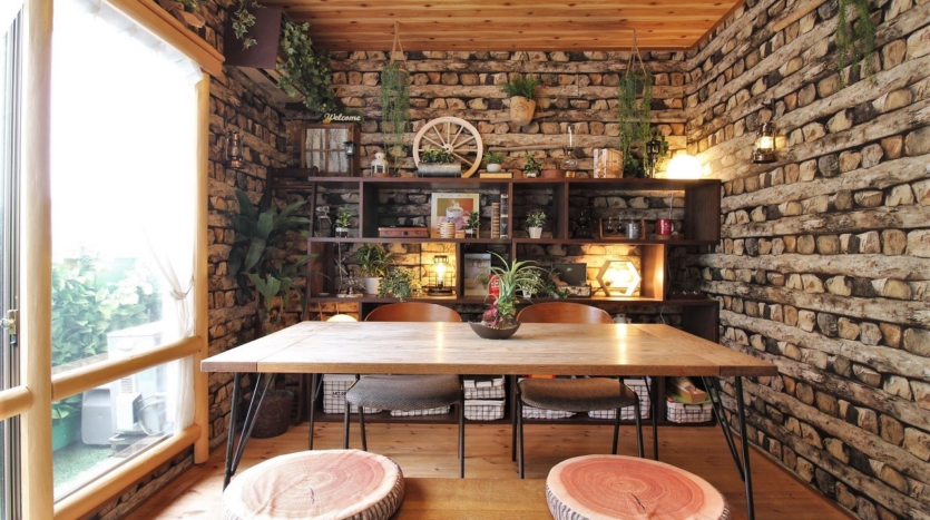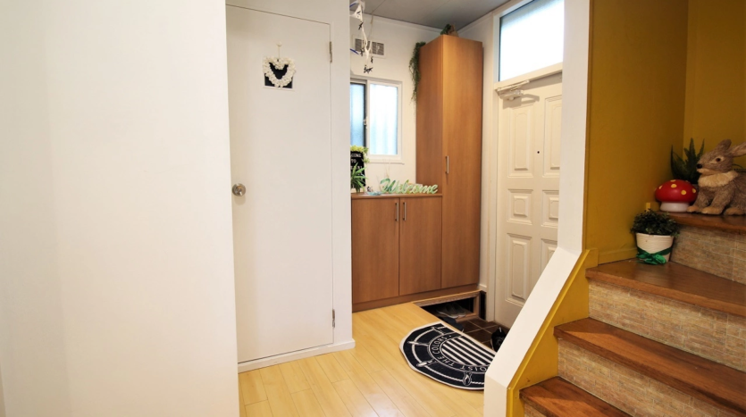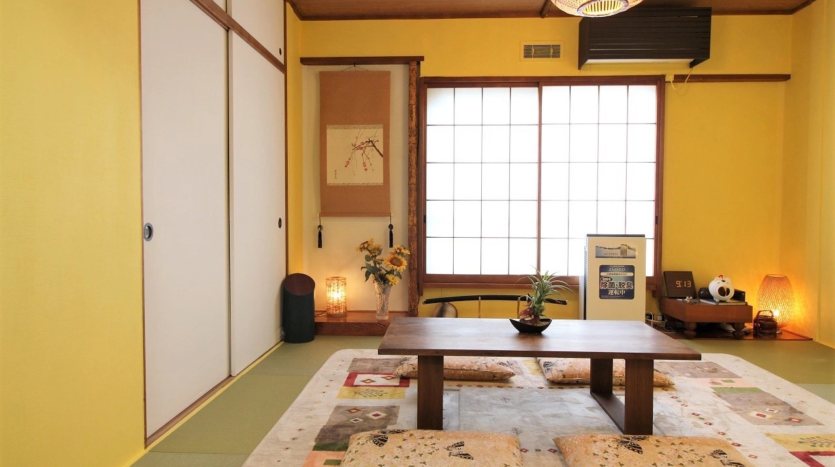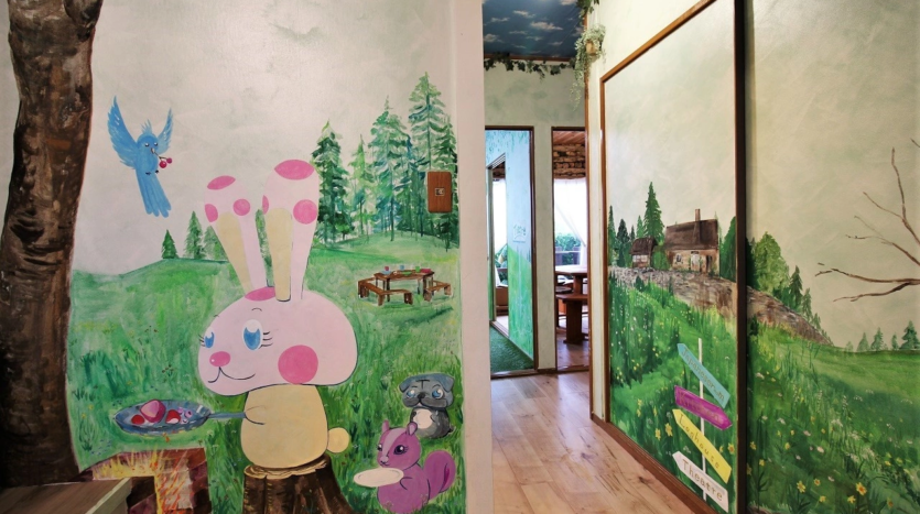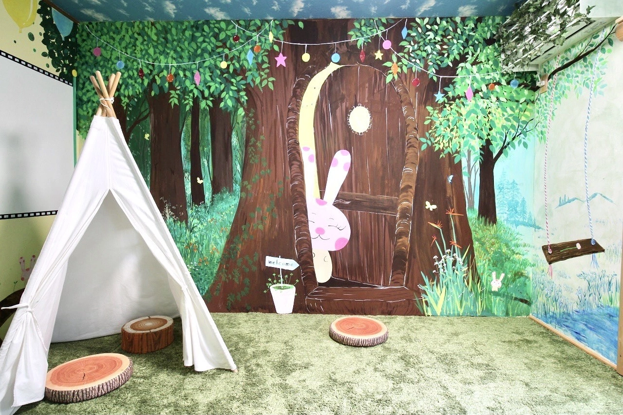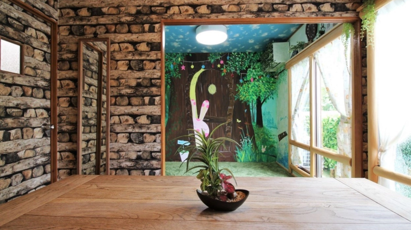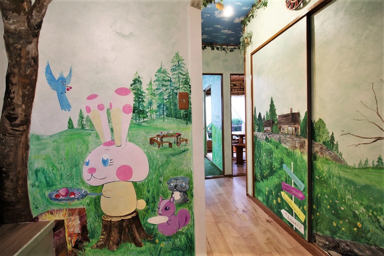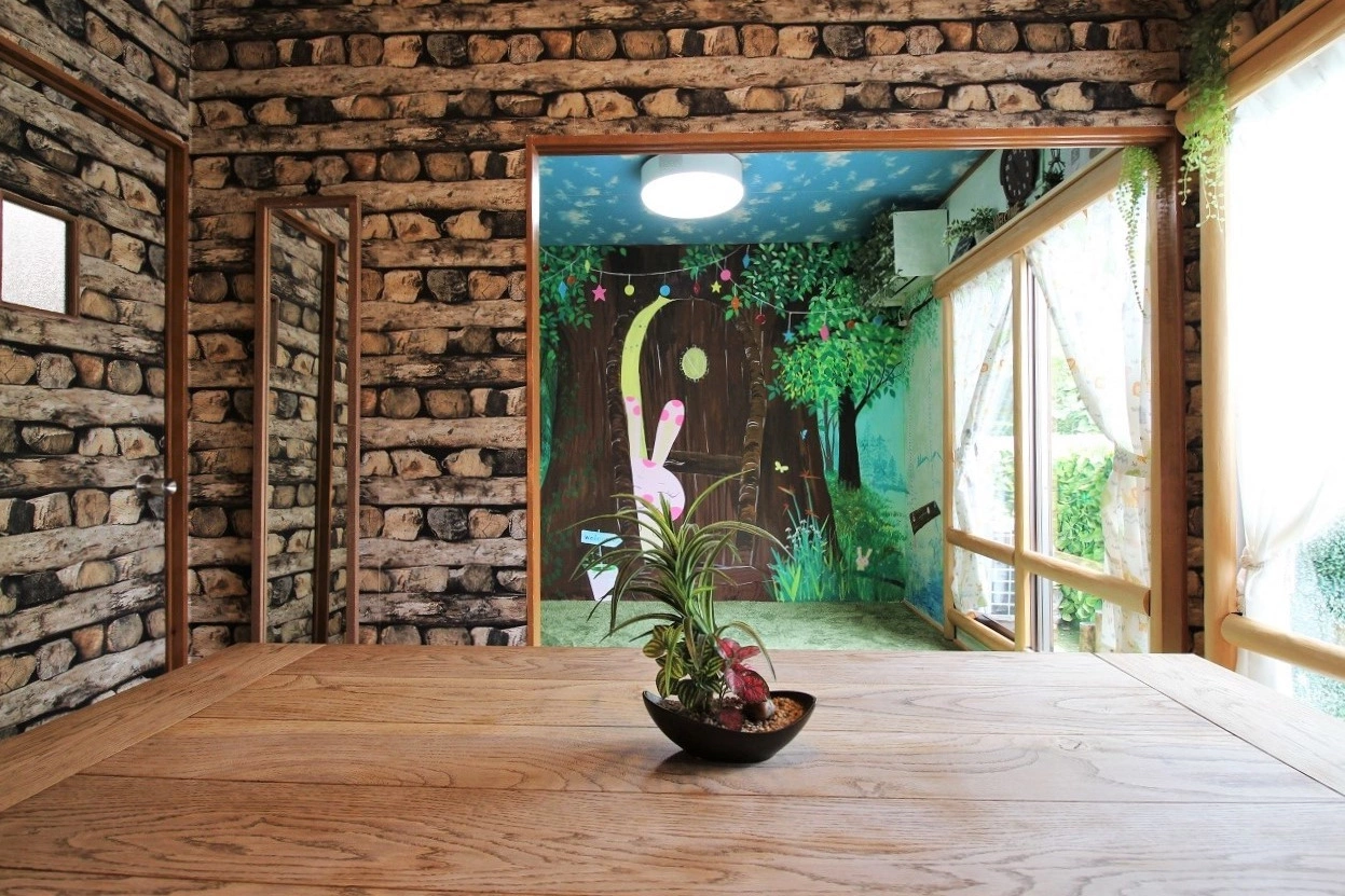 2階スタジオは、居室や廊下の壁面のペイントがインパクト大。ログハウス風の空間や和室なども設けた使い勝手のよい空間となっています。