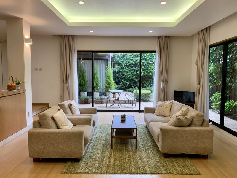 重厚感のある玄関ドアを開けると、ゆとりを実感させてくれる天井の高いエントランスを通り抜け、LDKへと続く間取りになっています。1階のリビングは25畳、ダイニングは12畳の広さに加え、大きな窓の外にはテラスが設けてあるので、様々な角度から引きのあるシーンを撮影できます。