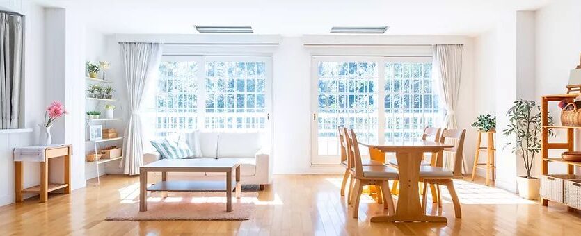 2Fは、白壁にナチュラルなフローリングで、ぬくもりを感じるリビング&ダイニングスペース。奥行き感のある撮影もできます。