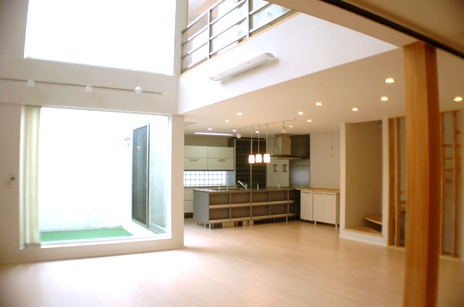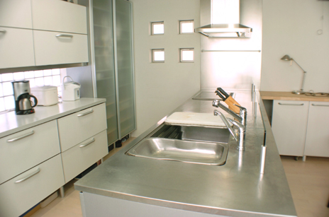 2層に別れたメインスタジオは、優しいナチュラル色のフローリングと白い壁のリビングダイニング、アルミ天板を採用した機能的で開放的なカウンターキッチンスペースからなり、テラスからの自然光が反射して優しく射し込みます。