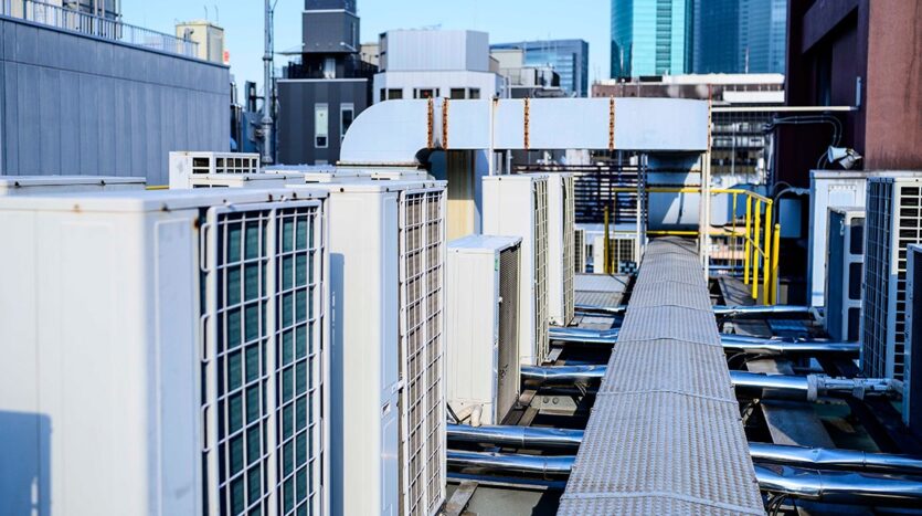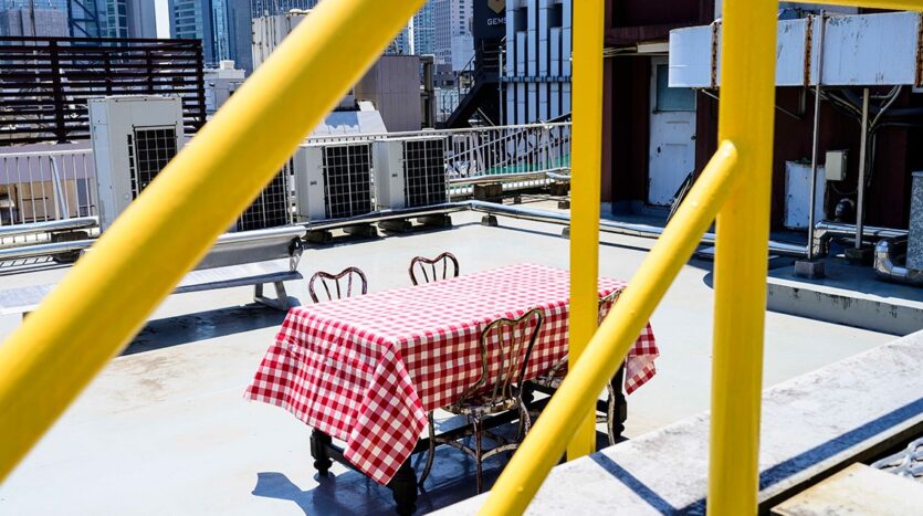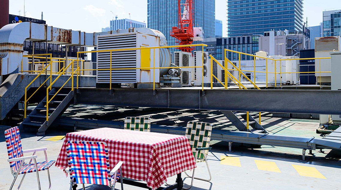 撮影が可能な屋上からは立ち並ぶビル群だけでなく、同ビルのエアコンの室外機や配管類が作り出す景色を背景に撮影できるのも、このスタジオの醍醐味です。