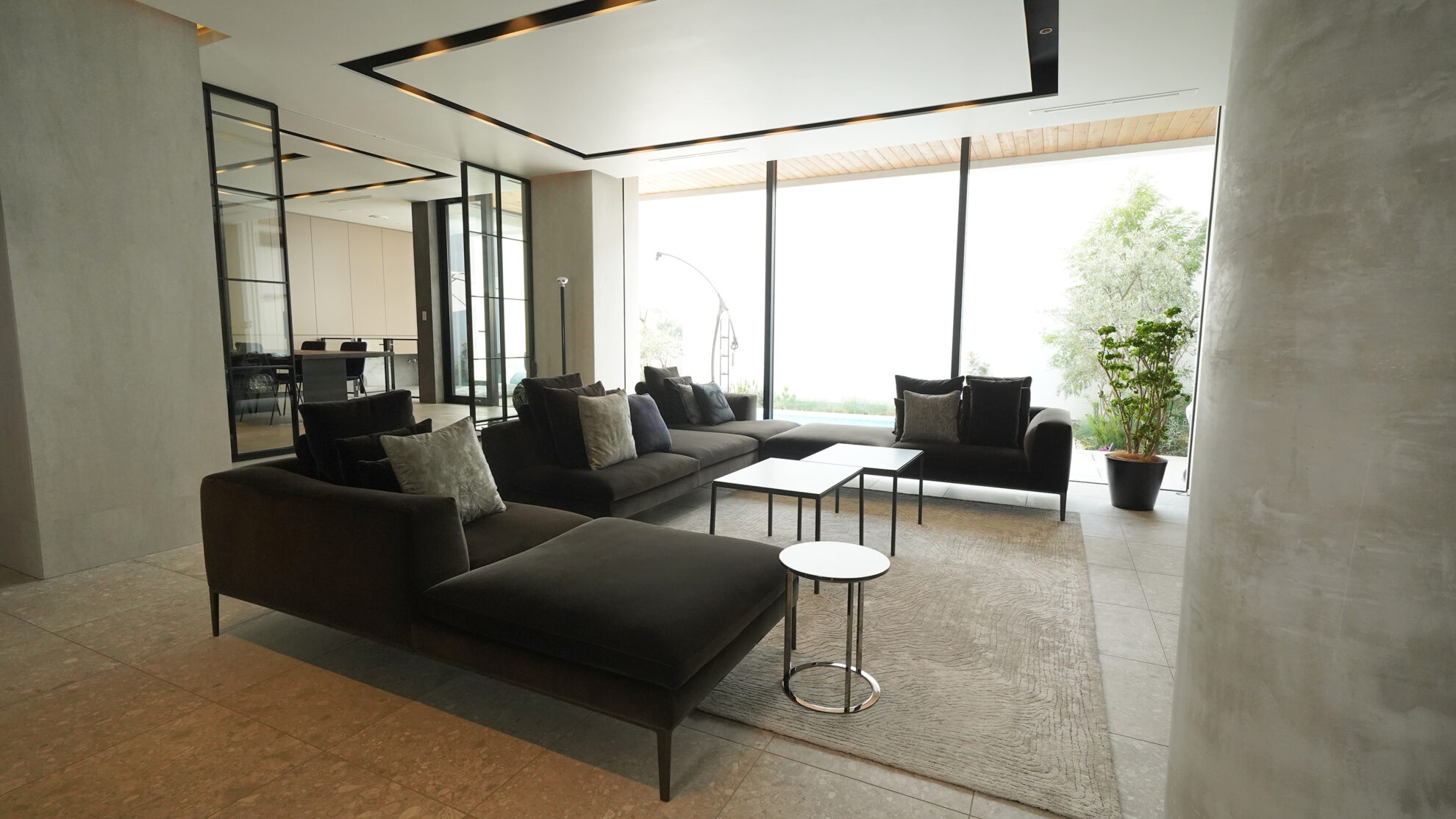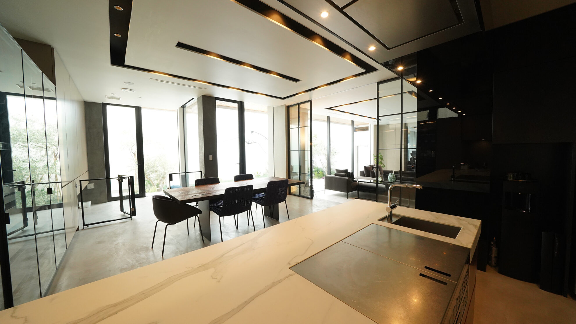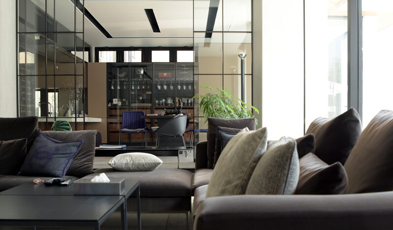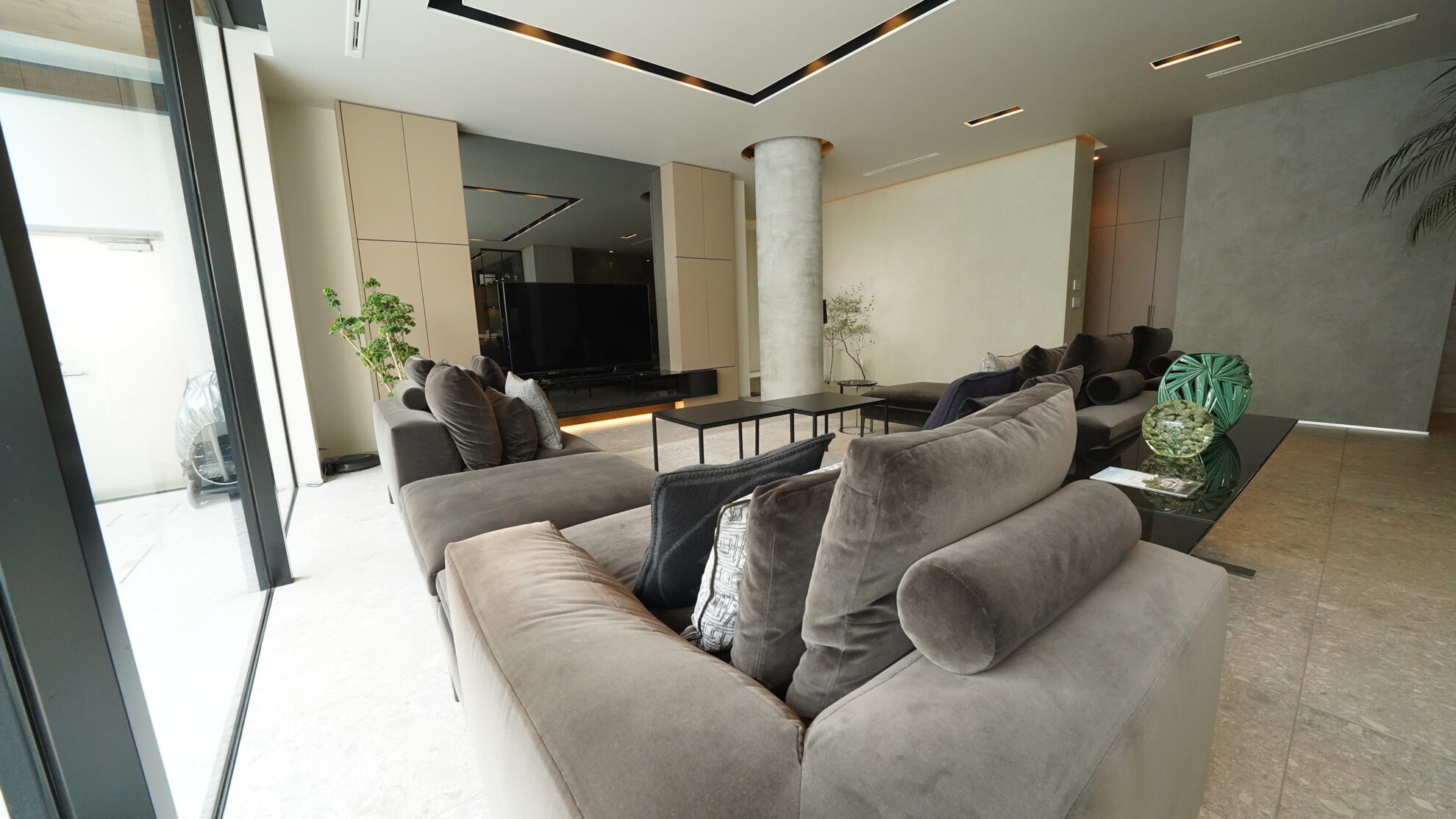 室内は大開口部から自然光が差し込み、室内に陰影を与えています。空間を彩るのは洗練されたインテリアの数々。B&B ITALIAで統一したソファは、グレーのベロアを、Paola Lentiでコーディネートしたダイニングは、一脚ずつ微妙に異なる色をセレクトしたチェアが印象的です。