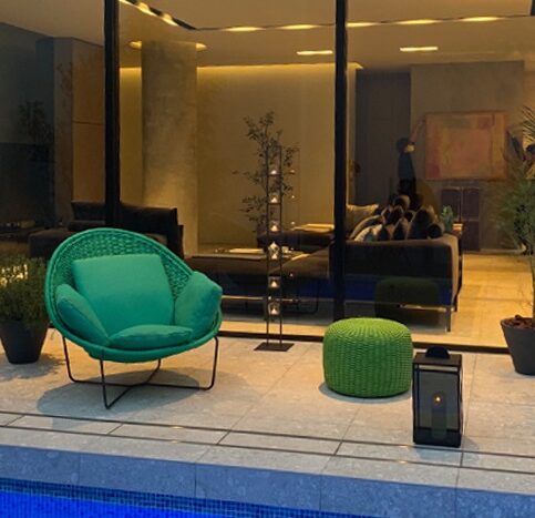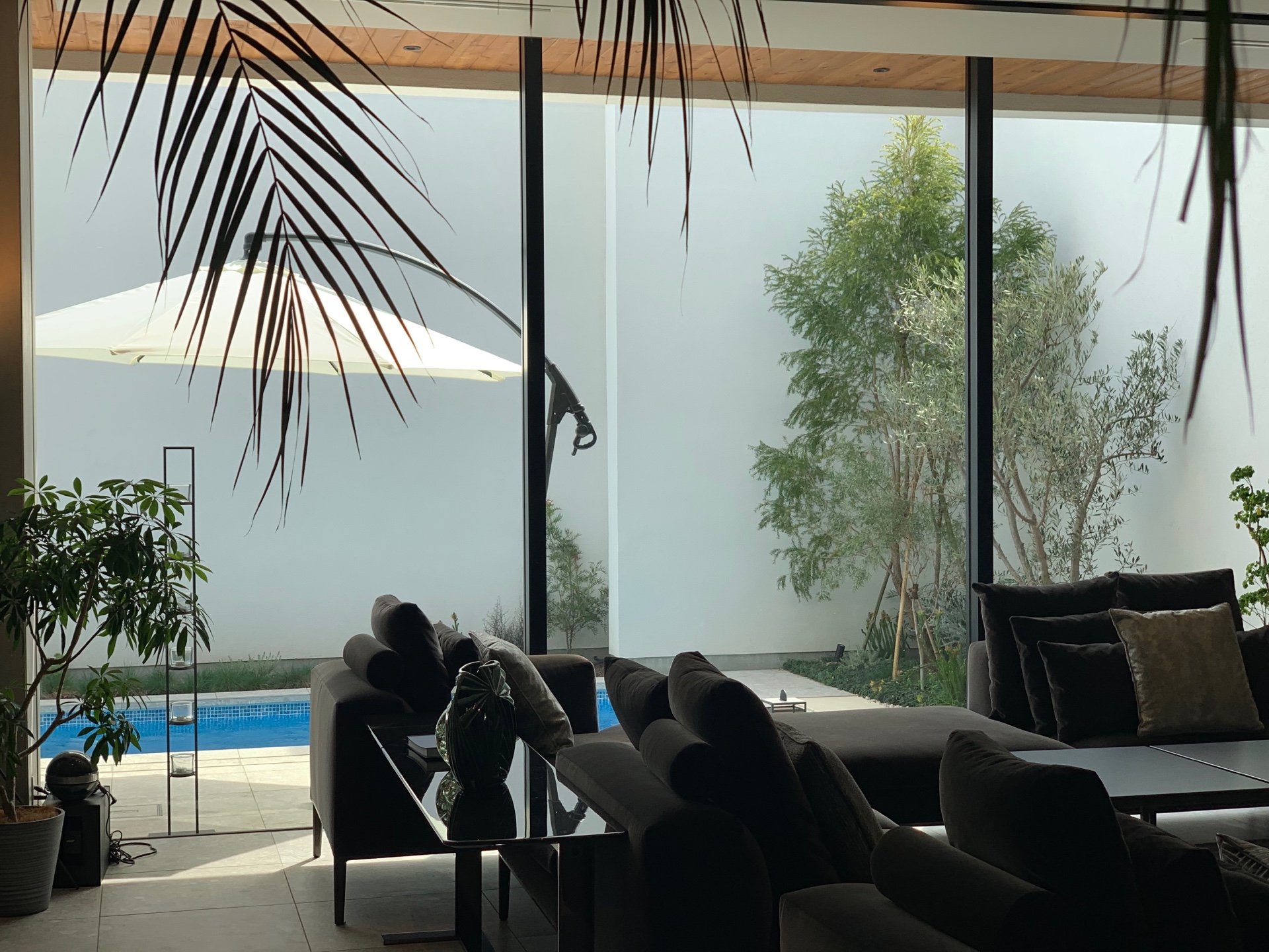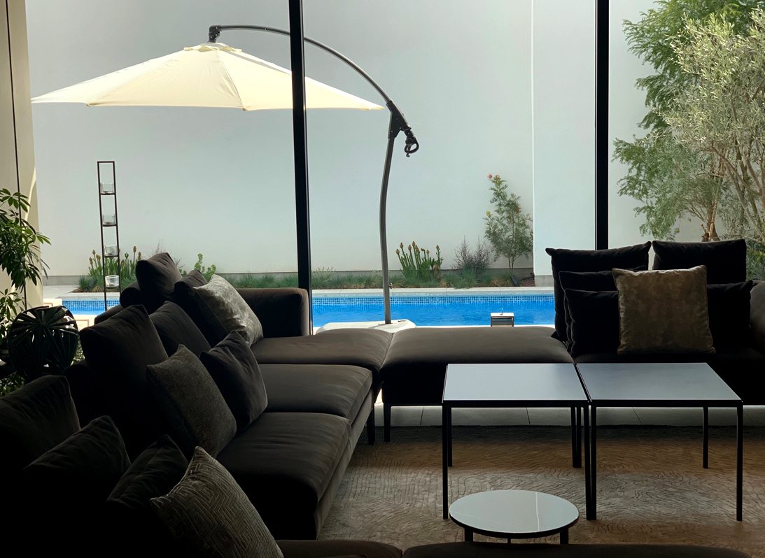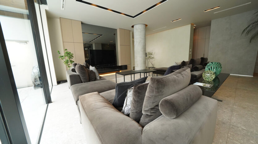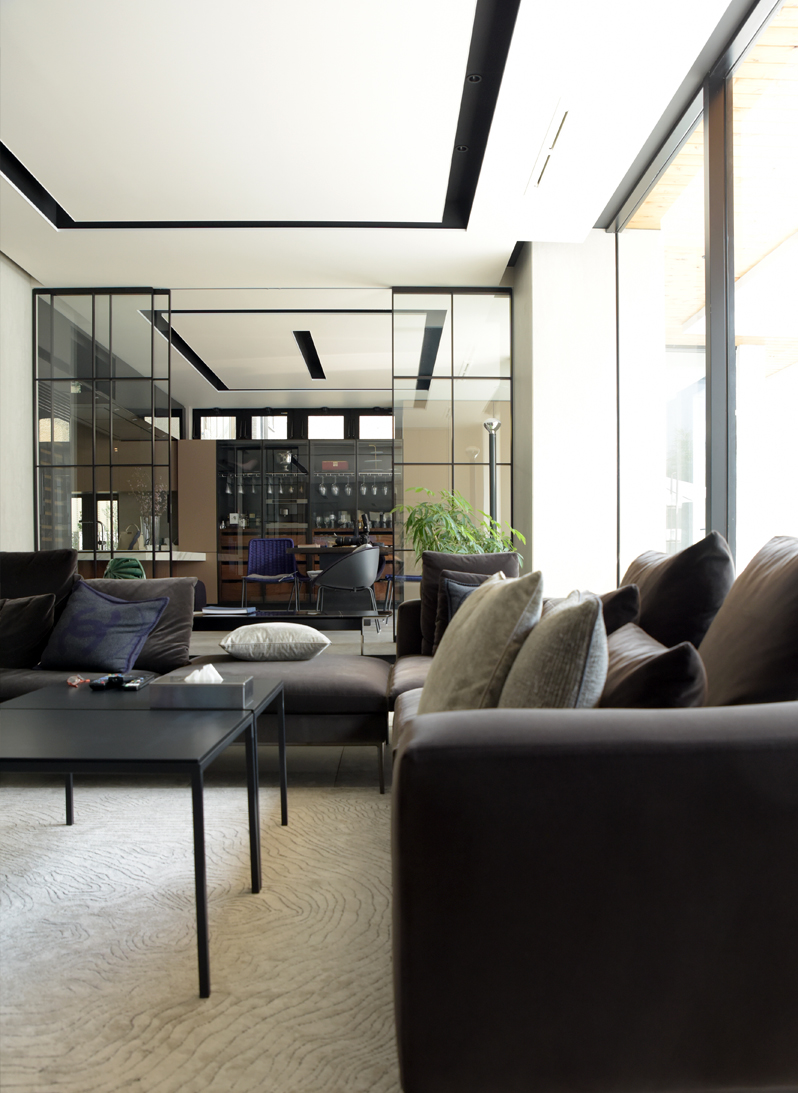 室内は大開口部から自然光が差し込み、室内に陰影を与えています。空間を彩るのは洗練されたインテリアの数々。B&B ITALIAで統一したソファは、グレーのベロアを、Paola Lentiでコーディネートしたダイニングは、一脚ずつ微妙に異なる色をセレクトしたチェアが印象的です。