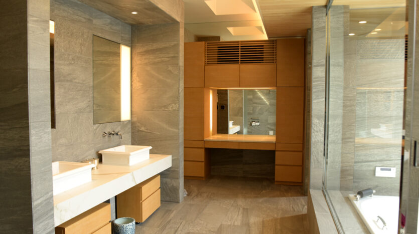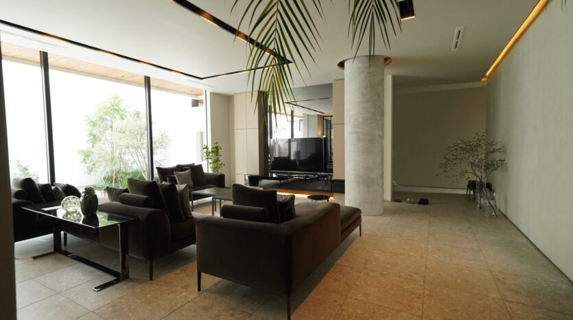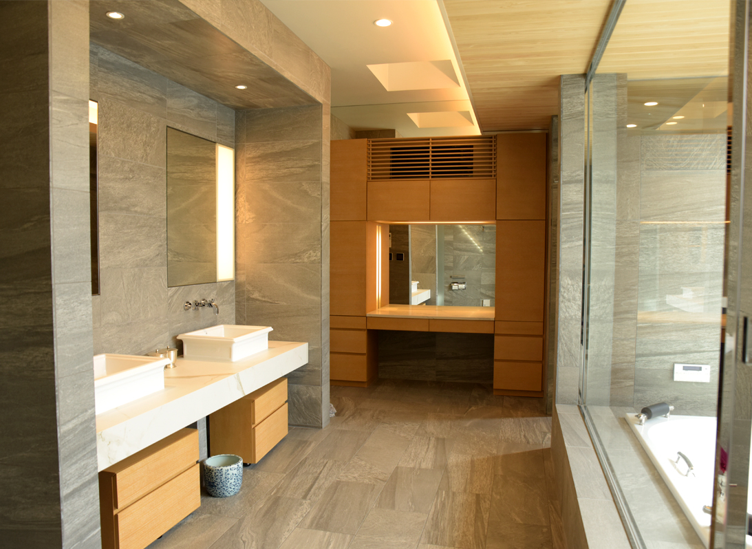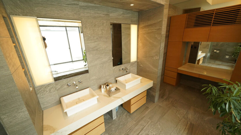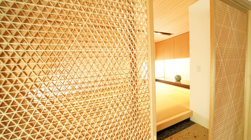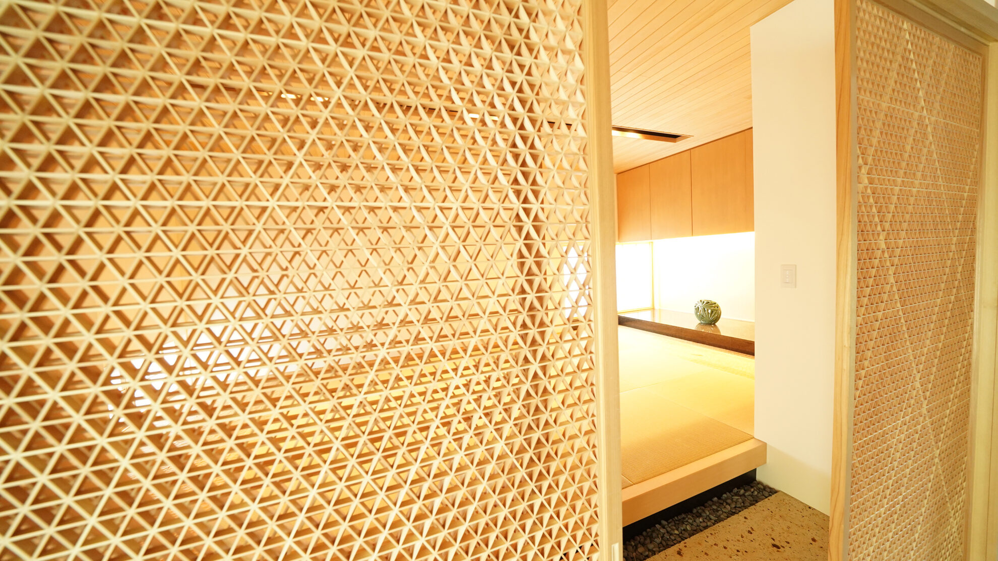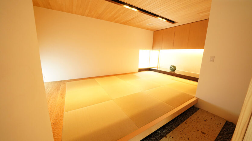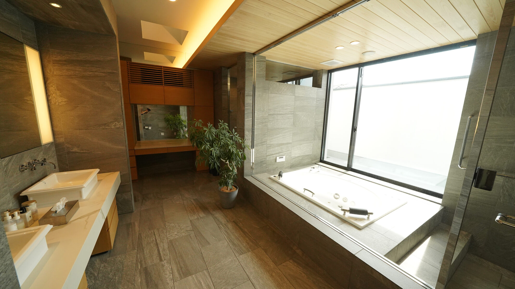 2階は大きな窓の外に清々しい竹が見える絵画のように演出されており、モダンな和風旅館のような佇まいが特徴。大理石バスなどの浴室や踊り場、廊下など、すべての空間にこだわりが光る邸宅です。