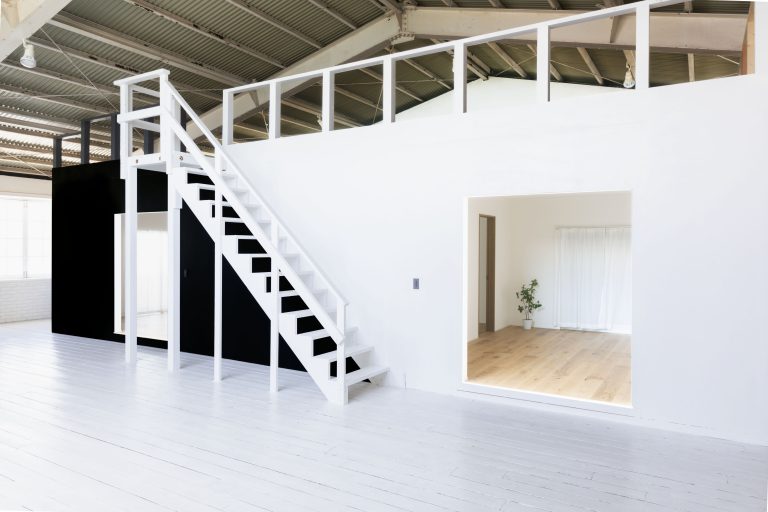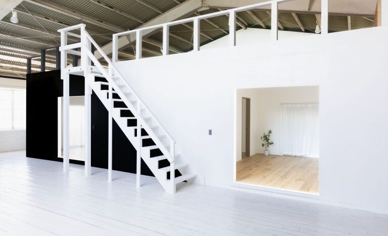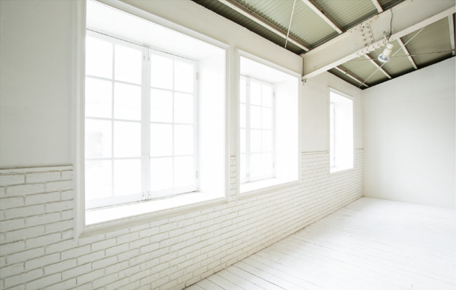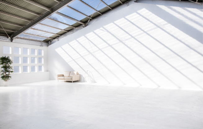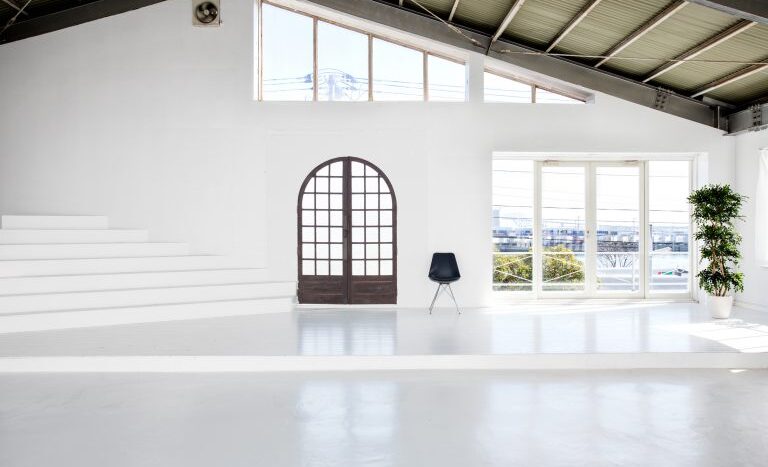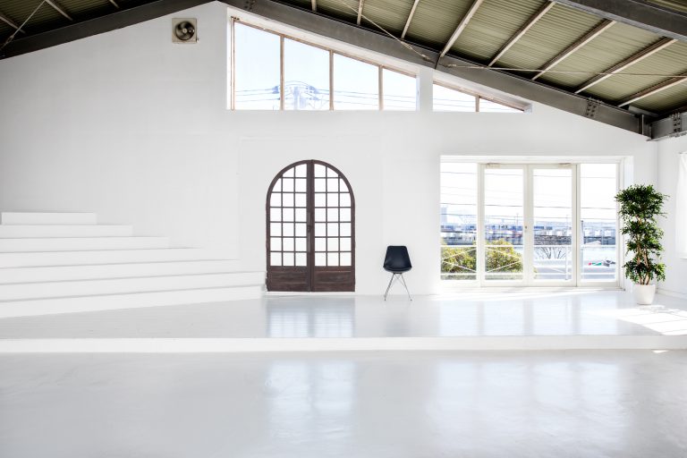 最高5.5mの天井高があり、天窓からも光が降り注ぐ開放感のあるスタジオです。壁面はもちろん床も白で統一され、光が行きわたります。一角には階段を設けてあり、立体感のある画を撮れます。
