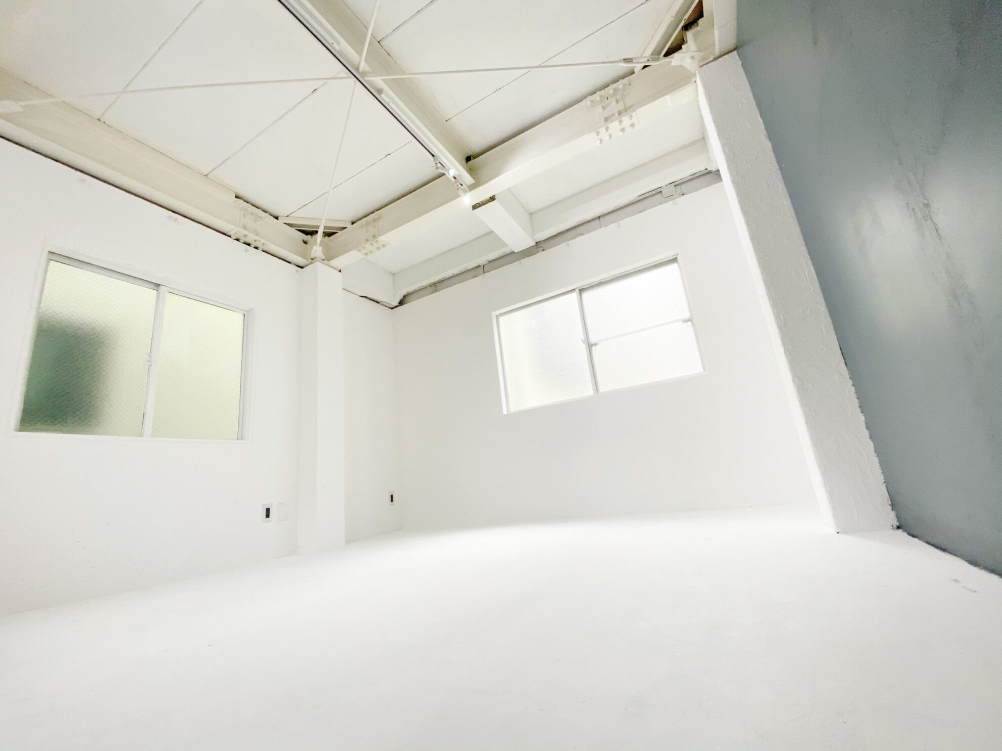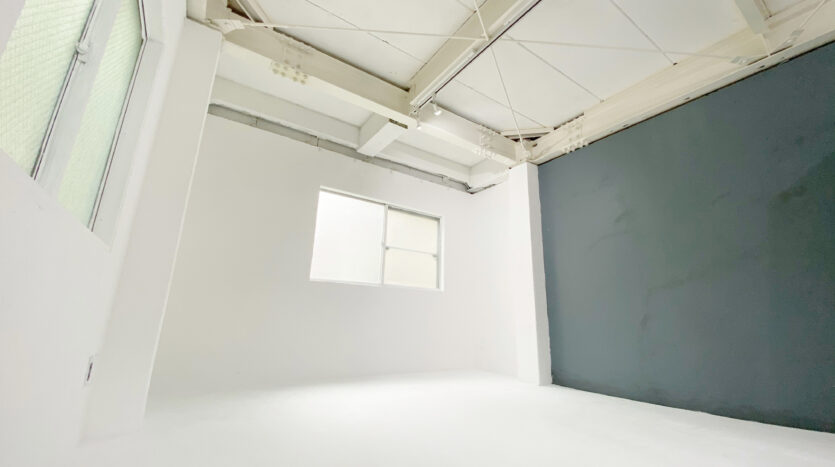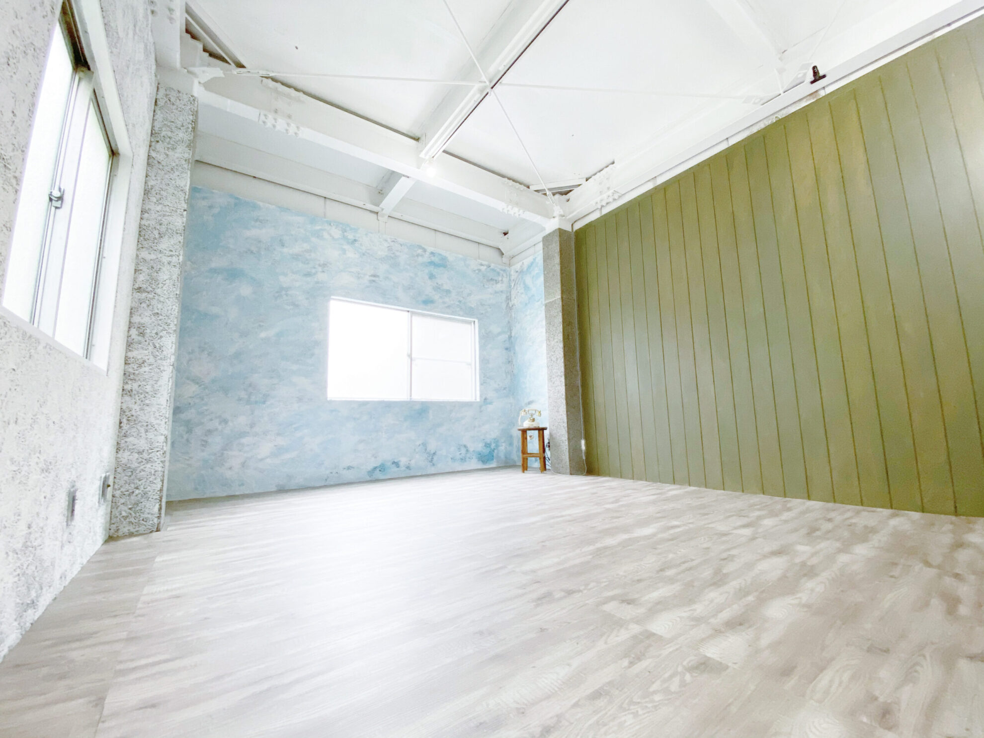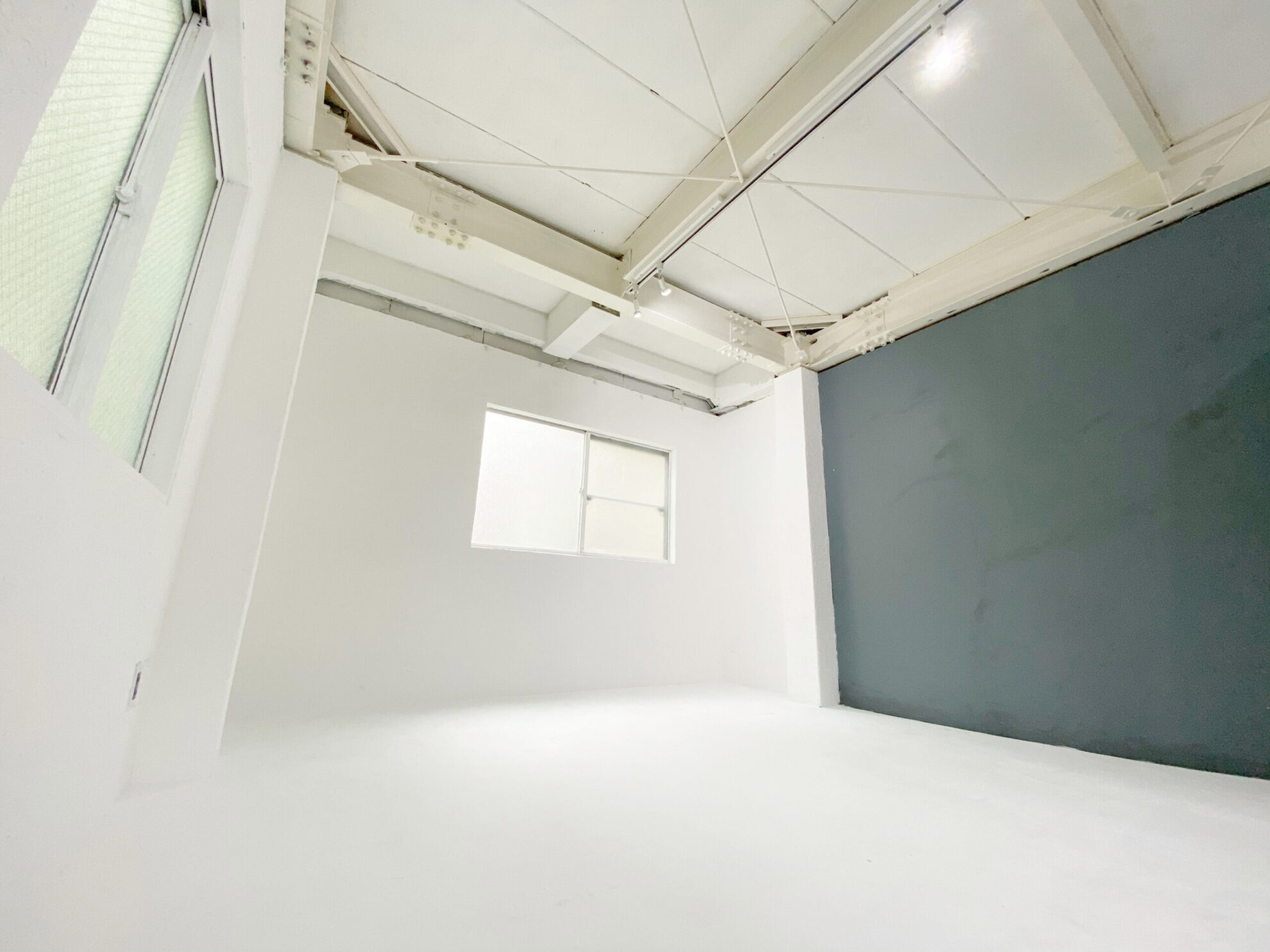 2階と3階がスタジオとなっており、2階は窓付きの白ホリスペース。片面の壁は撮影しやすいグレー壁で、光が回りすぎず使いやすい空間です。3階は、全ての壁面のデザインが違うスペースとなっています。天井高は約3mありライティングにもこだわれます。また、オートポールを使用して背景紙撮影も可能なので、色々な背景色にこだわりたいポートレート撮影やヘアカタログ撮影などに便利なスタジオです。