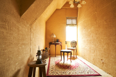 コンクリート打ち放しの壁にアンティークなテイストに仕上げられたスタジオは、自然光があふれる3つのルームに分けられています。