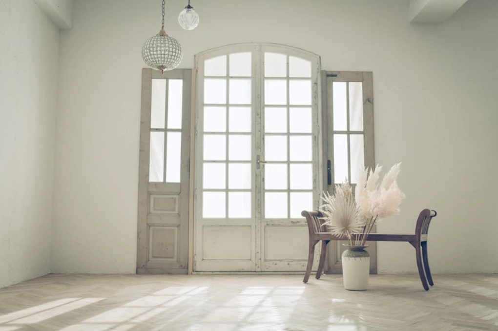 内装は、白壁やウッドフローリングの床、シャビーな窓枠やドアなどで構成されており、ナチュラルな雰囲気を作れます。