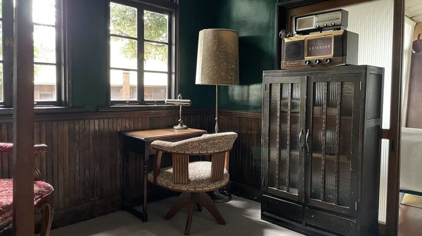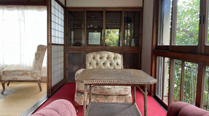 二階は、床の間がある和室と美しい木漏れ日が入るカーペット敷きの縁側があり、洋風アンティークの応接セットが置かれています。他にも多くの厳選されたアンティーク家具や小物が時代を感じさせてくれます。昭和レトロイメージの撮影にはうってつけです。