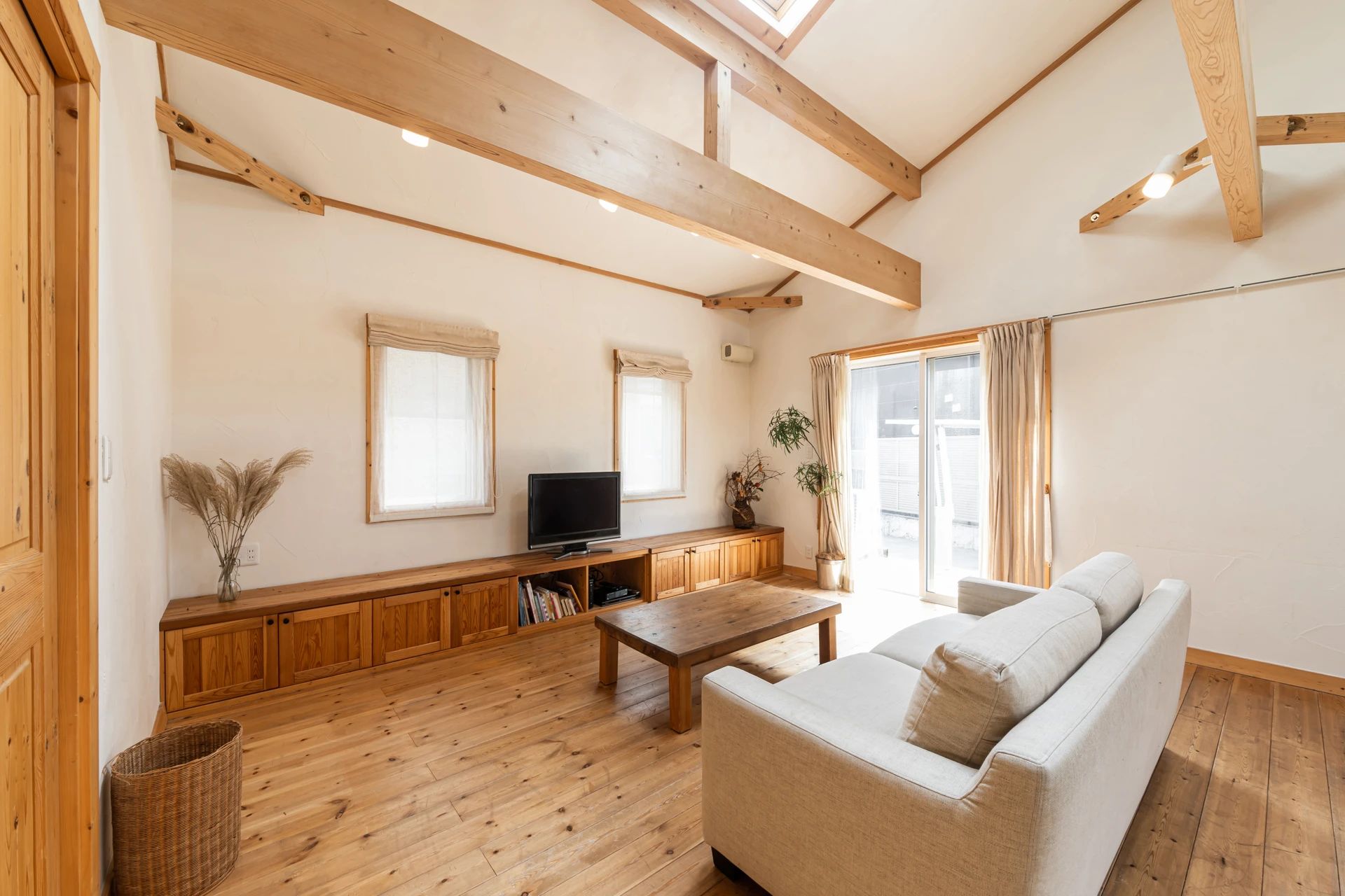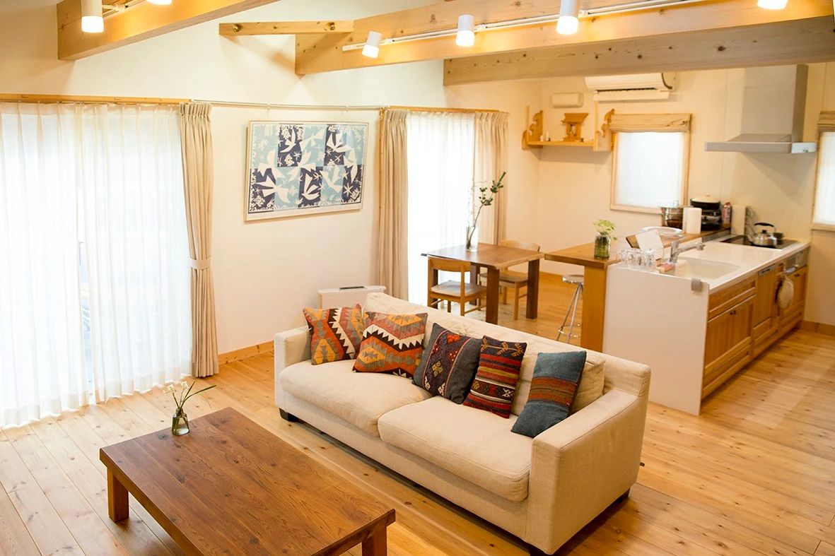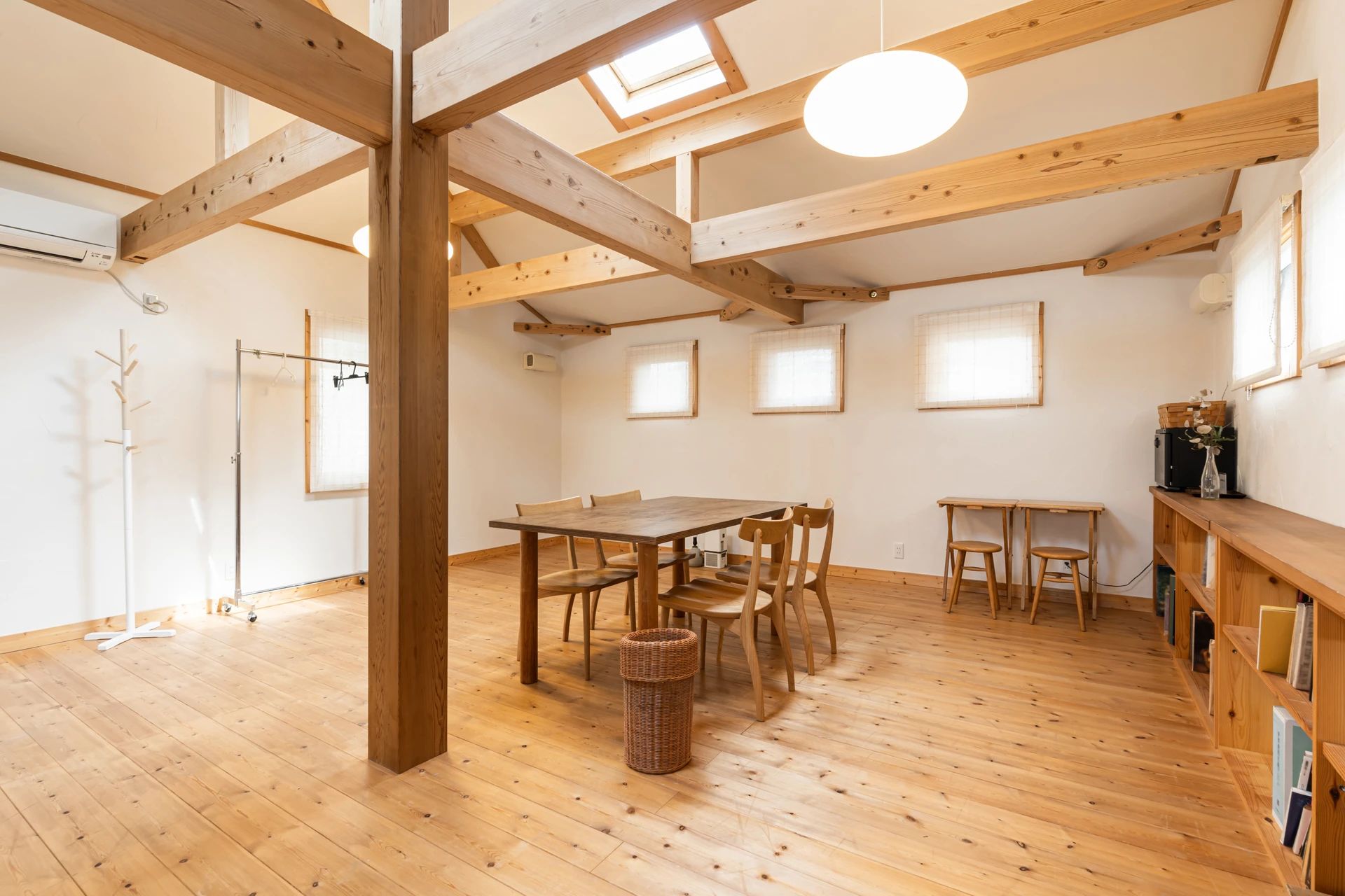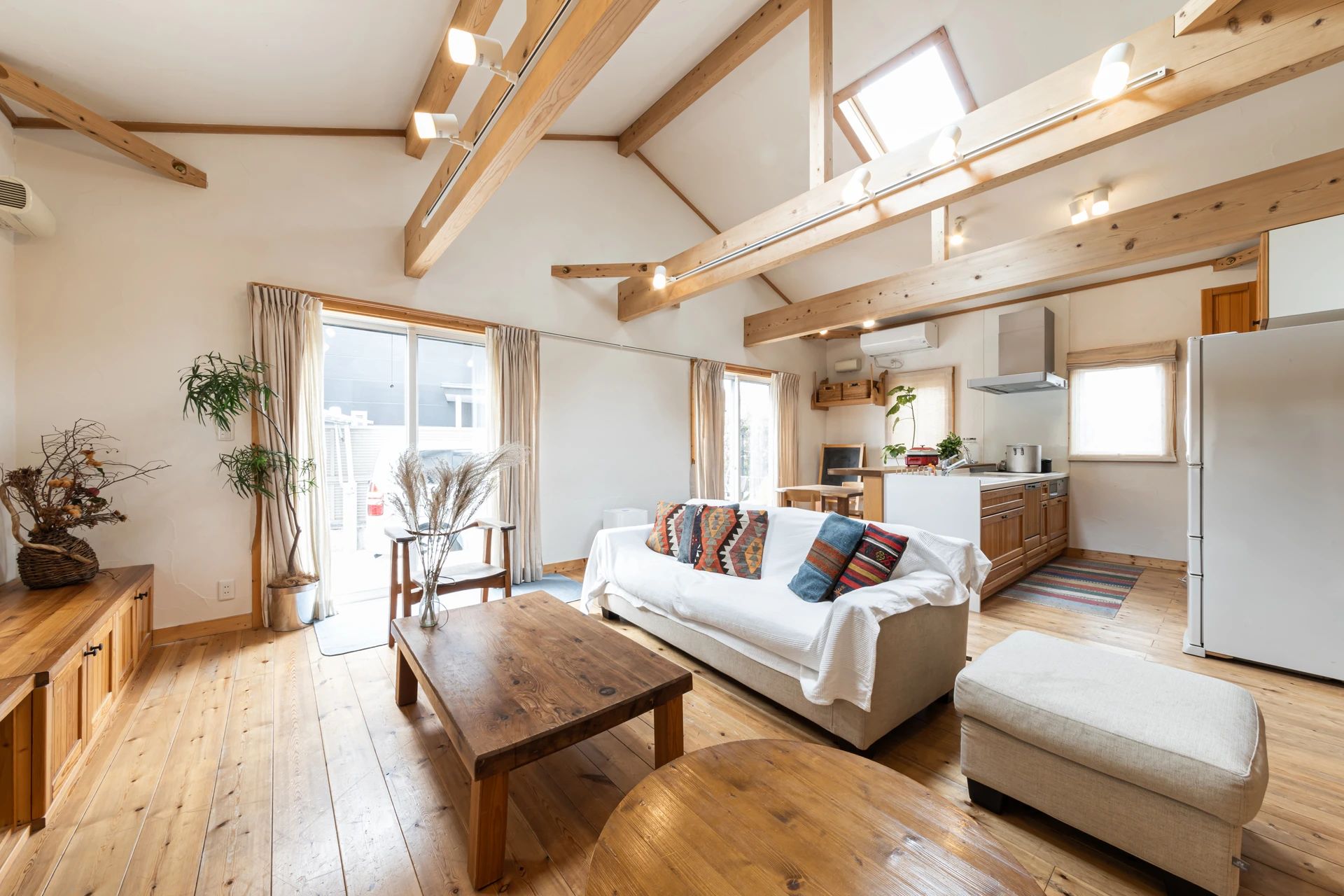 2階建て2LDK 112㎡のスタジオは大きな掃きだし窓や腰窓と天窓から入るたっぷりな自然光がカナダ産檜のレッドシダーなど、自然素材にこだわった内装に映え温かみを感じさせます。自然素材へのこだわりは、露出した柱や梁、階段などの構造材、造り付けのキッチンカウンターや棚、扉にまで及ぶ徹底ぶりで、置かれている家具も自然素材にこだわっています。これらが作り出すナチュラルテイストは、都内でありながら、閑静なリゾート地にある別荘や山小屋のようでもあり、リビングやキッチンを使った生活シーンだけでなく、バカンスなどさまざまなシチュエーションでの撮影が可能です。