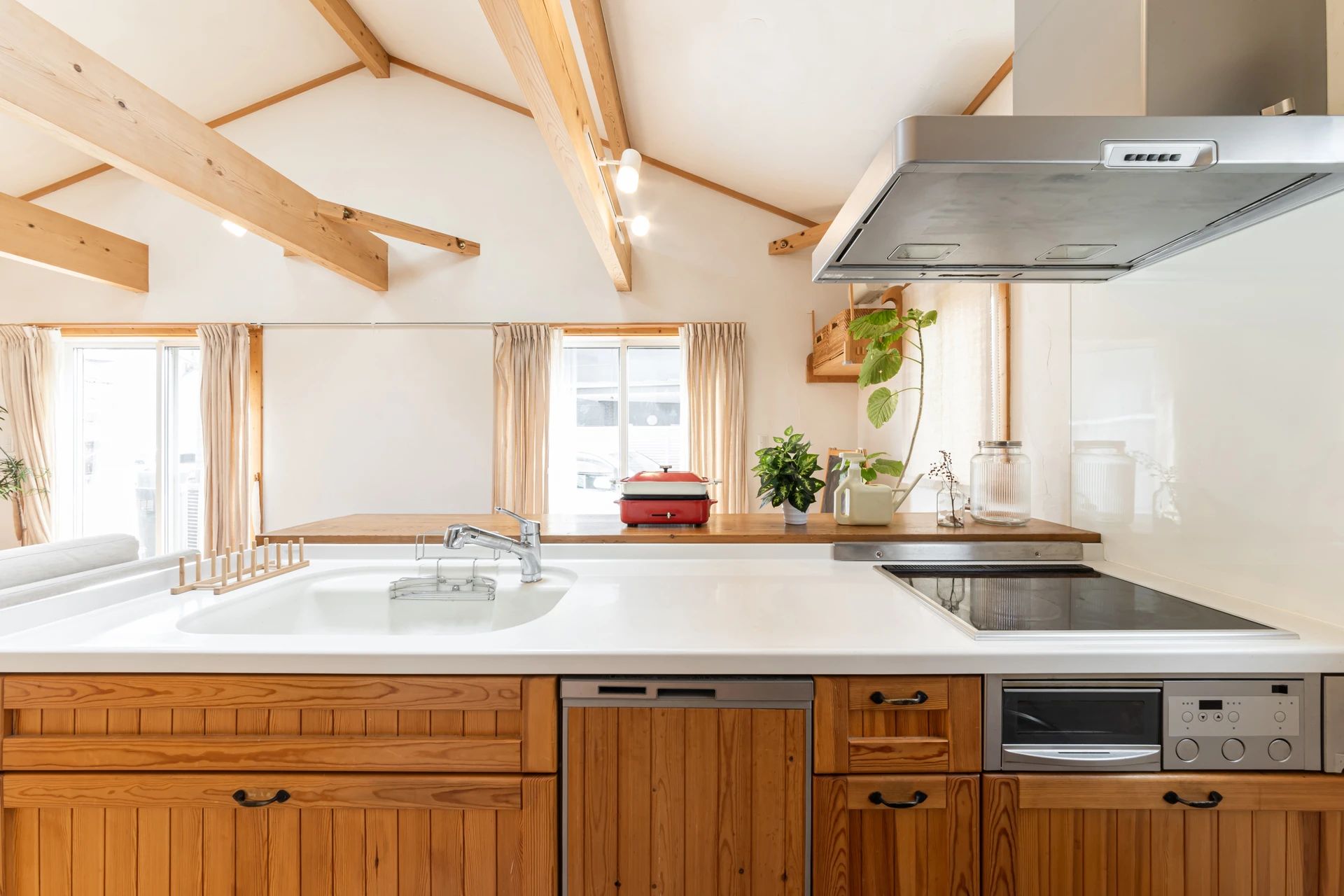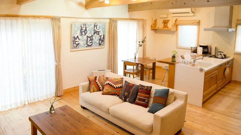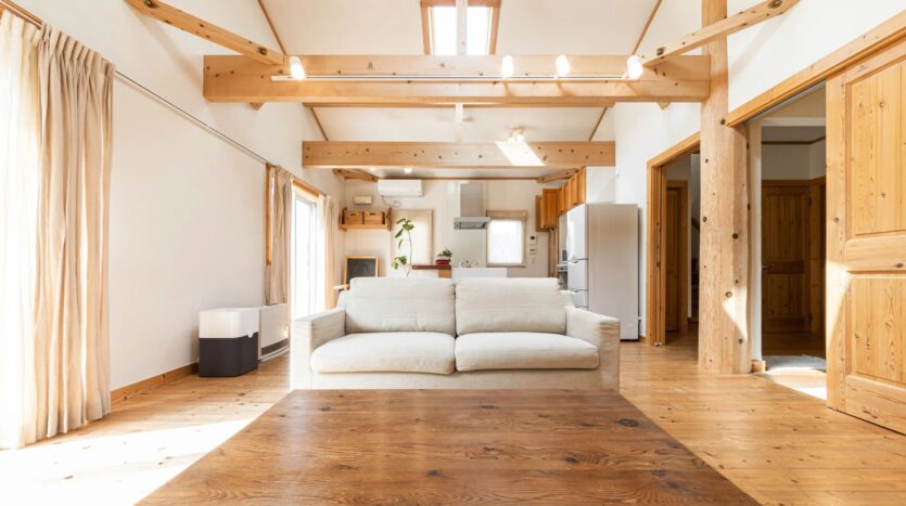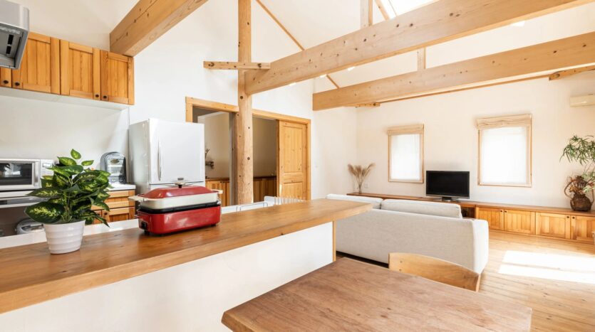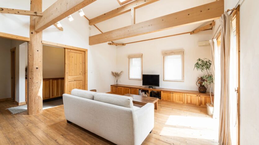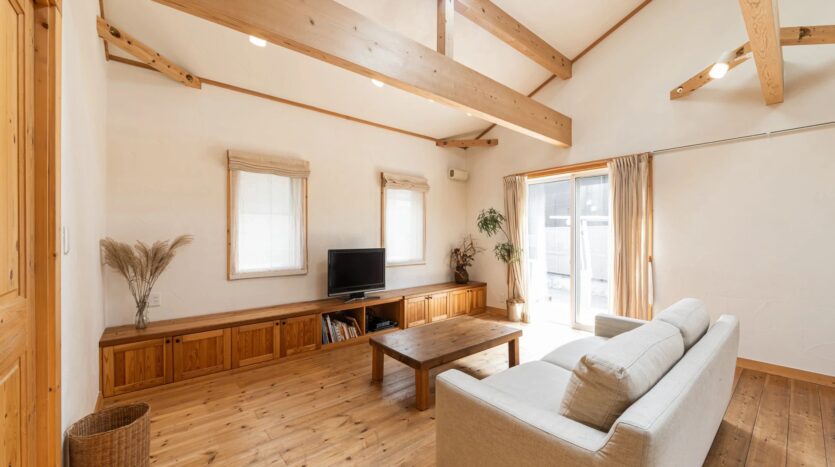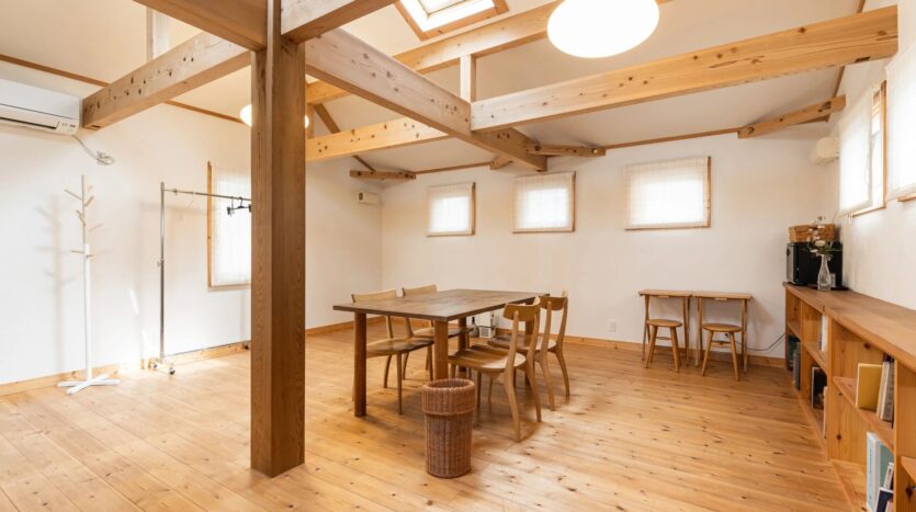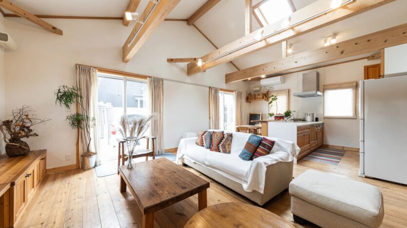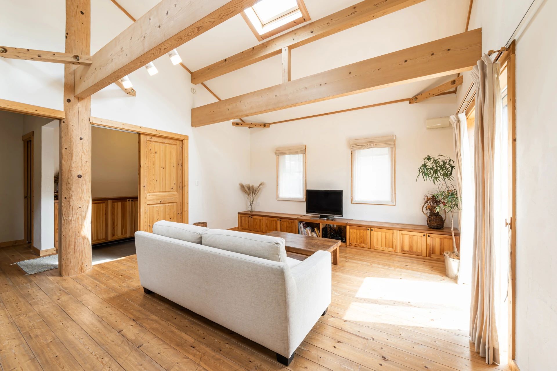 2階建て2LDK 112㎡のスタジオは大きな掃きだし窓や腰窓と天窓から入るたっぷりな自然光がカナダ産檜のレッドシダーなど、自然素材にこだわった内装に映え温かみを感じさせます。自然素材へのこだわりは、露出した柱や梁、階段などの構造材、造り付けのキッチンカウンターや棚、扉にまで及ぶ徹底ぶりで、置かれている家具も自然素材にこだわっています。これらが作り出すナチュラルテイストは、都内でありながら、閑静なリゾート地にある別荘や山小屋のようでもあり、リビングやキッチンを使った生活シーンだけでなく、バカンスなどさまざまなシチュエーションでの撮影が可能です。