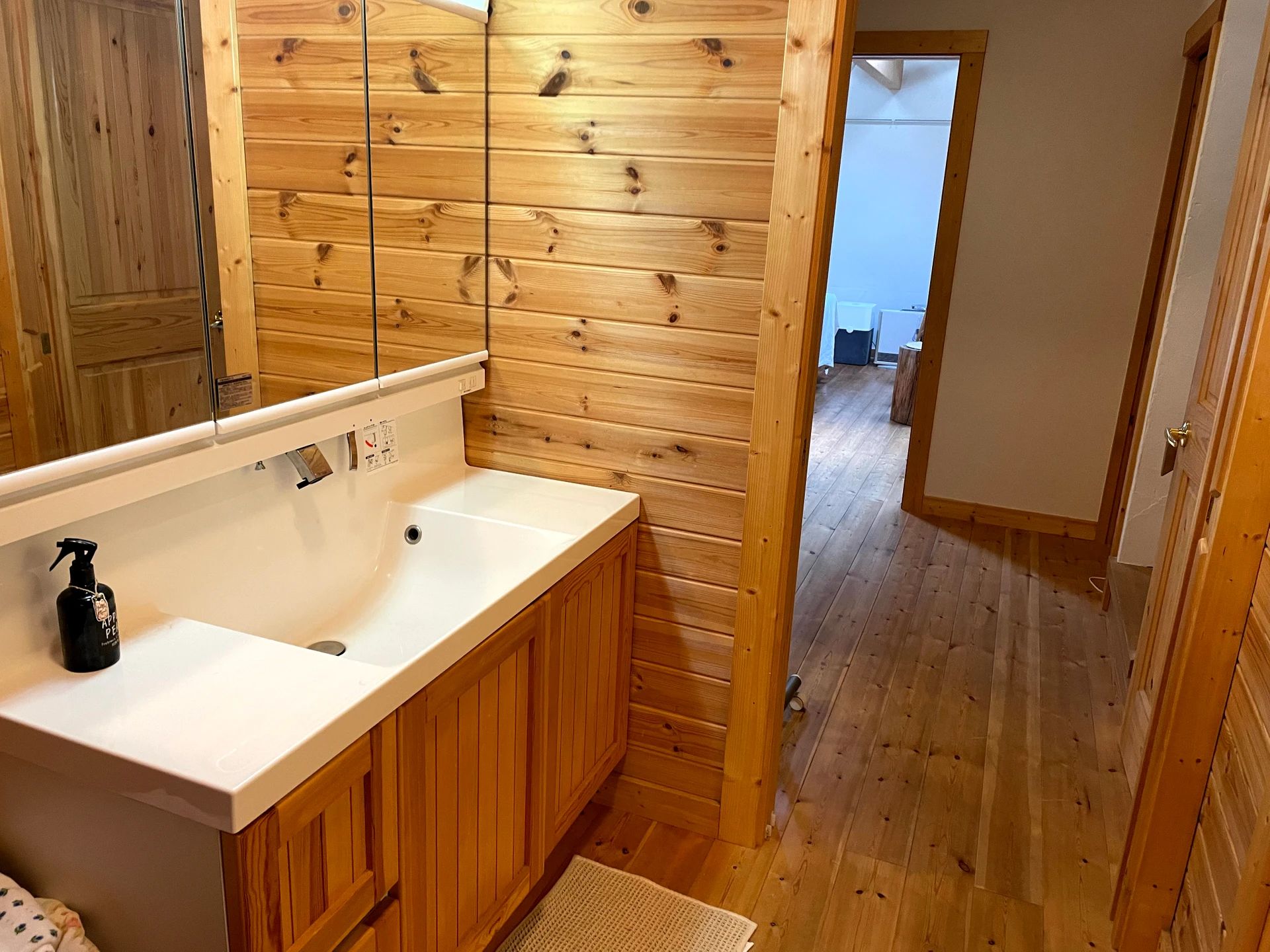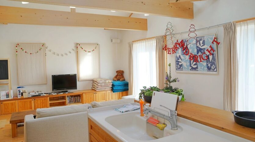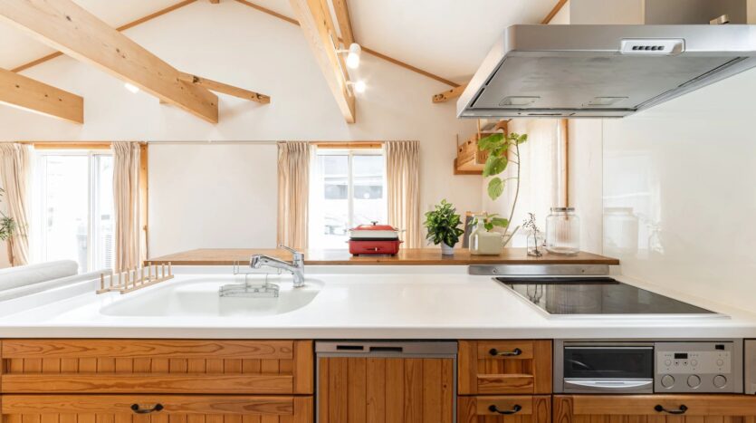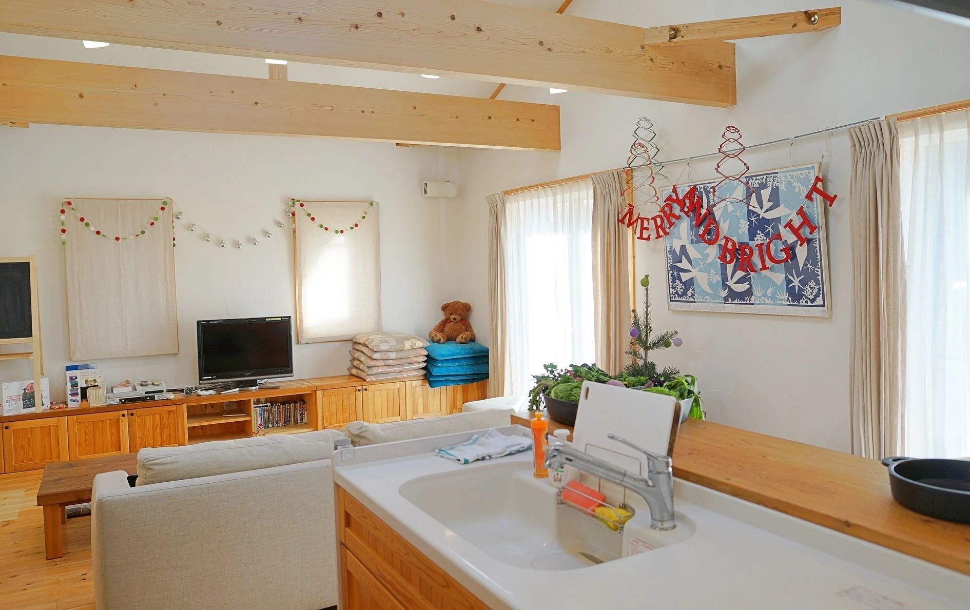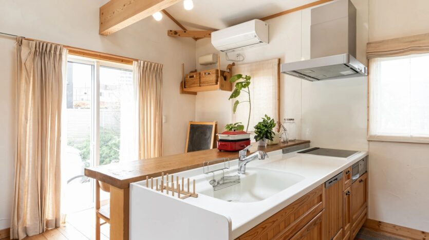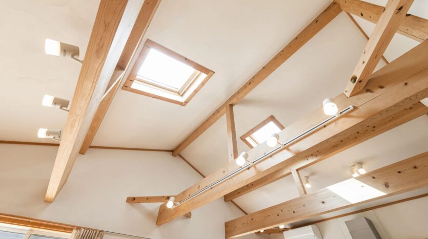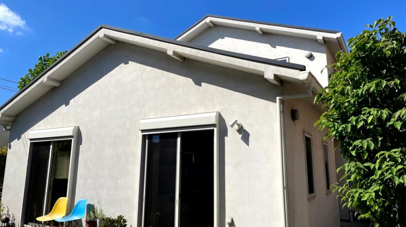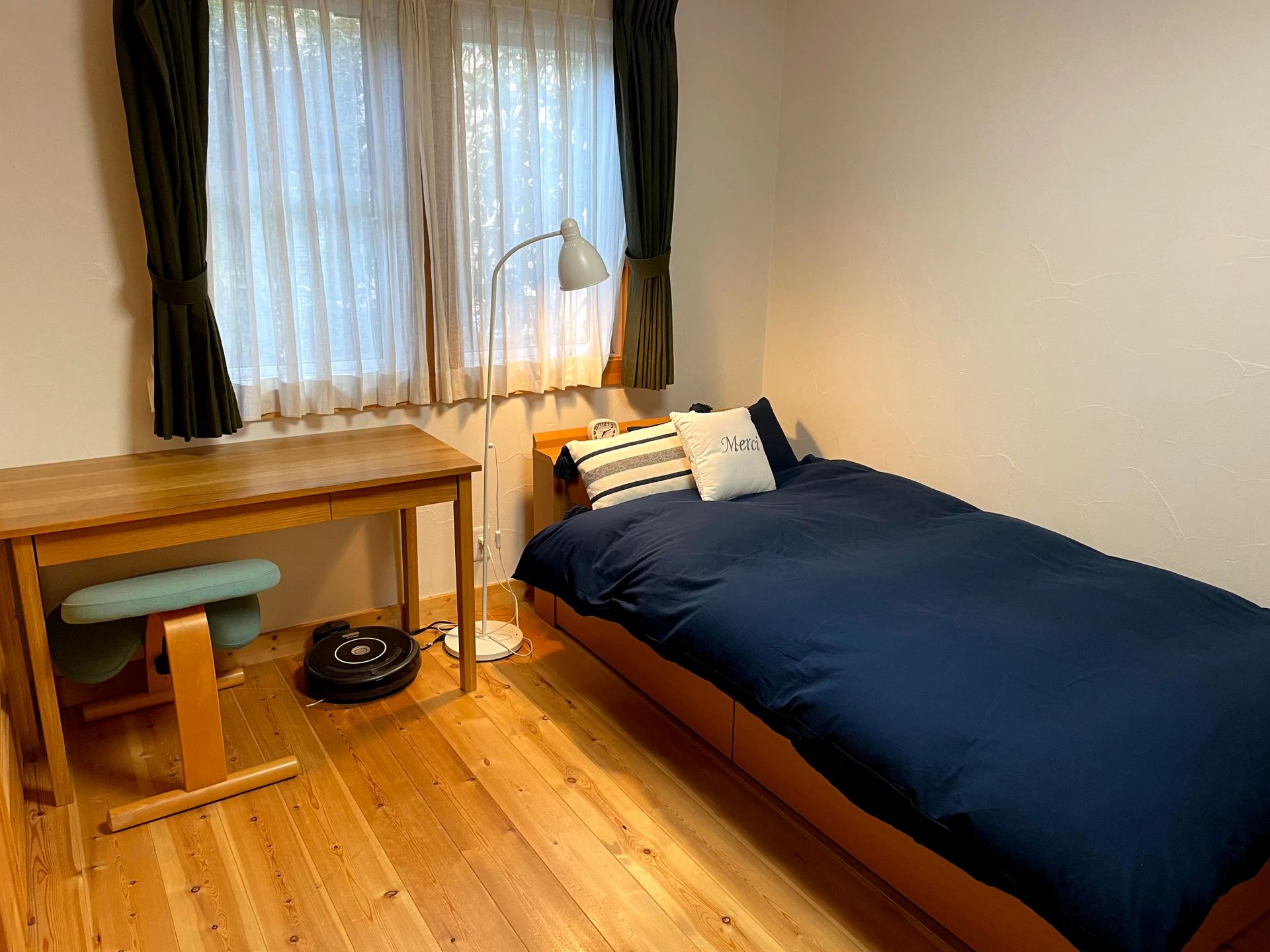 2階建て2LDK 112㎡のスタジオは大きな掃きだし窓や腰窓と天窓から入るたっぷりな自然光がカナダ産檜のレッドシダーなど、自然素材にこだわった内装に映え温かみを感じさせます。自然素材へのこだわりは、露出した柱や梁、階段などの構造材、造り付けのキッチンカウンターや棚、扉にまで及ぶ徹底ぶりで、置かれている家具も自然素材にこだわっています。これらが作り出すナチュラルテイストは、都内でありながら、閑静なリゾート地にある別荘や山小屋のようでもあり、リビングやキッチンを使った生活シーンだけでなく、バカンスなどさまざまなシチュエーションでの撮影が可能です。