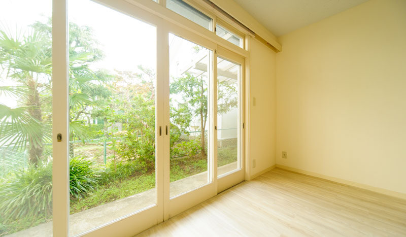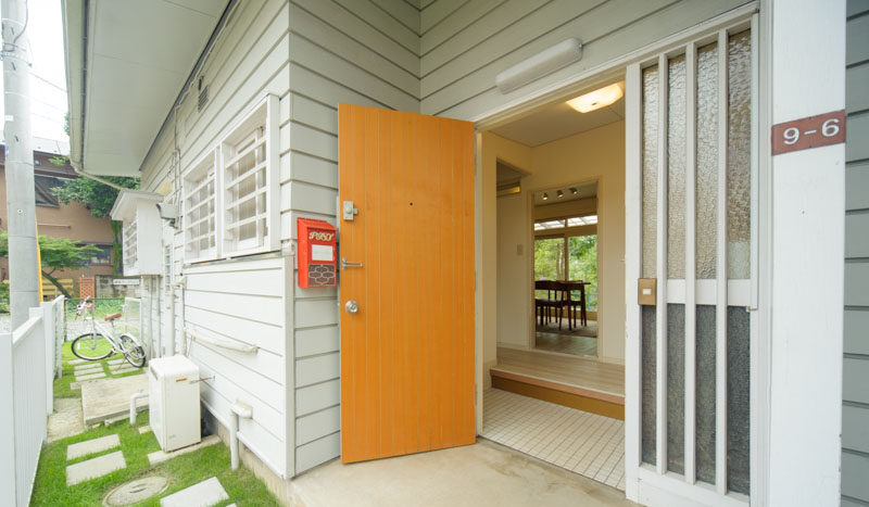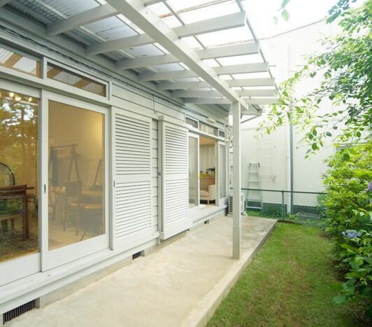 1965年(昭和40年)に建てられた昭和モダンの小さな白い平屋の一軒家は、南に面した大きな掃き出し窓からたっぷりの自然光が降りそそぎます。海の家風に横張された白い板壁とテラス、緑たっぷりの庭は、季節を通して、初夏の雰囲気を醸し出しています。