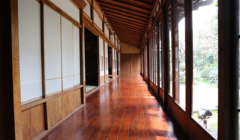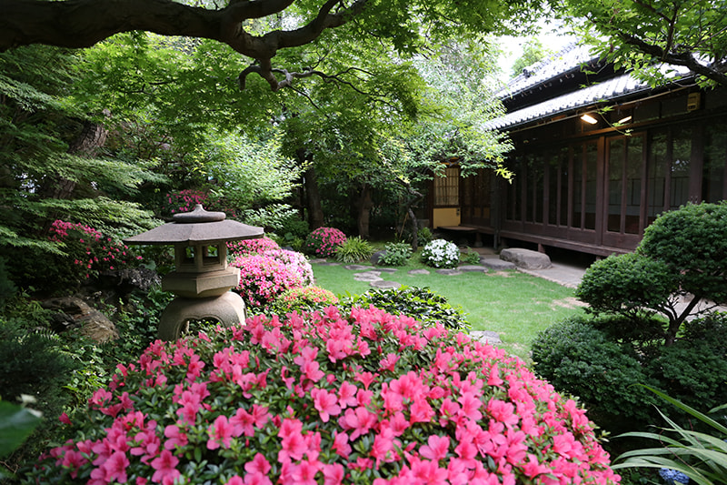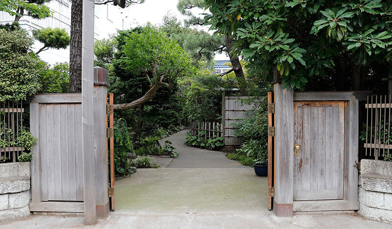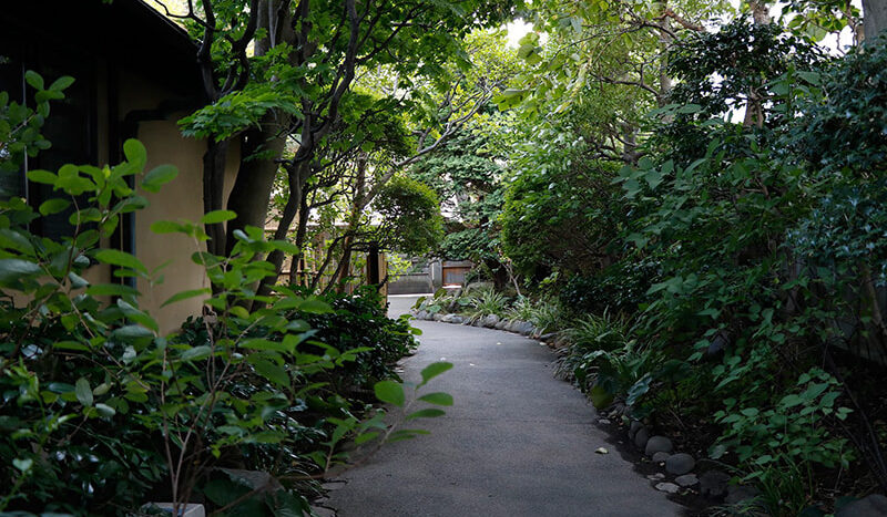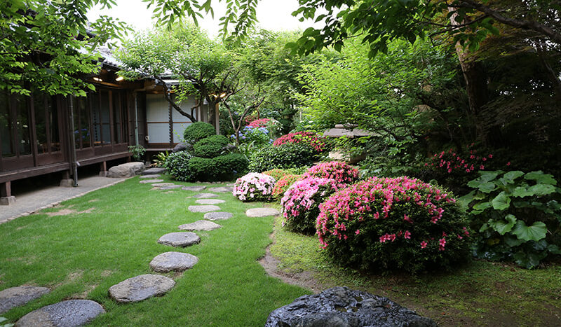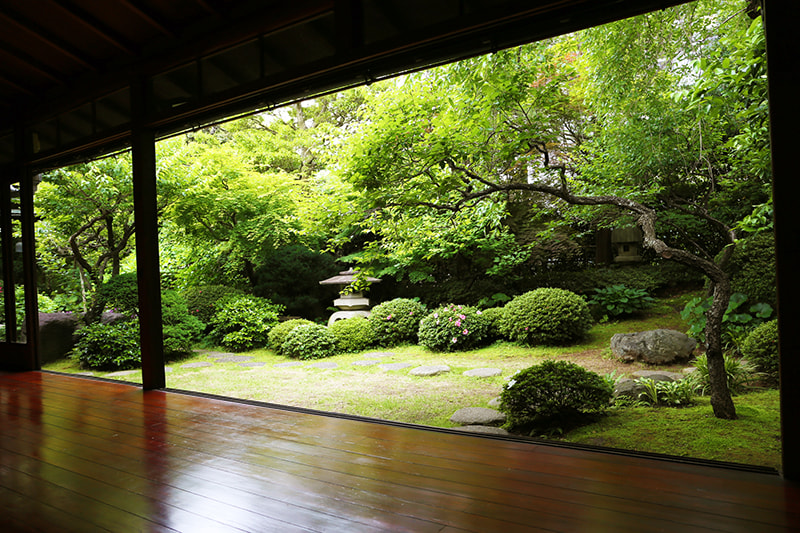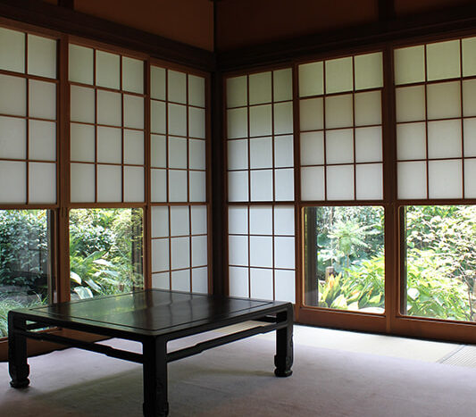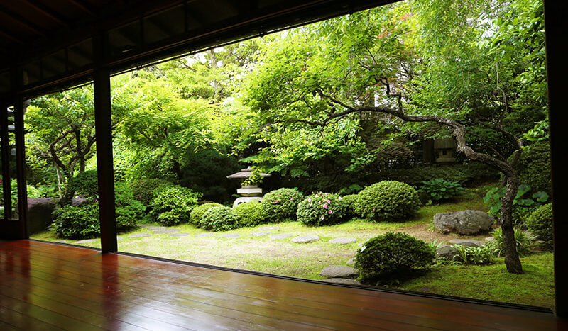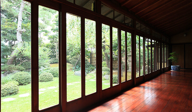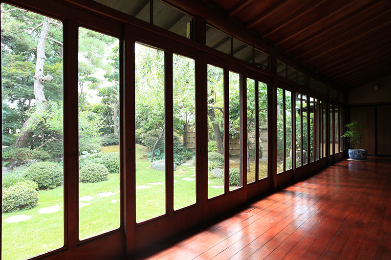静かでゆったりとした時間が流れる木々の生い茂った庭園に囲まれた邸宅は、縁側にガラス越しにやわらかな自然光がそそぎます。書院造の和室に建て付けられた障子戸や玄関廻りの見事な格子戸などの内装品から調度品にいたるまで、まるでタイムスリップしたような空間です。石灯籠や手水鉢が置かれ、椿や梅、しだれ桜、ツツジ、紫陽花、紅葉など四季を感じることができる庭園は縁側から楽しむことができます。