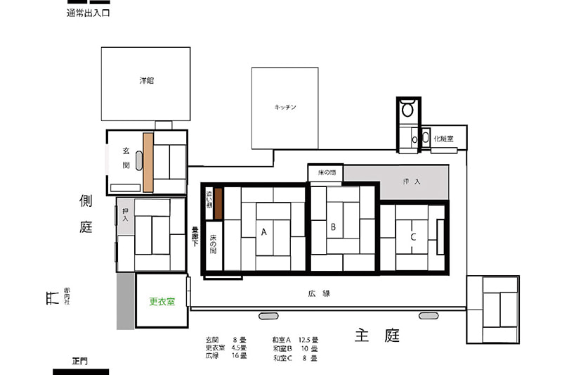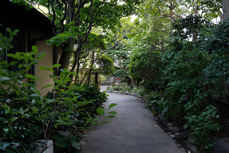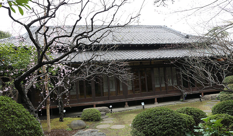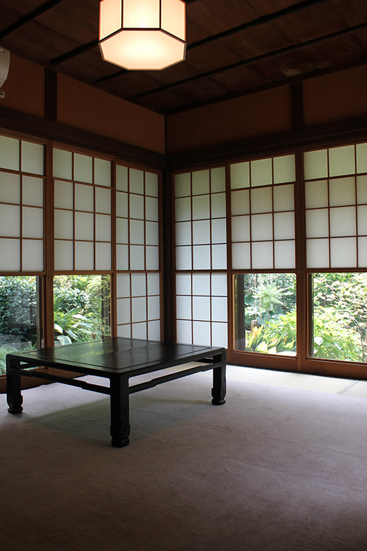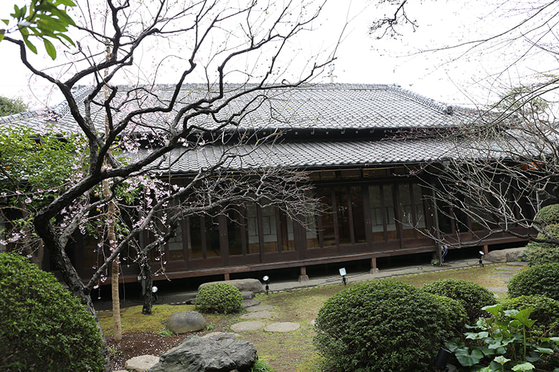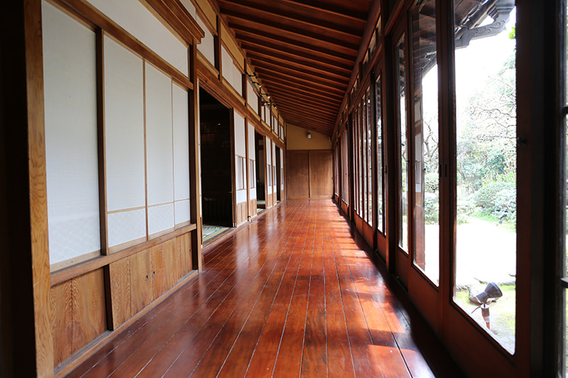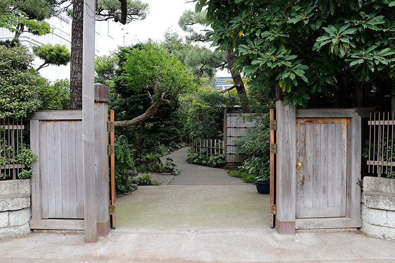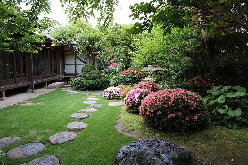 静かでゆったりとした時間が流れる木々の生い茂った庭園に囲まれた邸宅は、縁側にガラス越しにやわらかな自然光がそそぎます。書院造の和室に建て付けられた障子戸や玄関廻りの見事な格子戸などの内装品から調度品にいたるまで、まるでタイムスリップしたような空間です。石灯籠や手水鉢が置かれ、椿や梅、しだれ桜、ツツジ、紫陽花、紅葉など四季を感じることができる庭園は縁側から楽しむことができます。