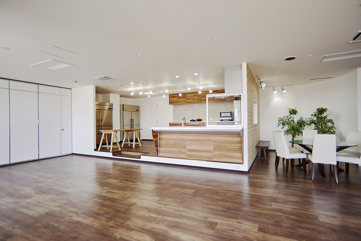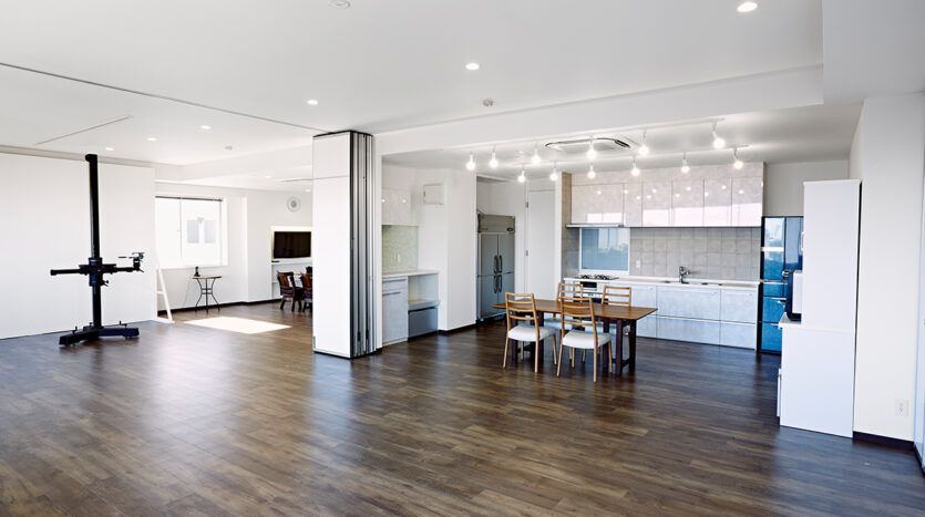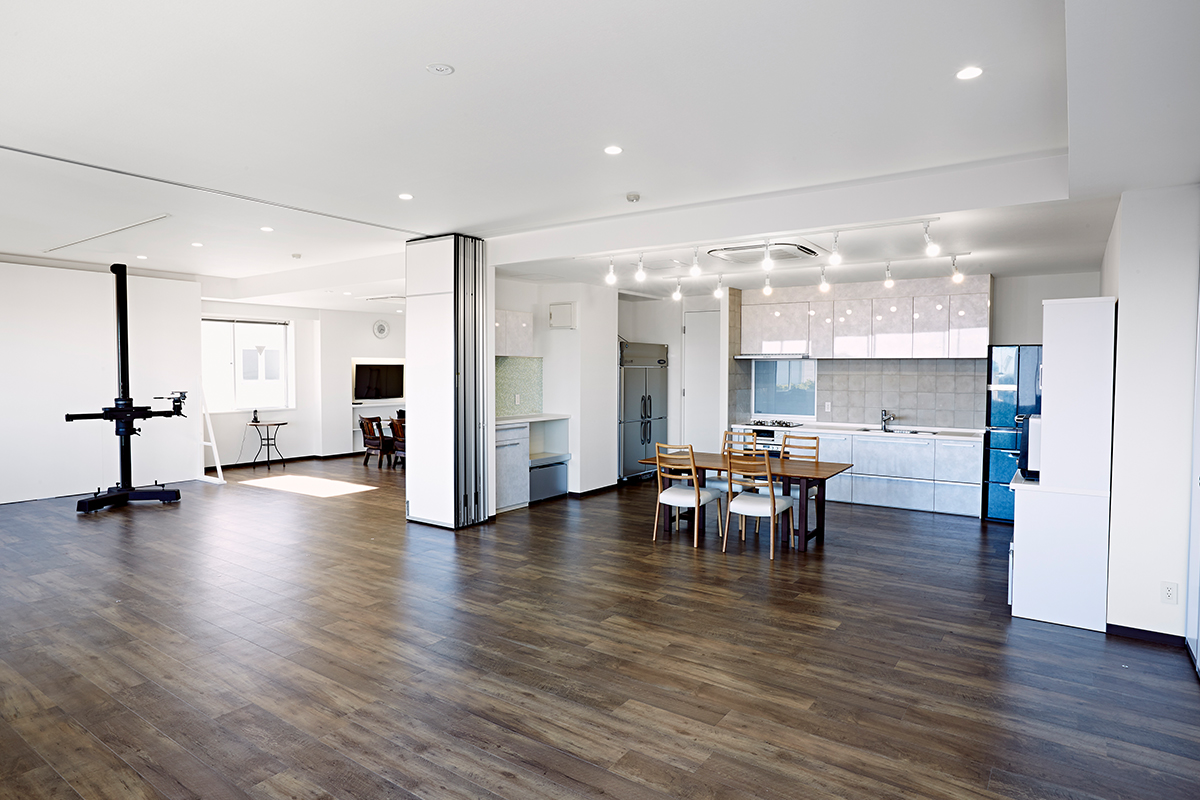 3階に自動昇降のライティング設備を整えた本格的な白ホリスタジオ、5階に2つのシステムキッチンを備えたスタジオがあります。