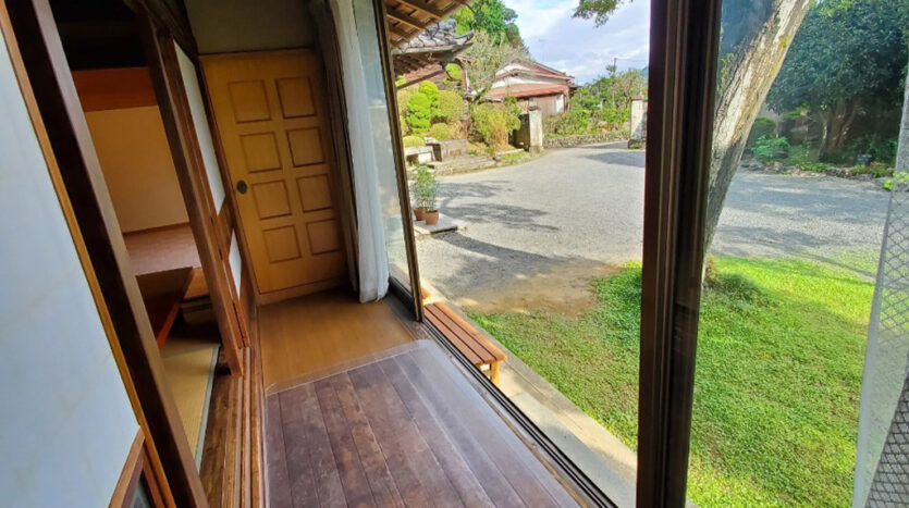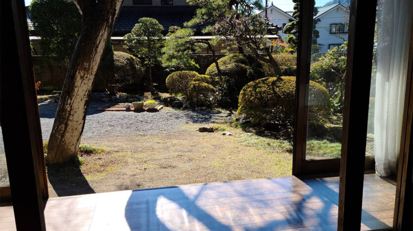 建屋の周りには、見事に剪定された植木や井戸がある庭、畑、物置、蔵、防空壕があり、裏山のある風景を撮影することができます。