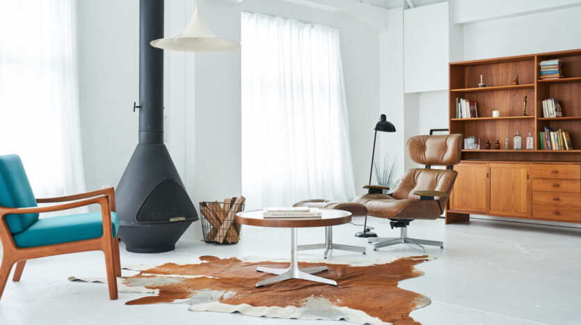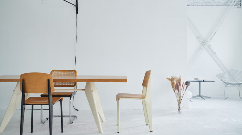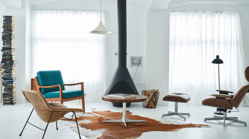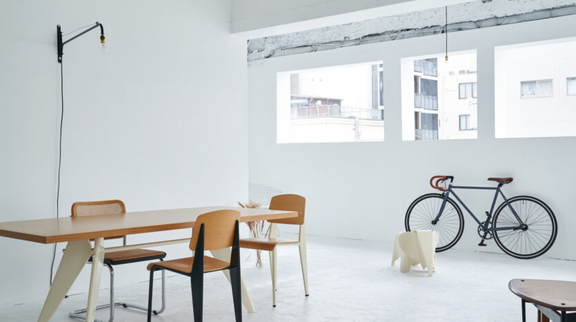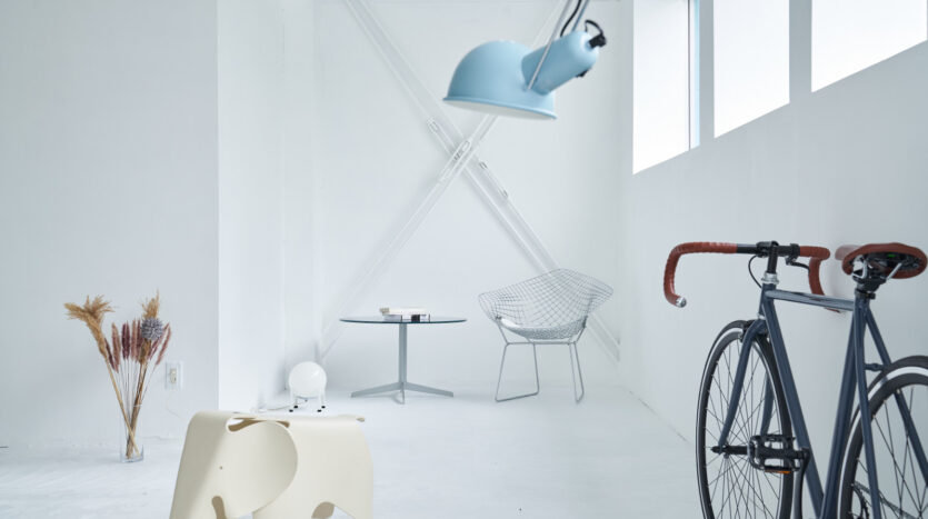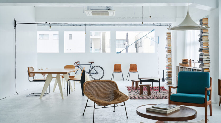 広さ94㎡の空間はモルタルの床壁ともに真っ白に仕上げられ、窓からあふれる自然光が白を際立たせてくれます。デンマークの家具デザイナー、ハンス・ウェグナーによるシェルフ、Jean Prouveのテーブルやknollのダイヤモンドチェア、Fog and morupのランプなど、近代から現代のヨーロッパのデザイナー達による個性的な空間は、お洒落な家具のショールームのようでスタイリッシュ・モダンです。
