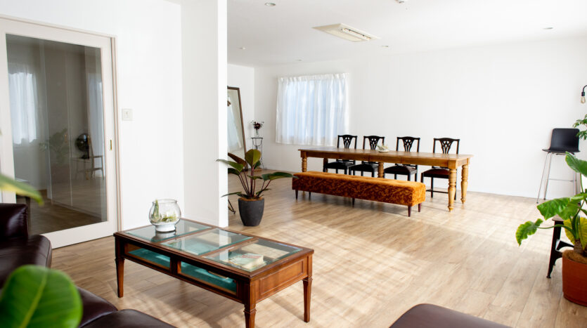 1階29畳のリビングダイニングは南側の約30坪の庭に面したテラスから自然光があふれ、淡いカラーのフローリングにホワイトクロスの壁と天井で明るく広々としたスペース。ダークブラウン系のソファセットとダイニングチェアがアクセントとなり、背景を引き締めます。キッチンスペースは、U型のホワイト色のシステムキッチンを取り入れ作業性が高く、清潔感があります。