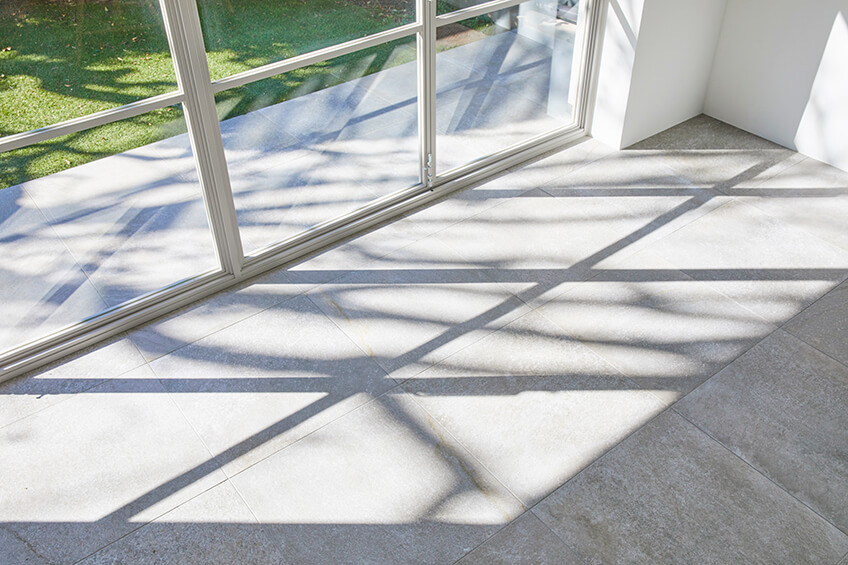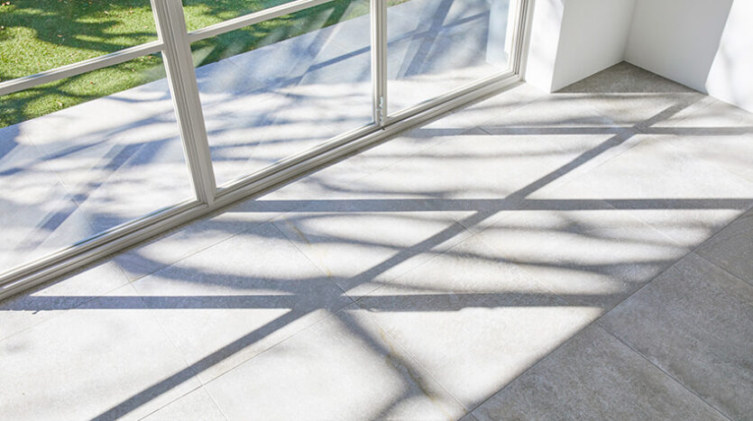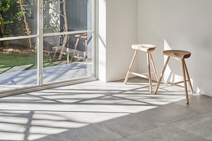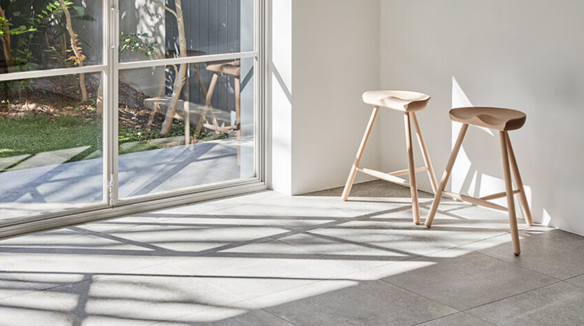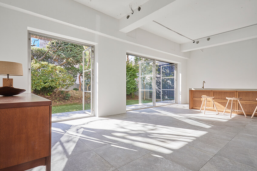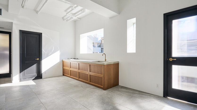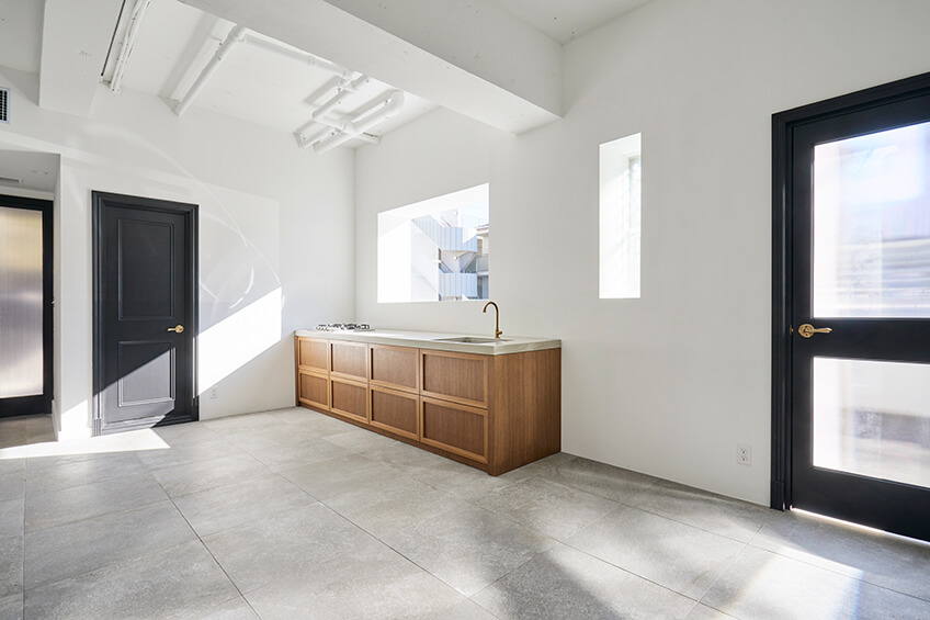 日中を通して手入れのいきとどいた庭木からの木洩れ日が優しくふりそそぐメインルームは、海外の邸宅のようなモルタル状の大判タイルと3mの天井高が開放的なイメージを演出します。床タイルは大きな窓を開放するこでテラスまで繋がり、上質なテラスルームのような空間となります。ナチュラル素材を大切にした家具類が調和し、ダークカラー色の建具類がアクセントとなることで心地よい中にもメリハリのあるスペースとなっています。さらに可動できる大型のカウンターキッチンが撮影シチュエーションの幅を広げます。
