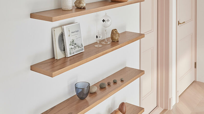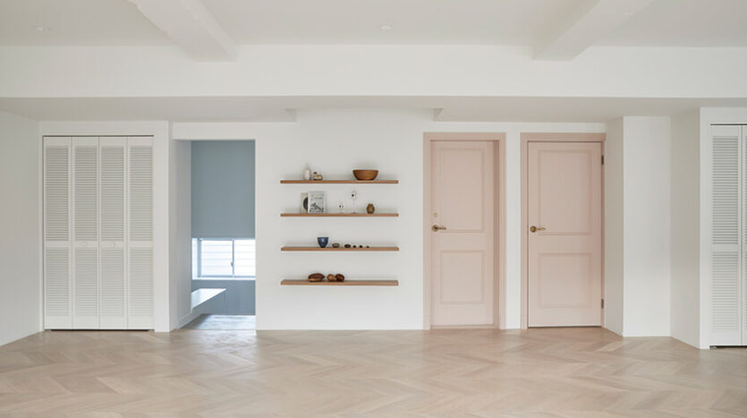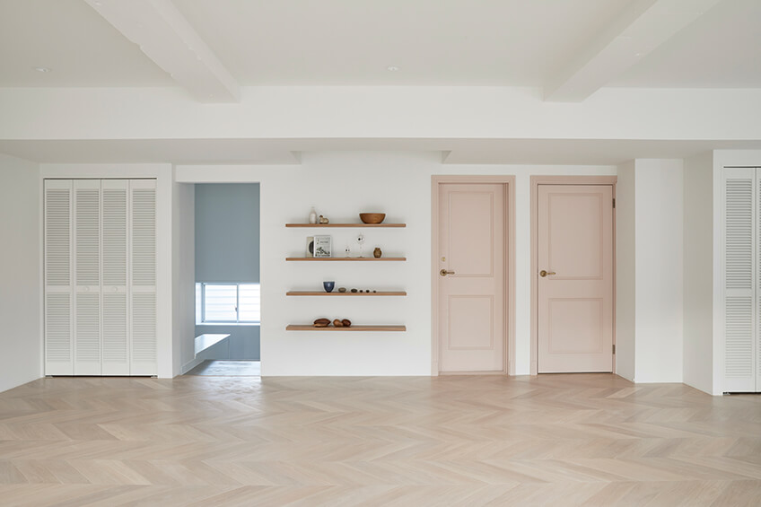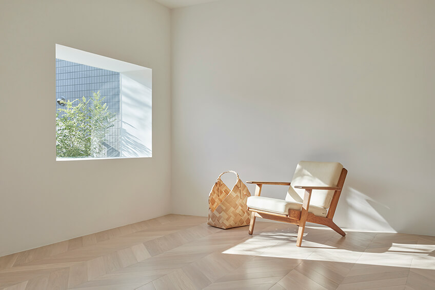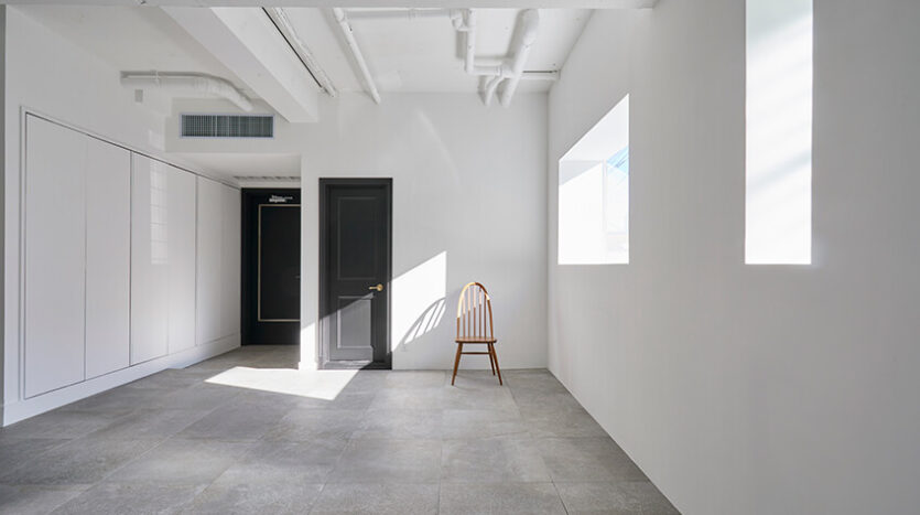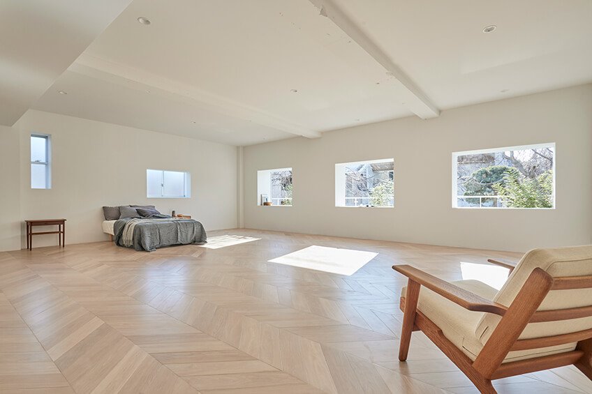 2階は、淡いカラーのヘリンボーン貼りのフローリングと白壁、奥行のある窓や据付棚はブツ撮りに利用できます。